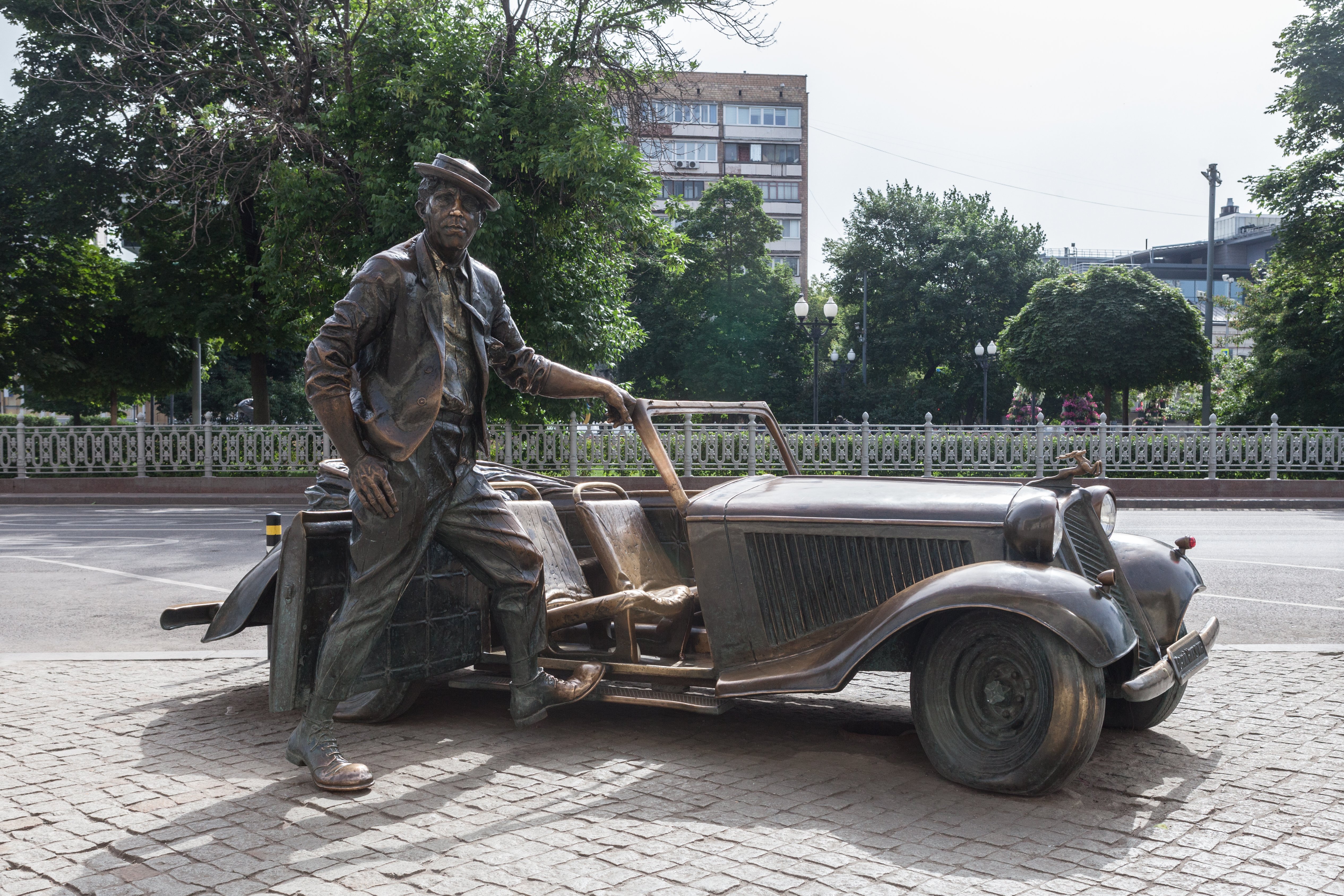 Композиция изображает Никулина выходящим из кабриолета, знакомого многим по кинокомедии «Кавказская пленница». На артисте клоунский пиджачок и соответствующая обувь, на шее повязан галстук, а на голове шляпа канотье. Сам автомобиль выполнен в уменьшенном масштабе. Вместо номерного знака размещена табличка: «Юрий Никулин».
