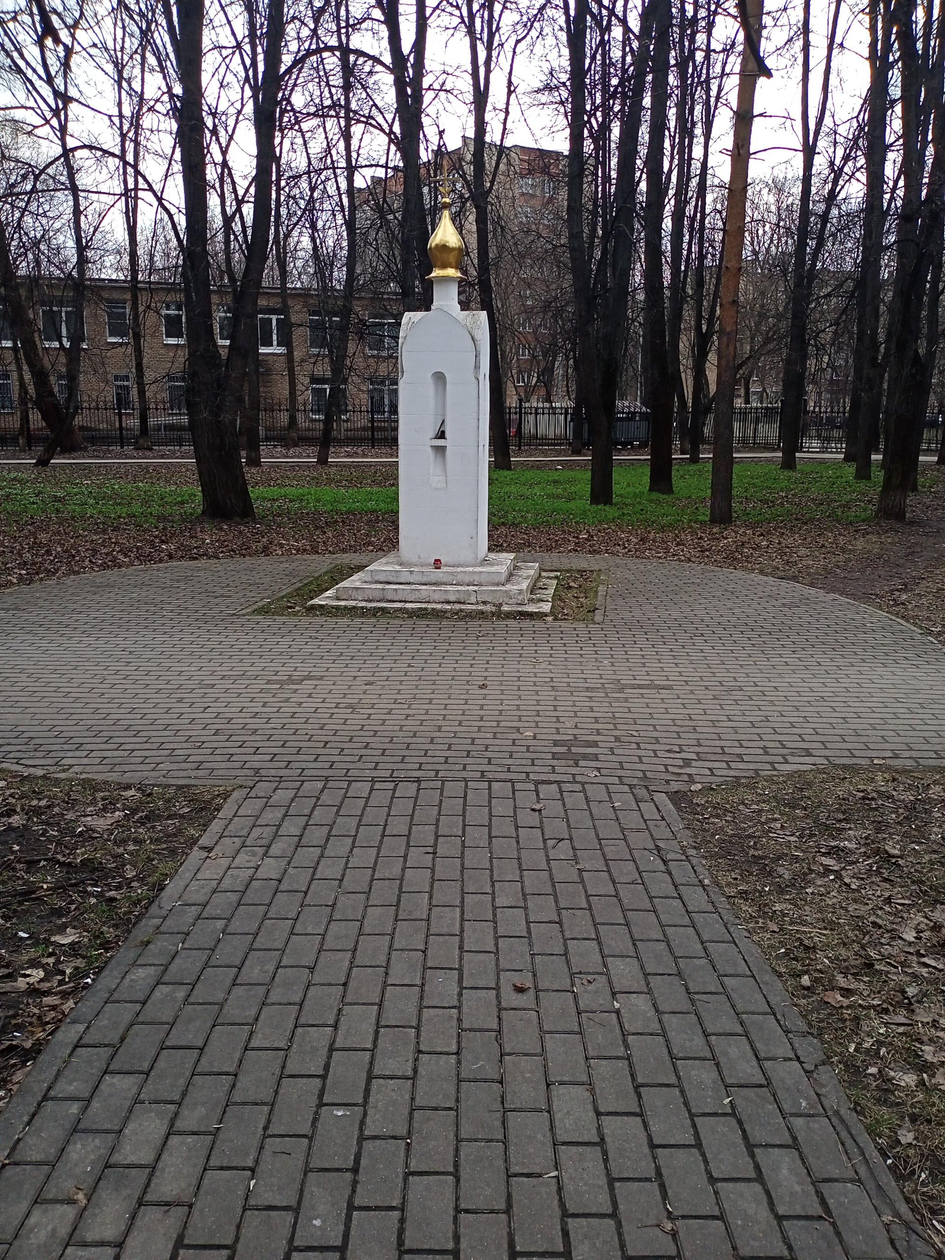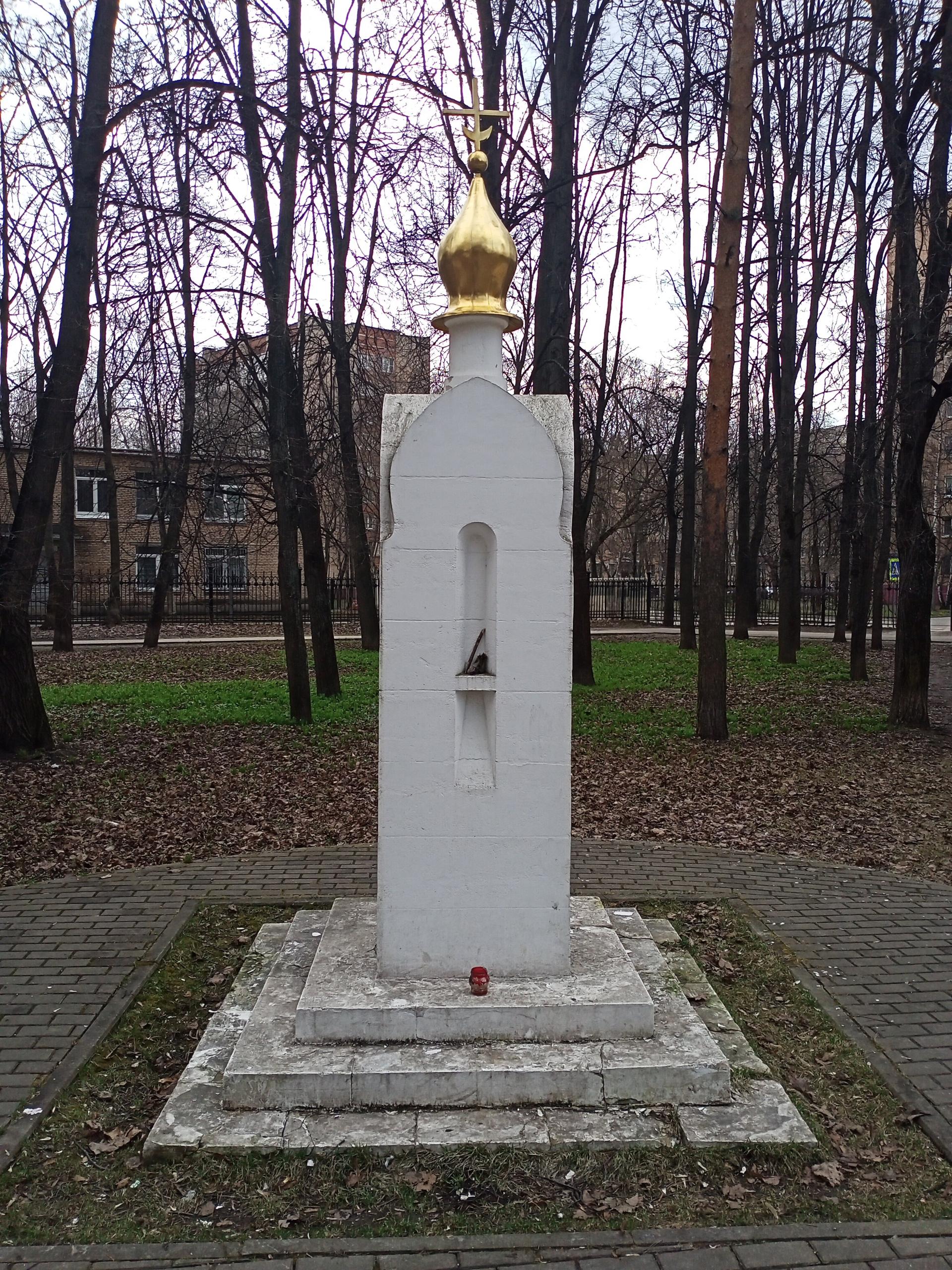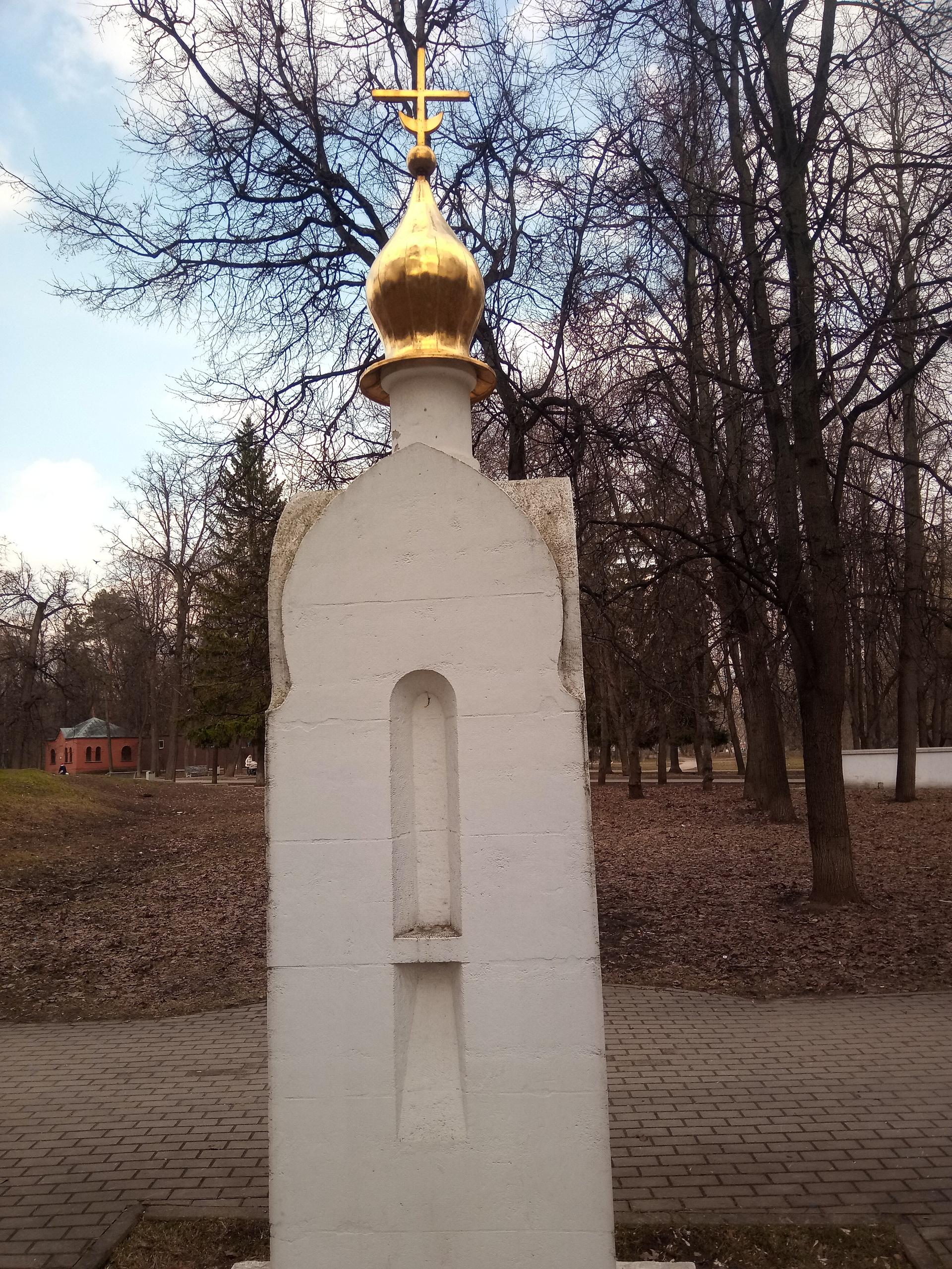 Часовенный столб расположен к югу от часовни Спаса Преображения Мемориально-паркового комплекса героев Первой мировой войны. На верхушке столба церковная главка золотистого цвета. На ней — крест с полумесяцем.
