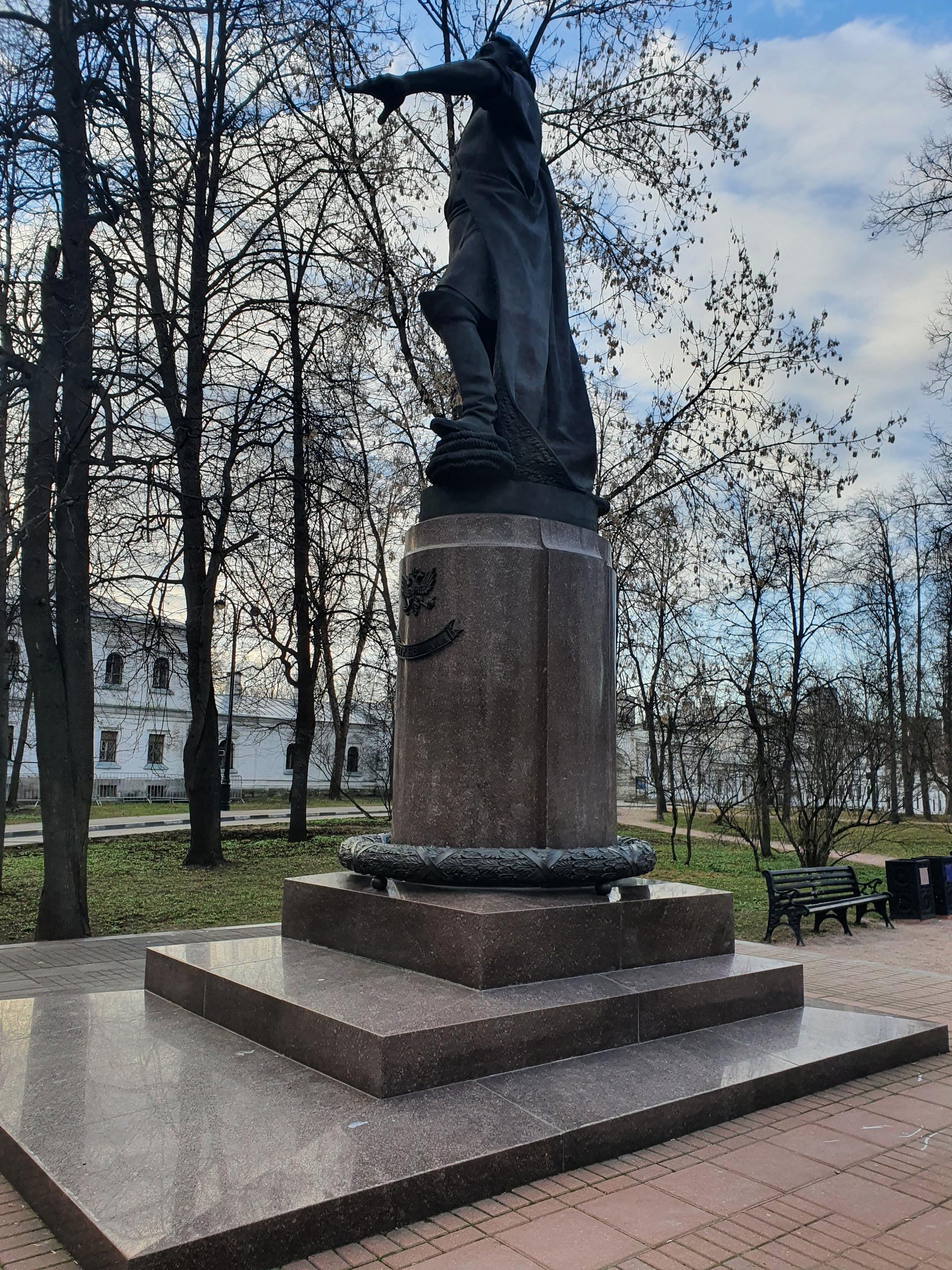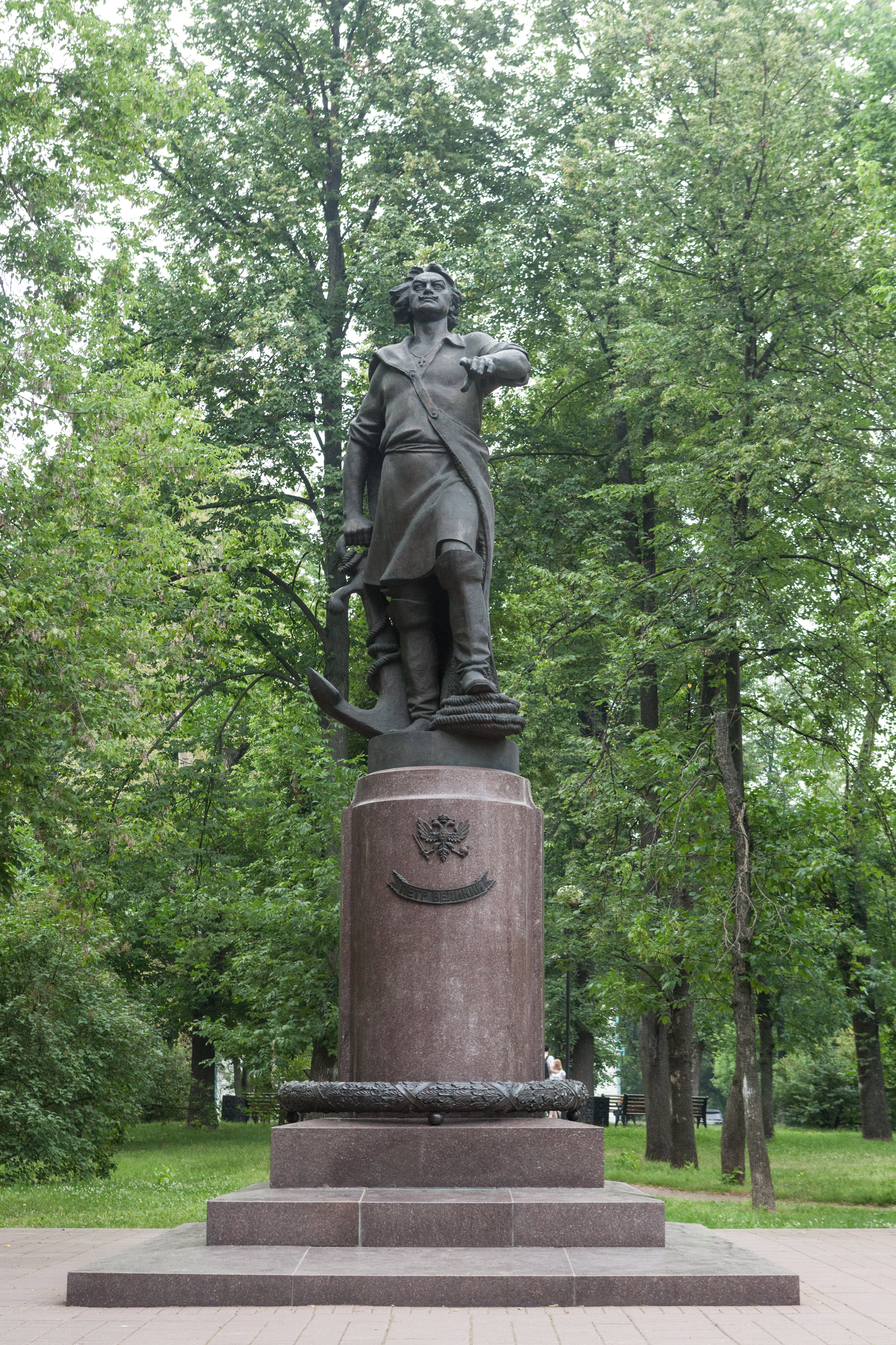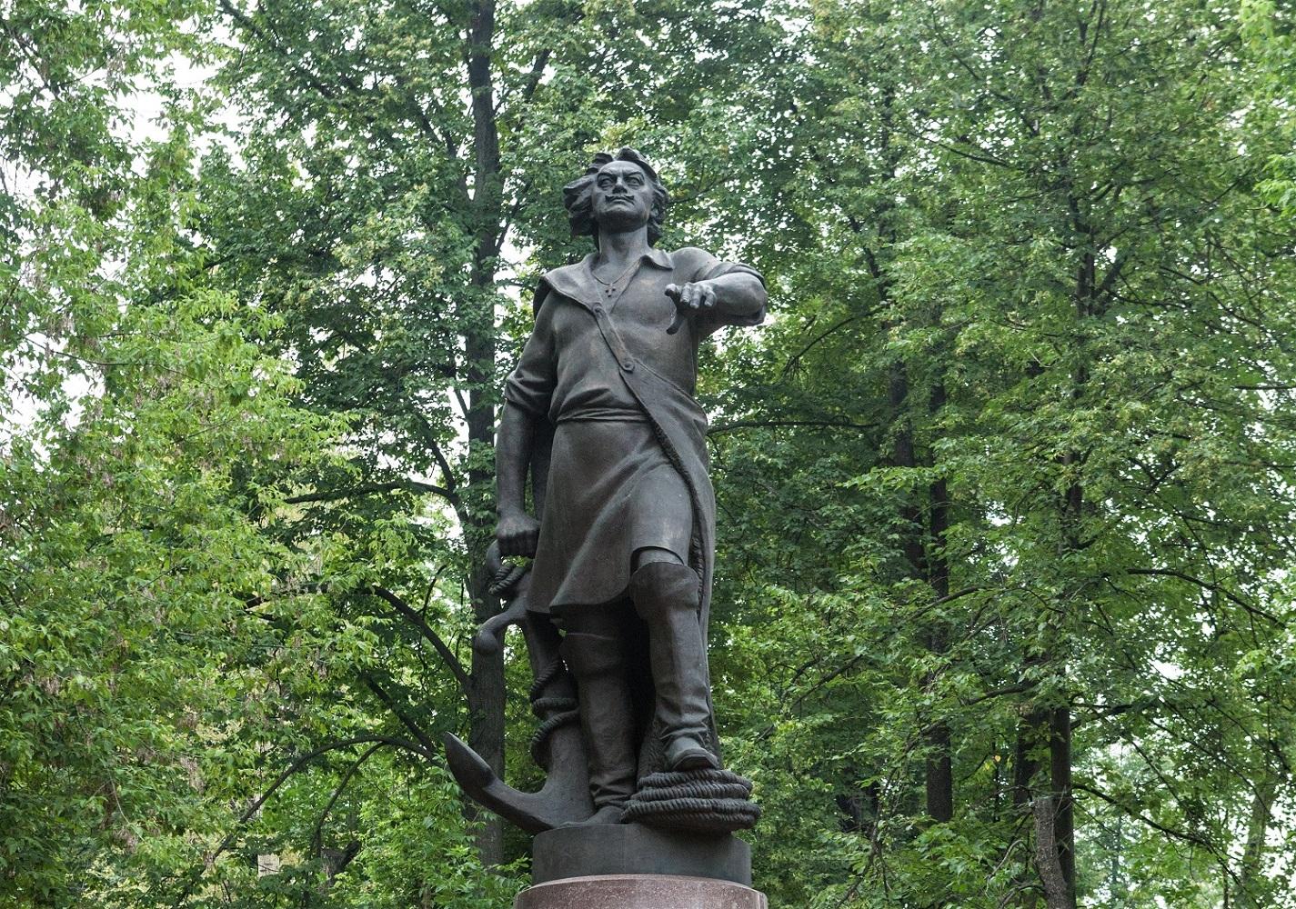 Памятник представляет собой бронзовую фигуру царя-реформатора в рабочей одежде, с простертой вперед левой рукой, опирающегося правой рукой на якорь. Скульптура установлена на цилиндрическом гранитном постаменте. На его фасаде бронзовый двуглавый орел — государственный герб Российской империи, под которым мемориальная табличка: «Петр Великий». Подножие постамента опоясывает перевитый лентами бронзовый венок из дубовых листьев, являющийся символом воинской отваги и храбрости.
