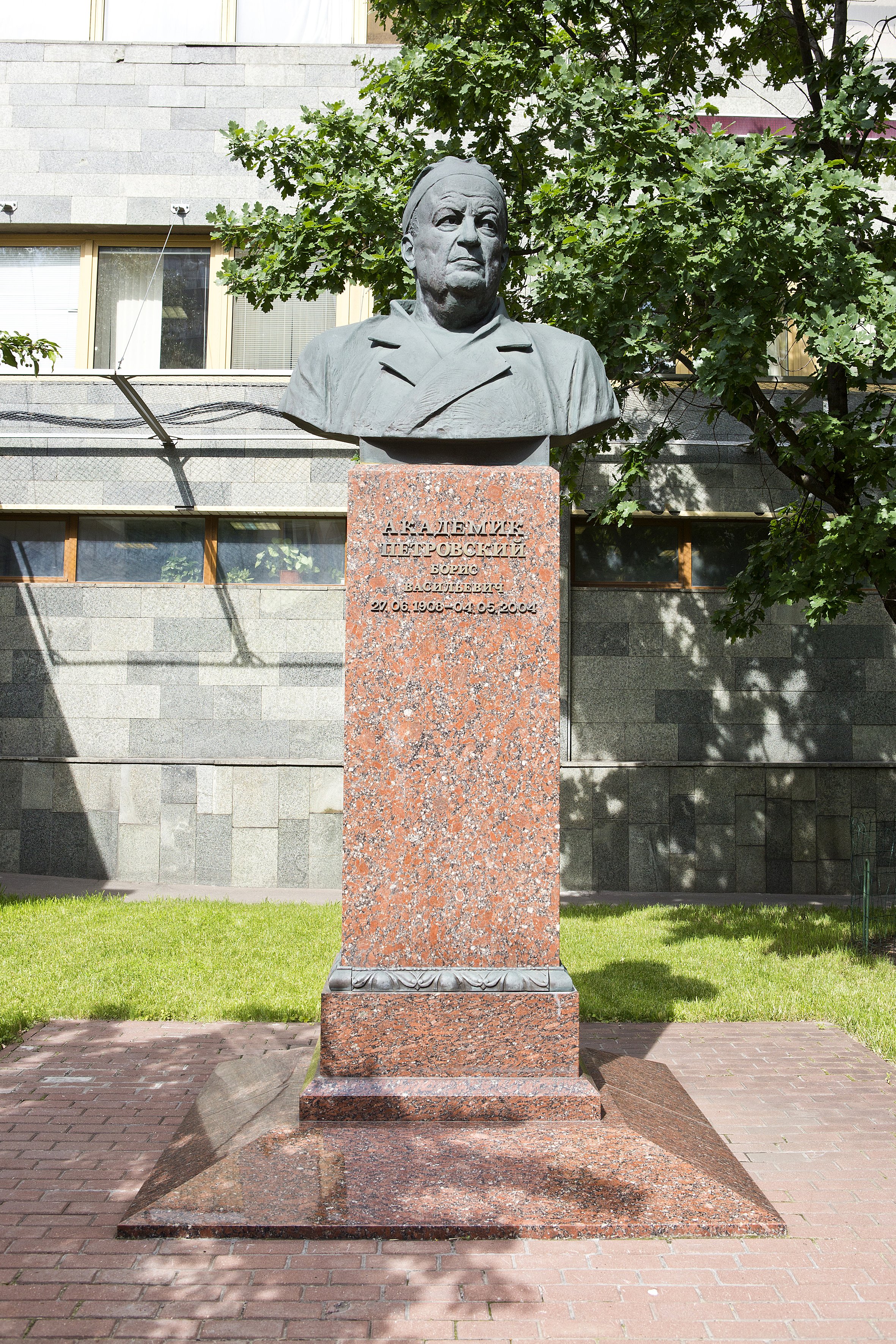 В верхней части постамента выполнена накладными бронзовыми буквами надпись: «Академик Петровский Борис Васильевич. 27.06.1908 — 04.06.2004».