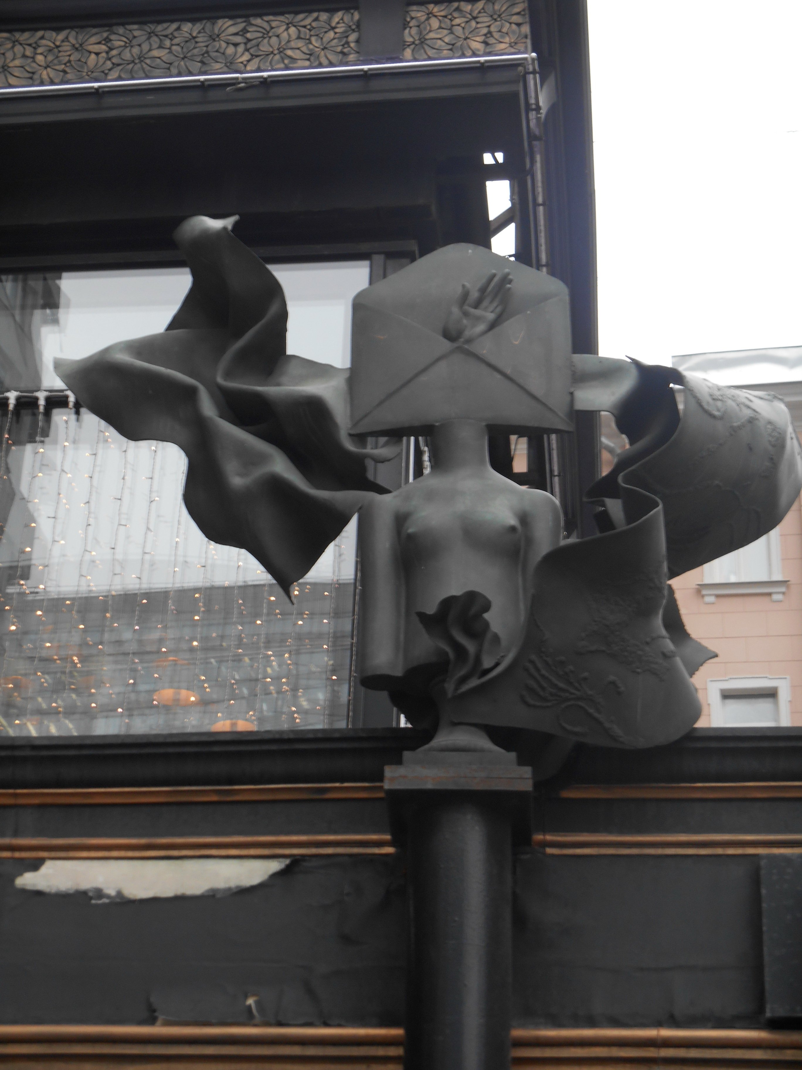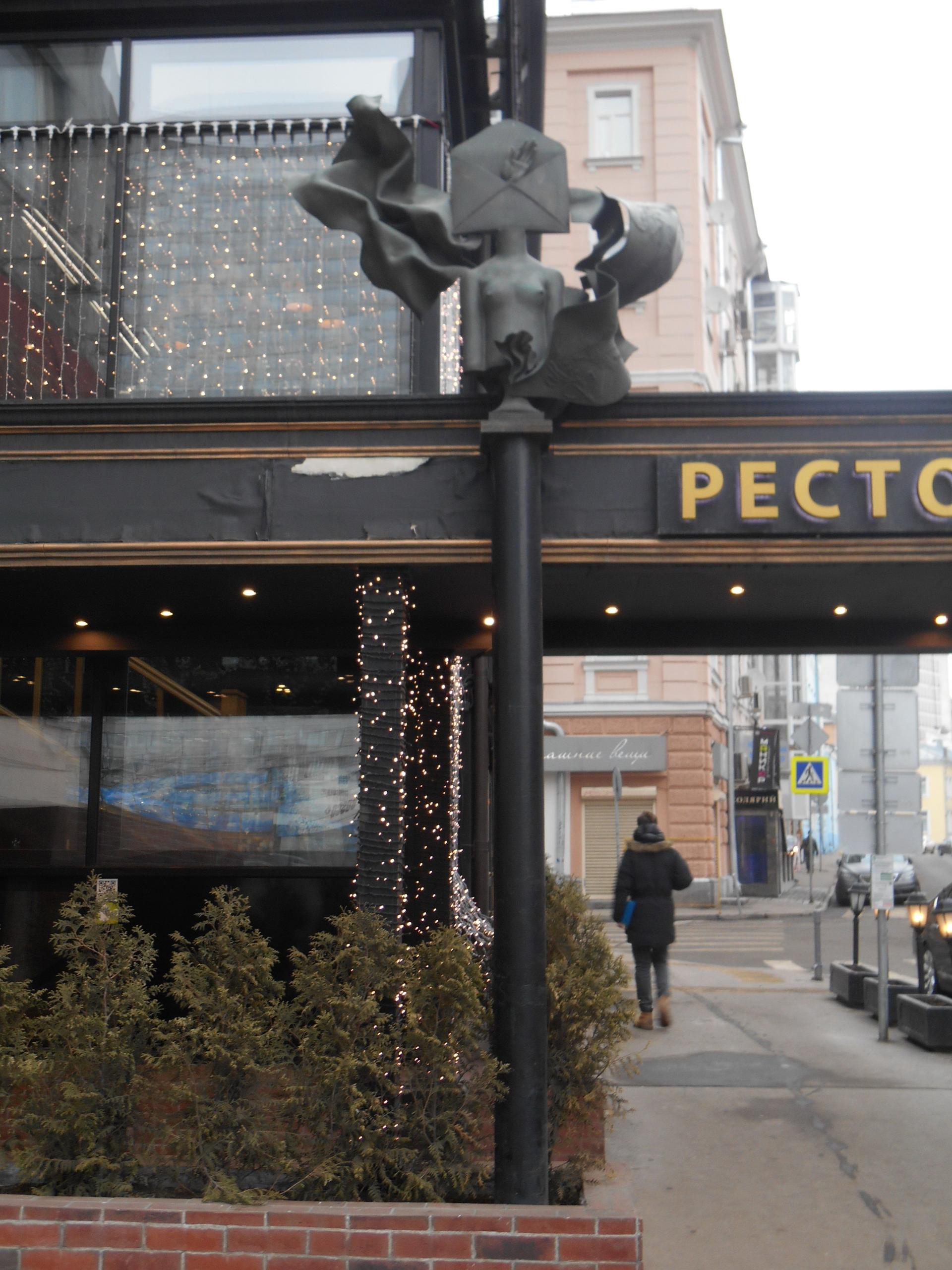 Очень странная скульптура - на высокой тонкой колонне-пьедестале женский бюст без рук и с конвертом вместо головы, из которого видна ладонь, то ли приветствующая проходящих мимо, то ли просящая что-то. Интернет-ресурсы приписывают авторство скульптору Бурганову. Более достоверной информации найти не удается.