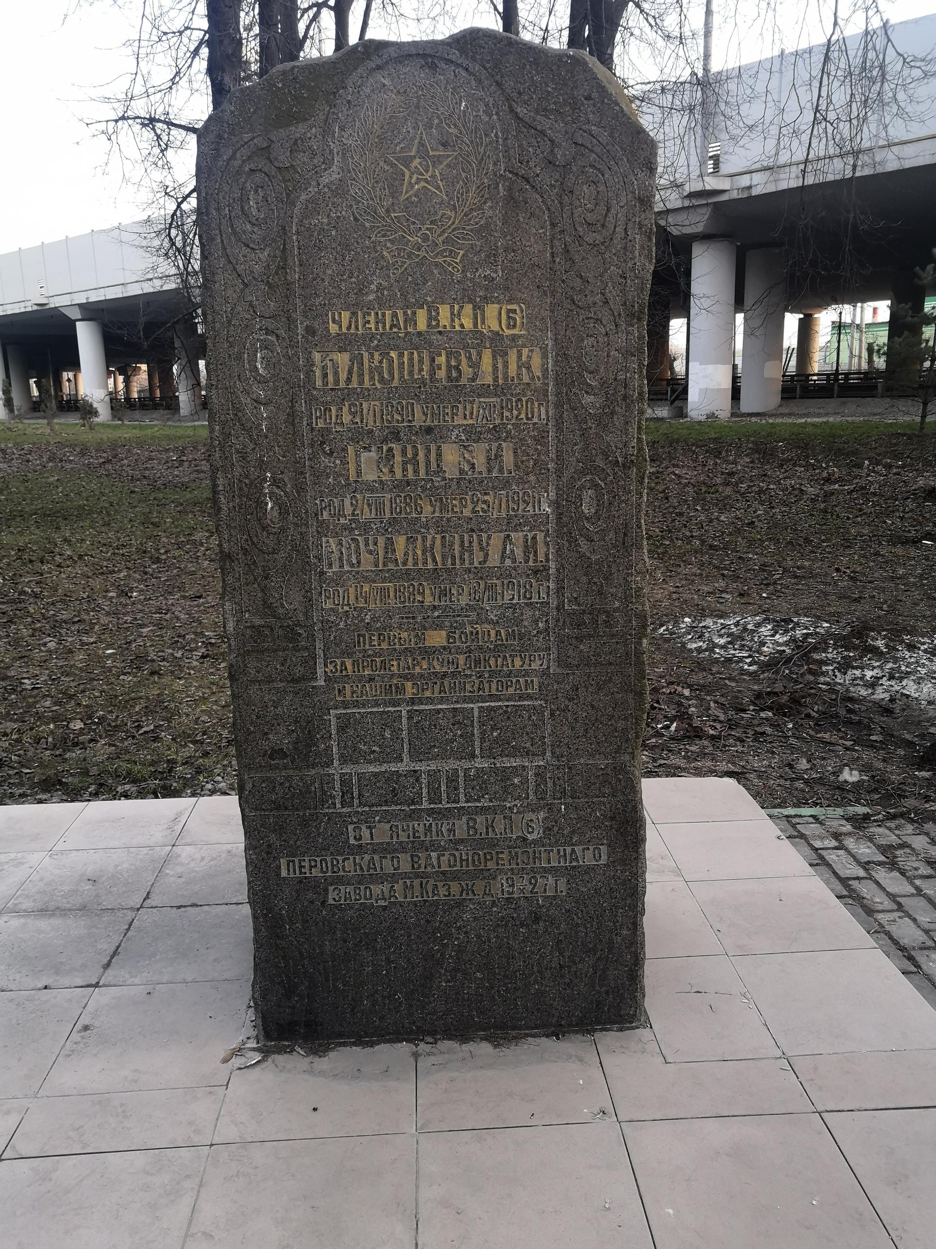 1927 г., к 10-летию Октябрьской социалистической революции, в районе Перово была установлена стела членам ВКП (б): П. К. Плющеву, В. И. Гинц и А. И. Мочалкину с надписью: «Первым бойцам за пролетарскую диктатуру и нашим организаторам». Памятник установлен ячейкой ВКП (б) Перовского вагоноремонтного завода М.Каз.ж.д.