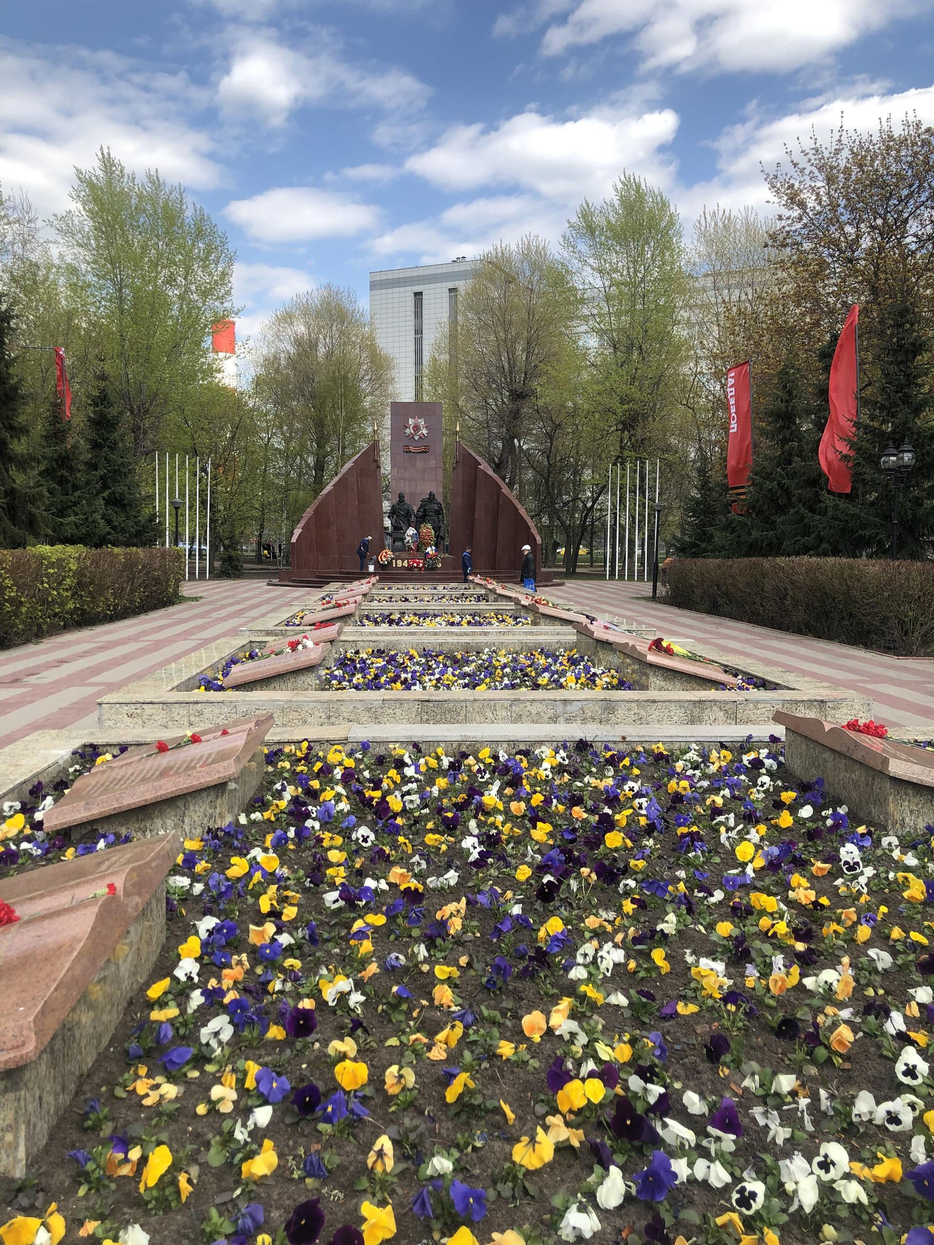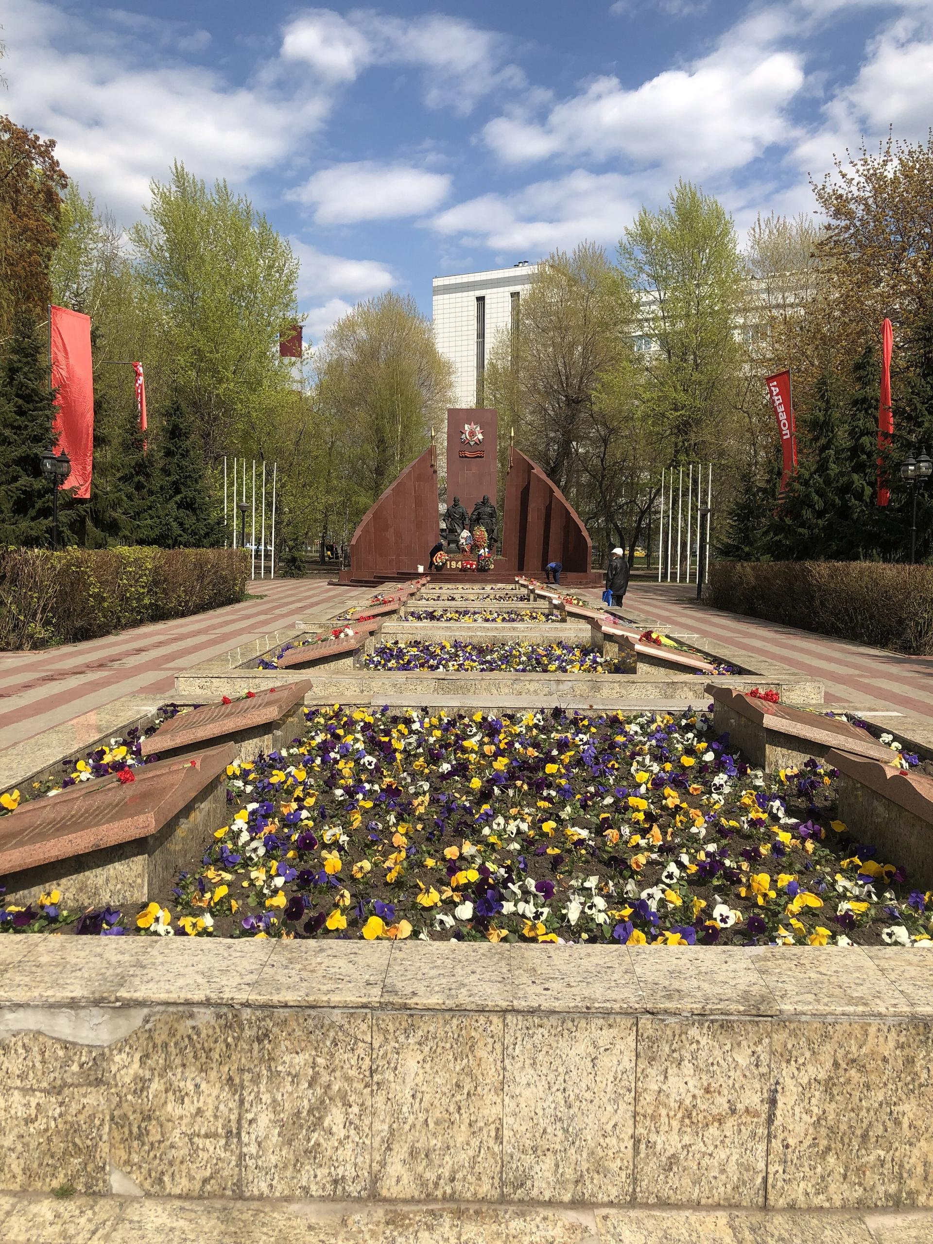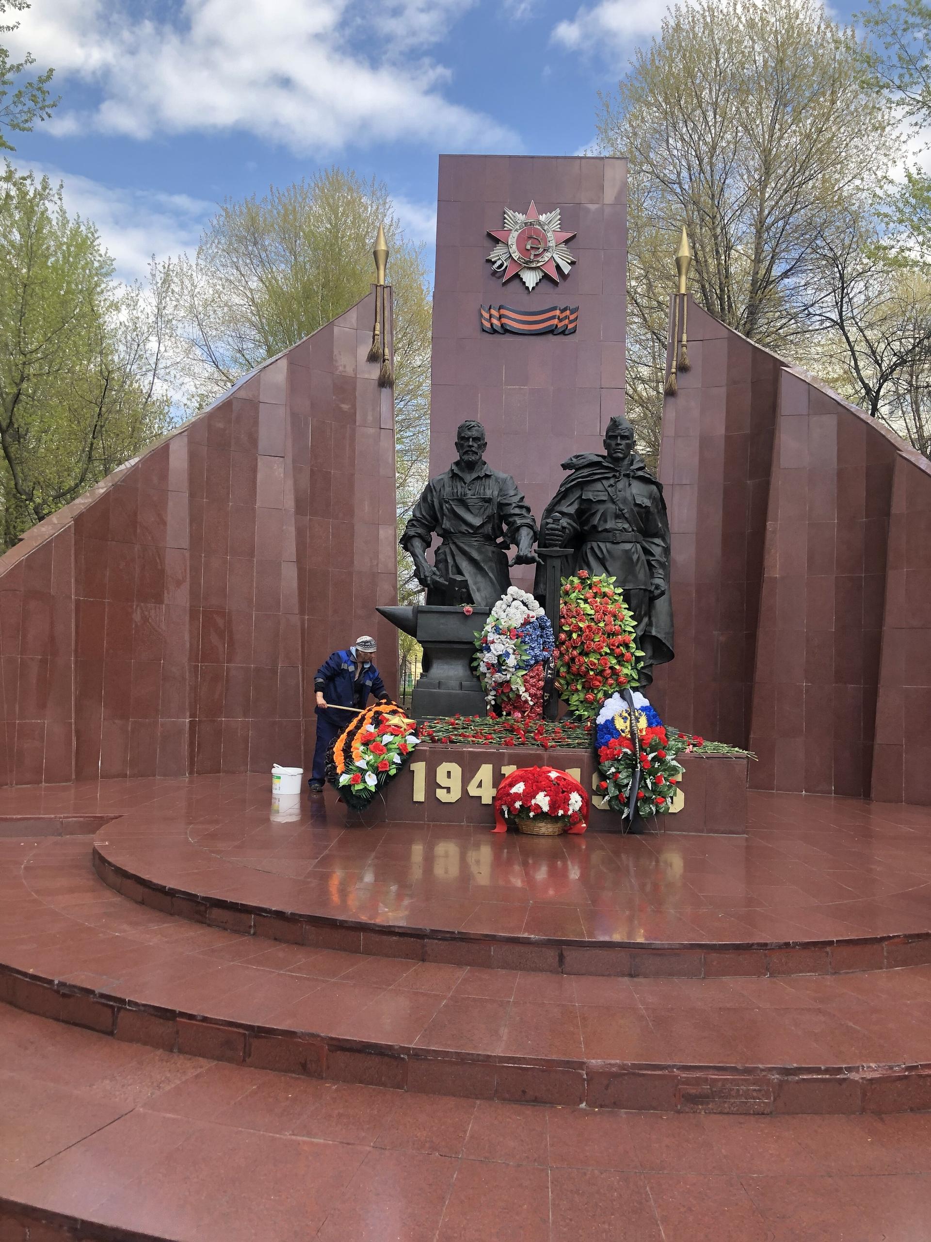 К востоку от скульптуры размещены три стелы, облицованные полированным гранитом, являющиеся своеобразным «фоном» для фигур солдата и рабочего. На лицевой стороне центральной стелы расположено изображение ордена Отечественной войны I степени, под ним — георгиевская лента.