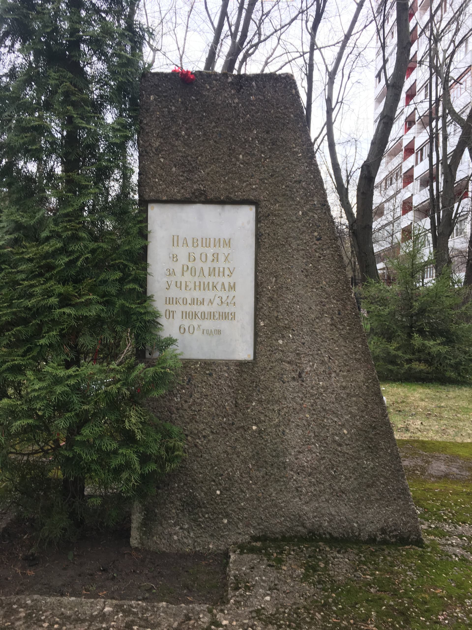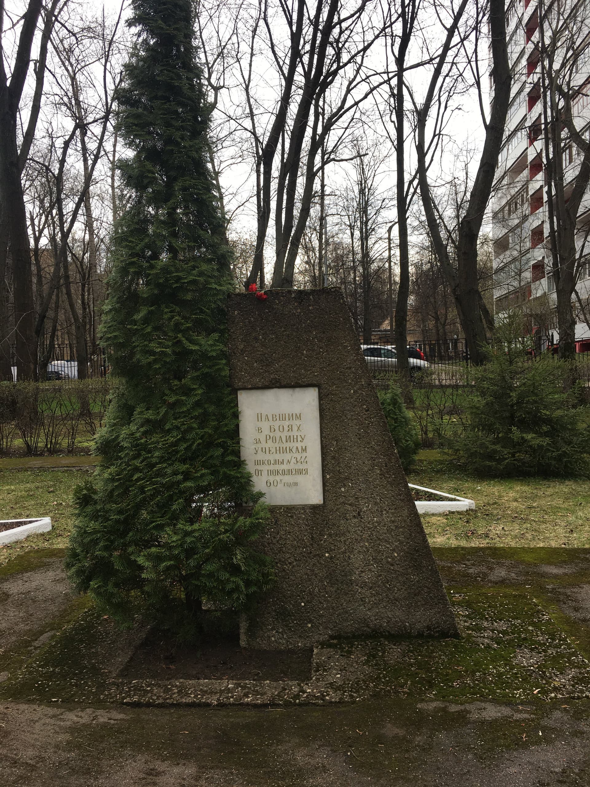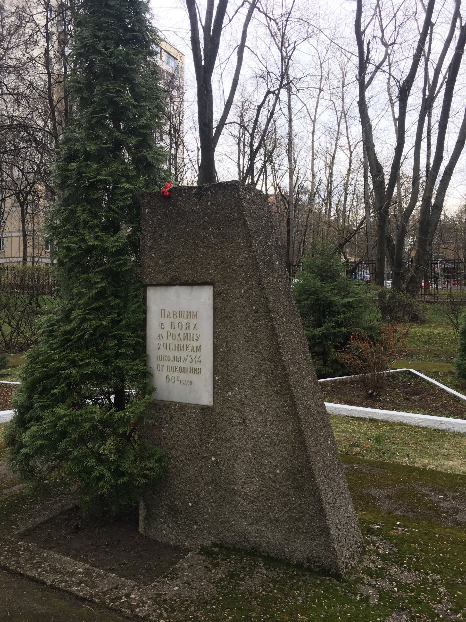 Памятник представляет собой трапециевидную стелу из бетона, рядом с которой растет живой кипарис (как символ вечной жизни). На стеле закреплены двух сторон по одной мраморной доске. На лицевой стороне текст: «Павшим в боях за Родину ученикам школы № 344 от поколения 60-х гг.». На противоположной стороне стелы: «Памяти павших будьте достойны». Ремонтные работы на объекте проводились в 2015 г.