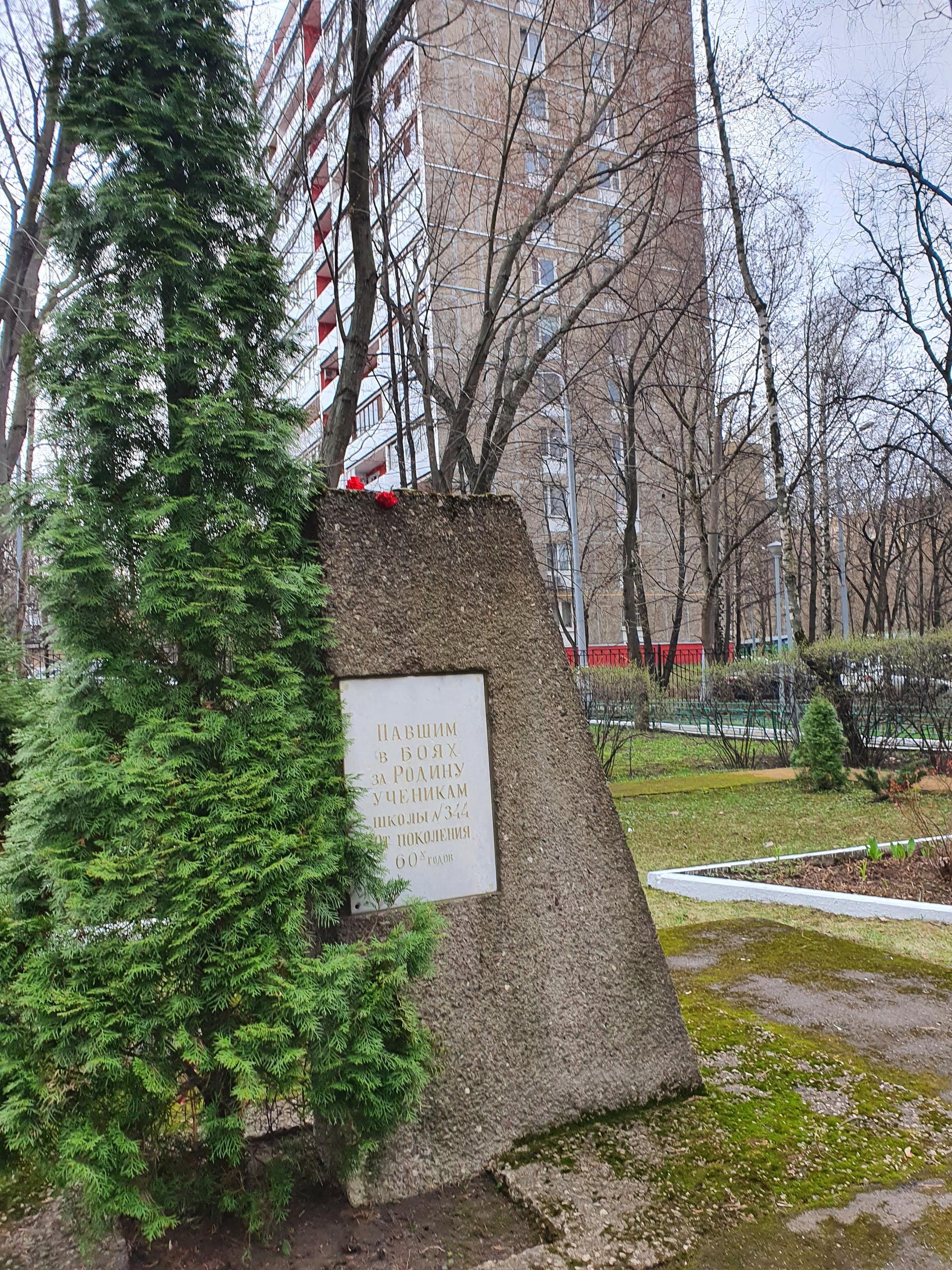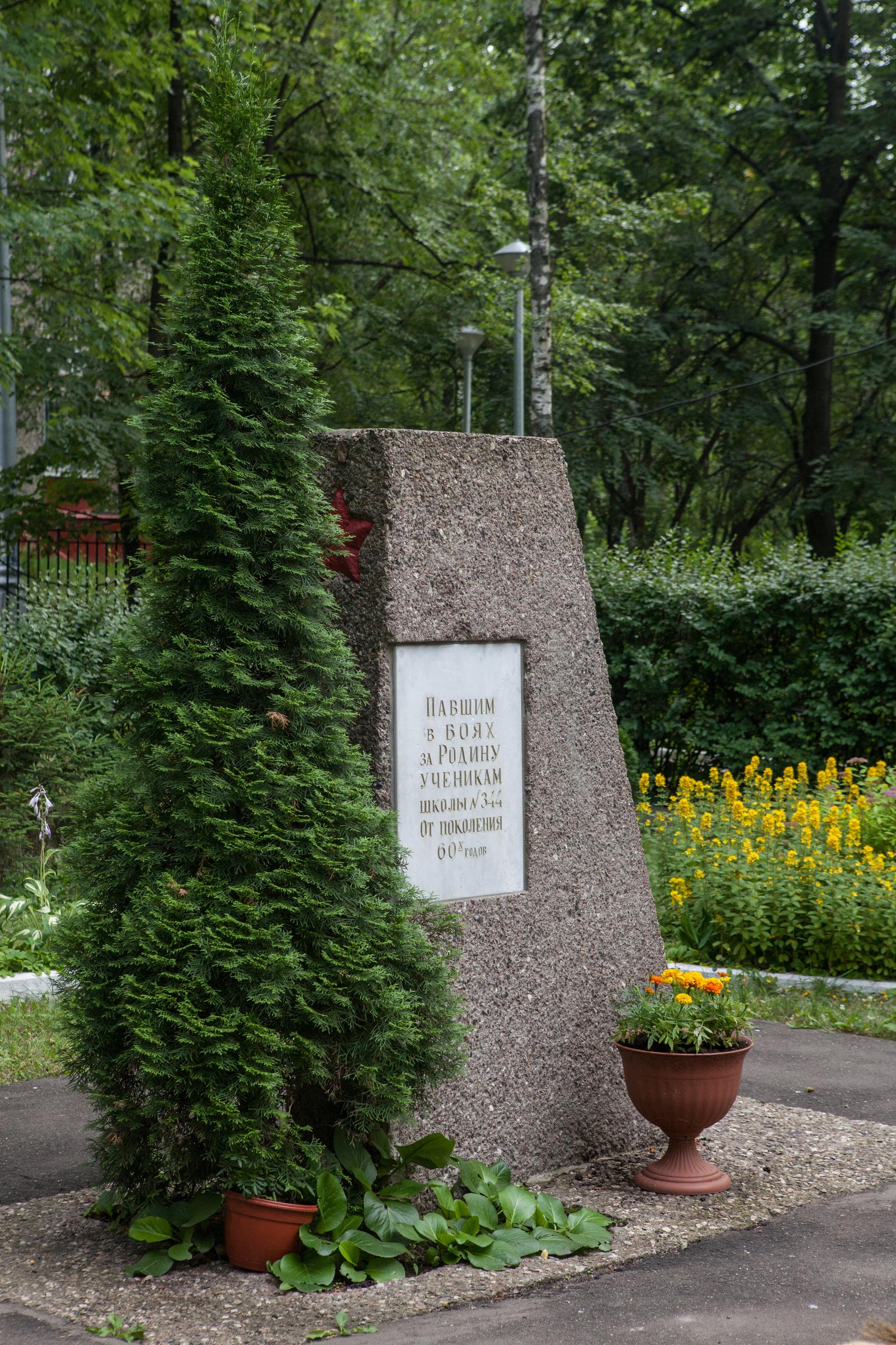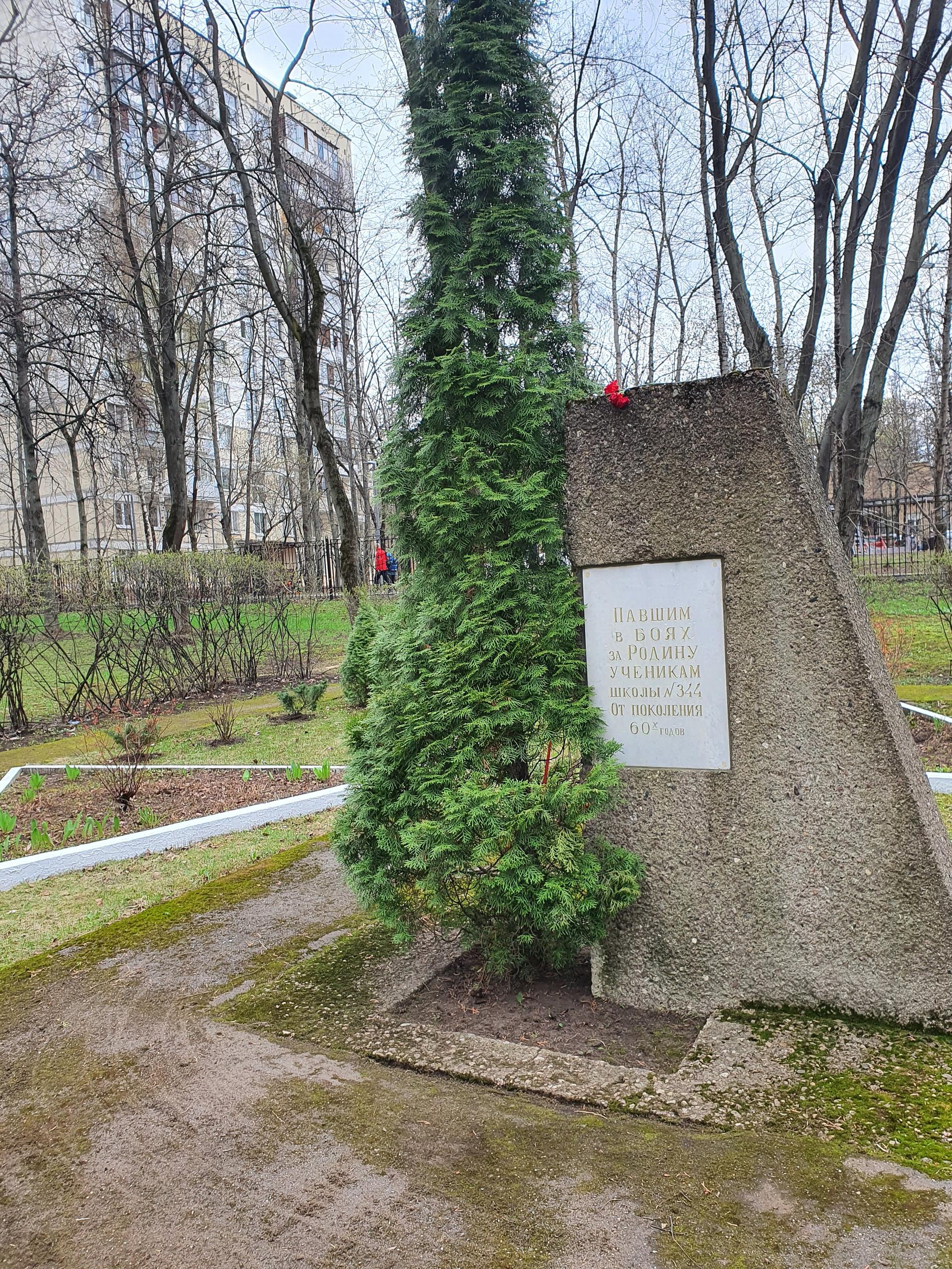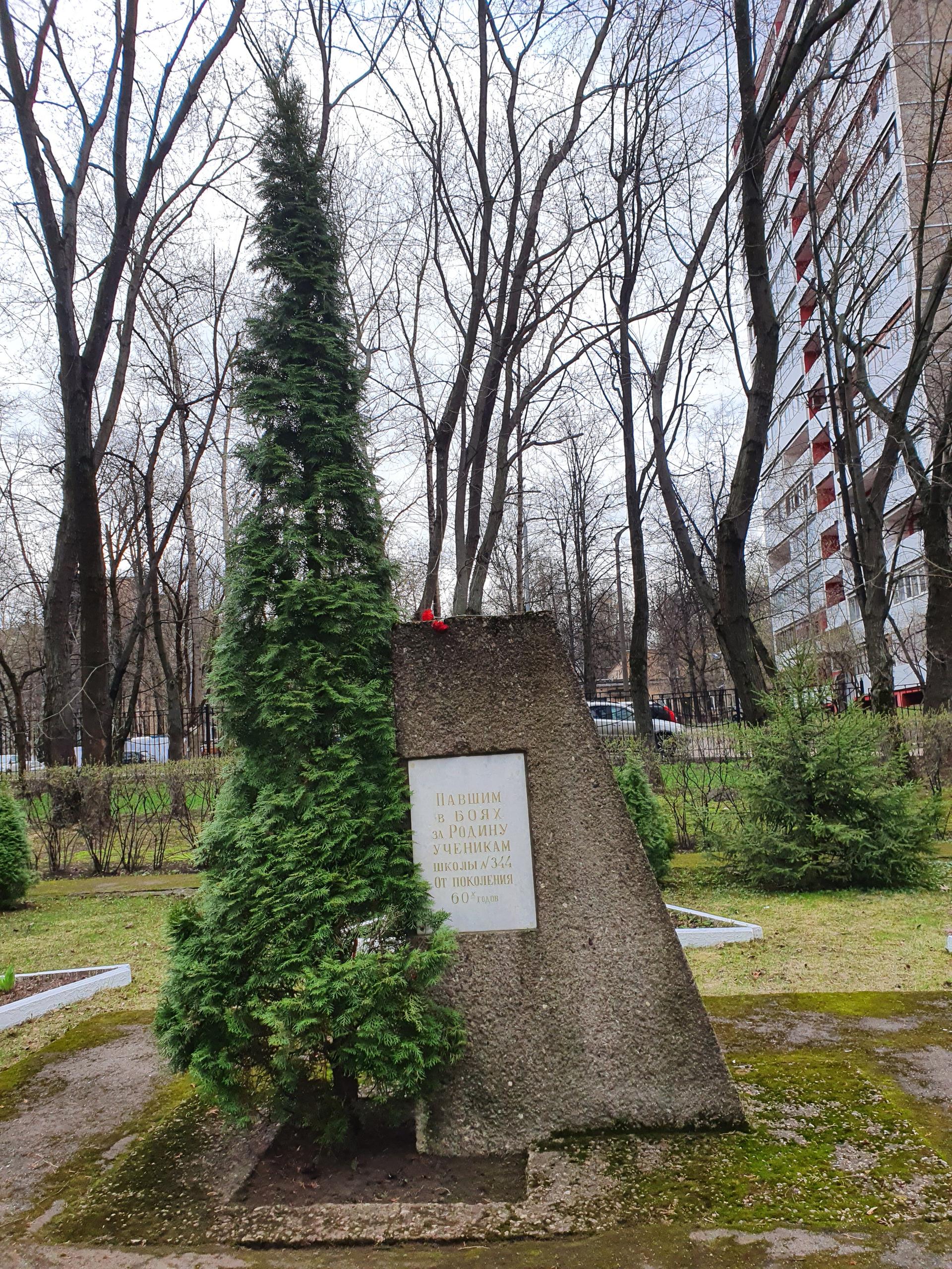 Памятник представляет собой трапециевидную стелу из бетона, рядом с которой растет живой кипарис (как символ вечной жизни). На стеле закреплены двух сторон по одной мраморной доске. На лицевой стороне текст: «Павшим в боях за Родину ученикам школы № 344 от поколения 60-х гг.». На противоположной стороне стелы: «Памяти павших будьте достойны». Ремонтные работы на объекте проводились в 2015 г.