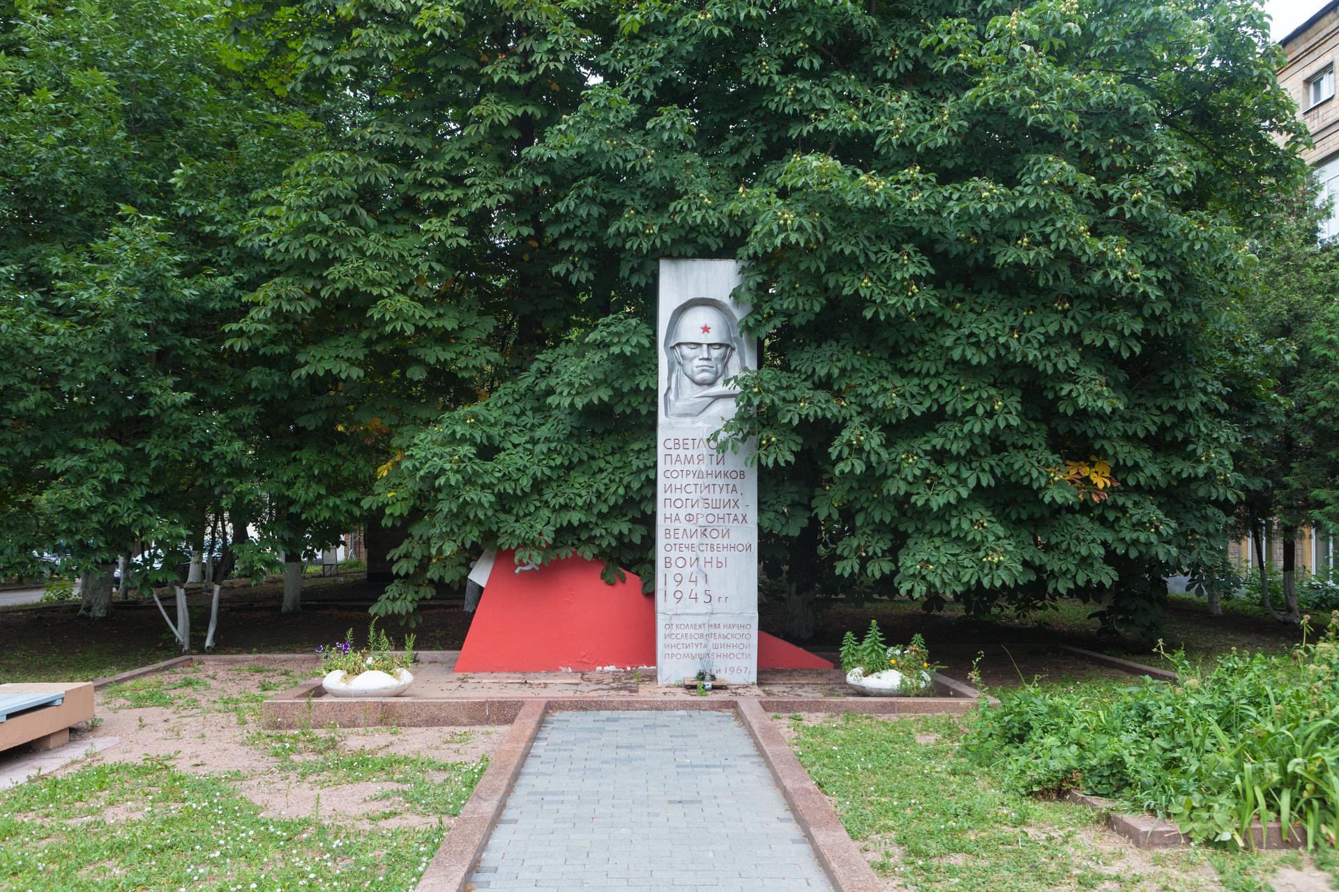 Памятник представляет собой композицию из высокой бетонной стелы и треугольной формы плиты позади нее. Стела окрашена в белый цвет, в верхней части помещен барельеф — изображение солдата в каске с красной звездой. Ниже расположена памятная надпись, выполненная прорезными буквами: «Светлой памяти сотрудников института, погибших на фронтах Великой Отечественной войны 1941-1945 гг., от коллектива Научно-исследовательского института шинной промышленности. Май 1967 г.».