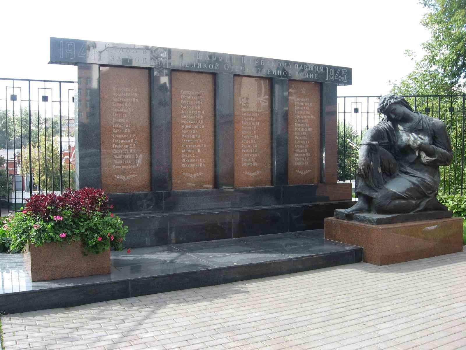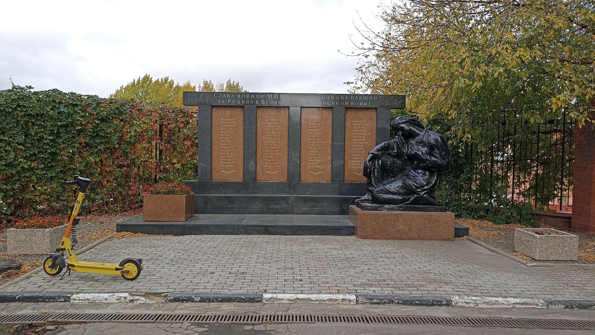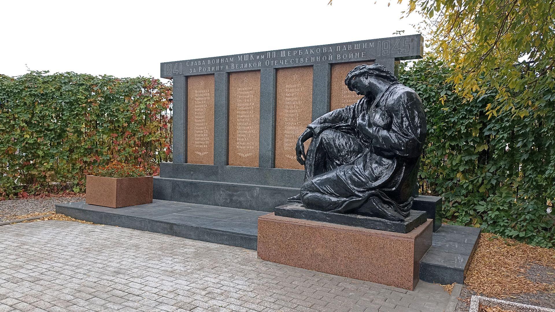 Памятник представляет собой мемориальный комплекс, который состоит из скульптуры и мемориальной стены. Мемориальная стена выполнена из полированного гранита и имеет посвятительную надпись: «Слава воинам МШК им. П. Щербакова, павшим за Родину в Великой Отечественной войне». Скульптура представляет собой бронзовую фигуру скорбящей женщины, размещенную на гранитном постаменте.