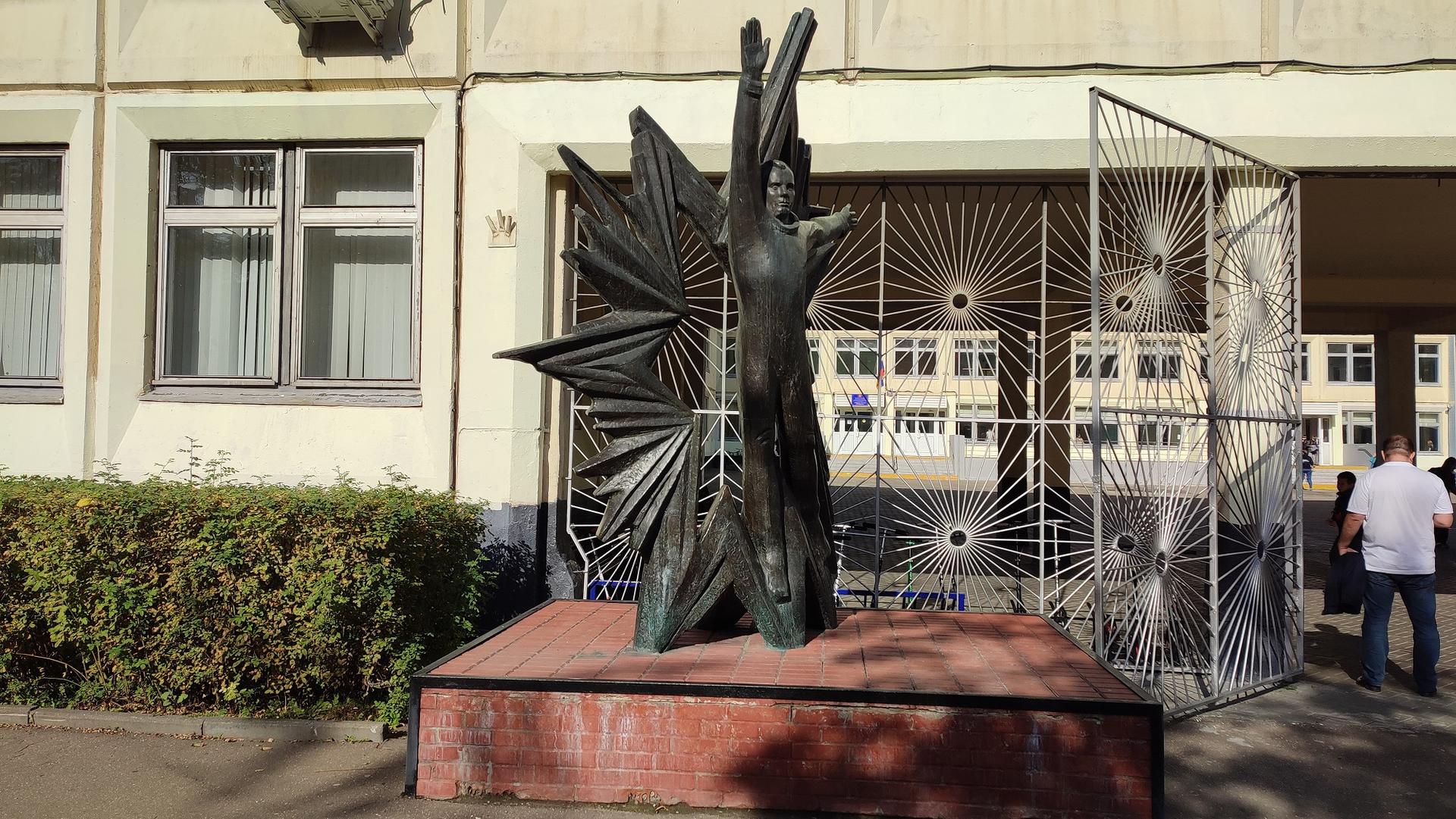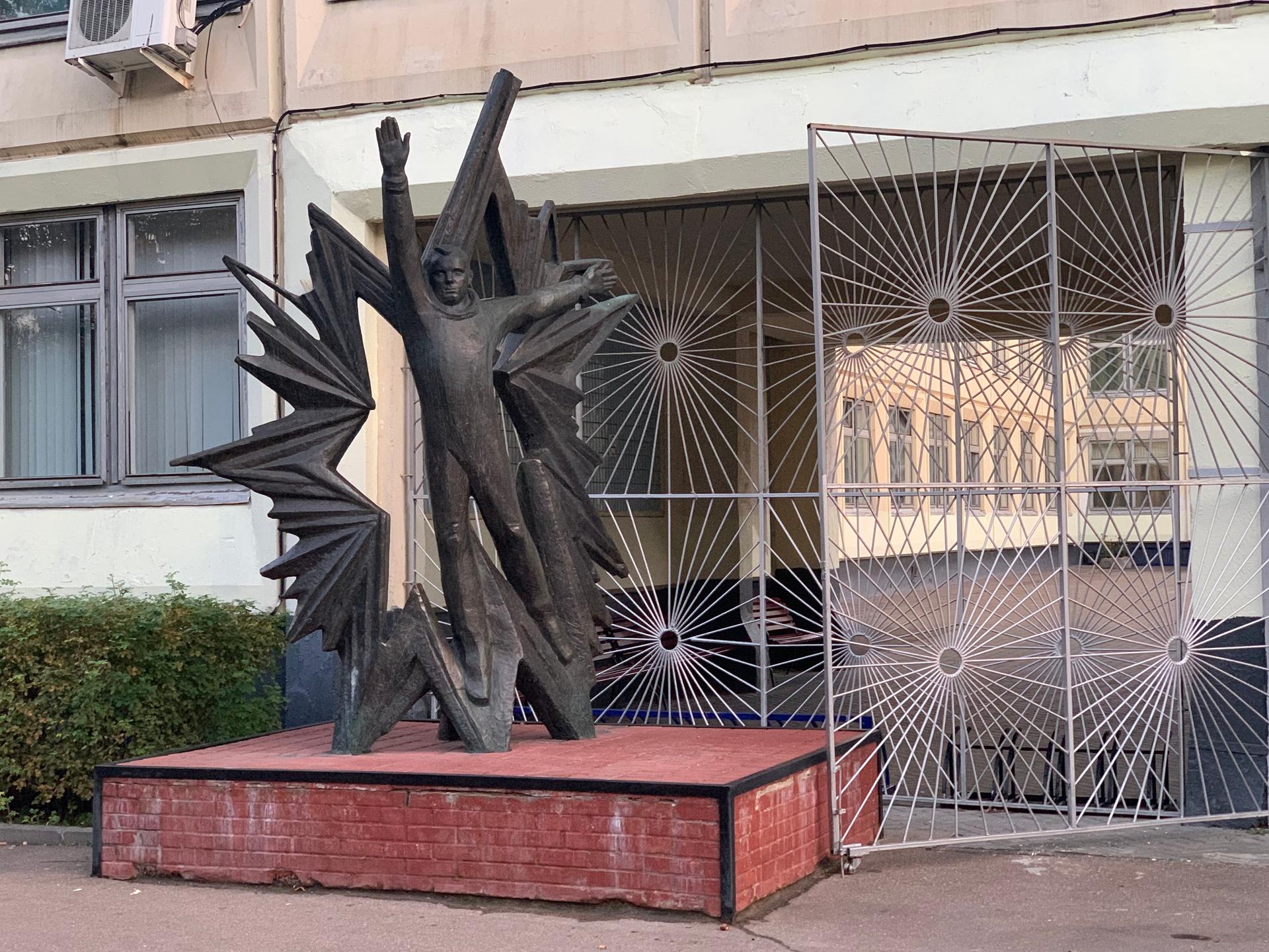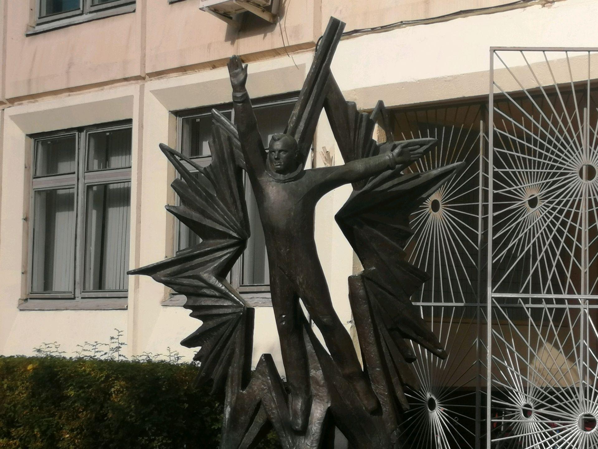 Памятник представляет собой фигуру космонавта Ю. А. Гагарина, словно парящего, широко раскинув руки, на фоне сияния огромной звезды. Скульптурная композиция установлена на основании полуметровой высоты. Основание выполнено из красного кирпича и облицовано сверху декоративной терракотовой плиткой.
