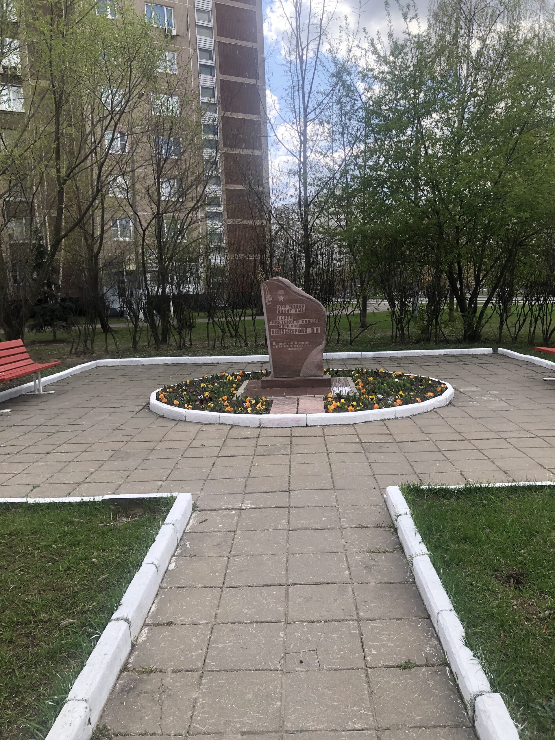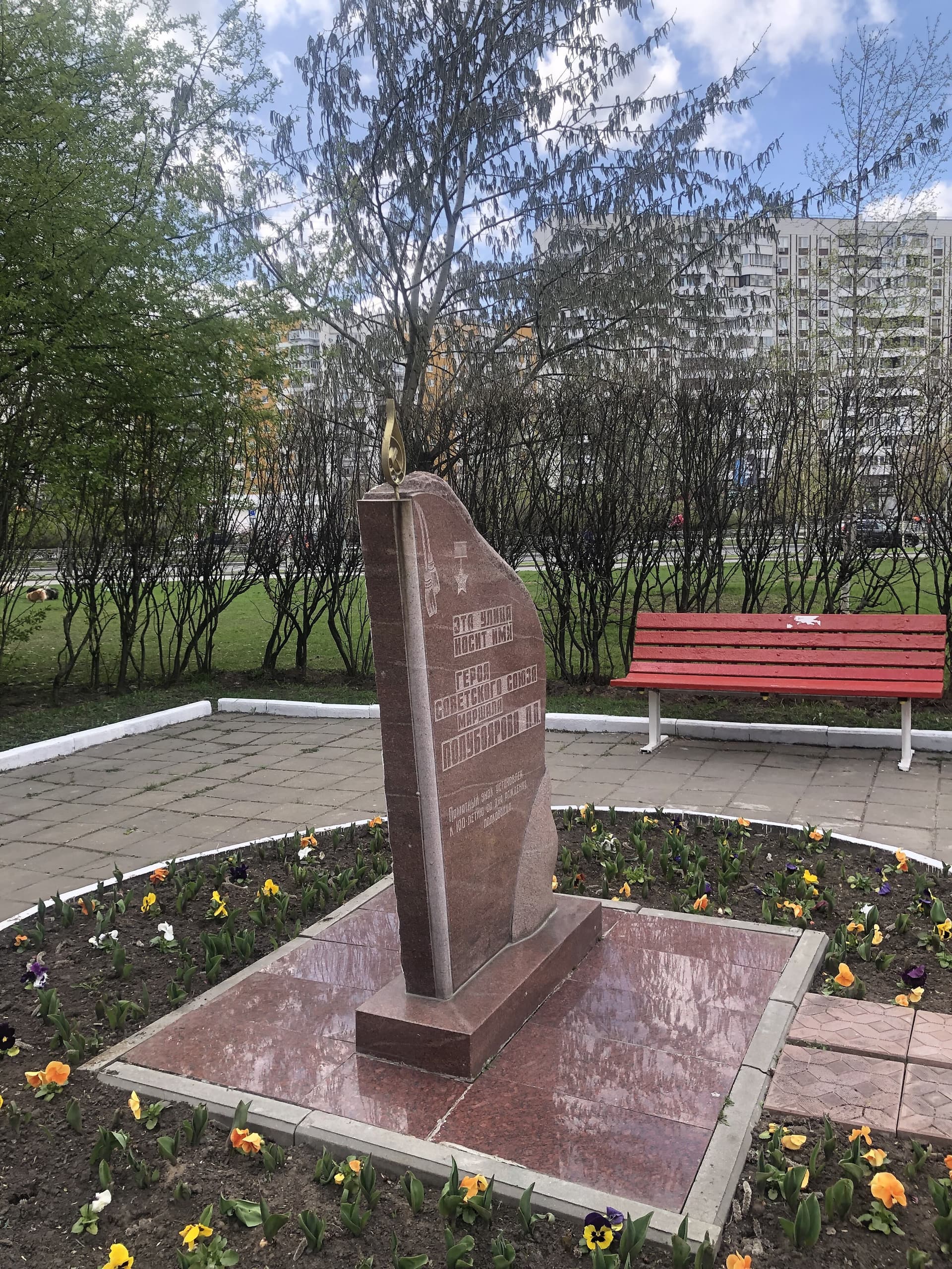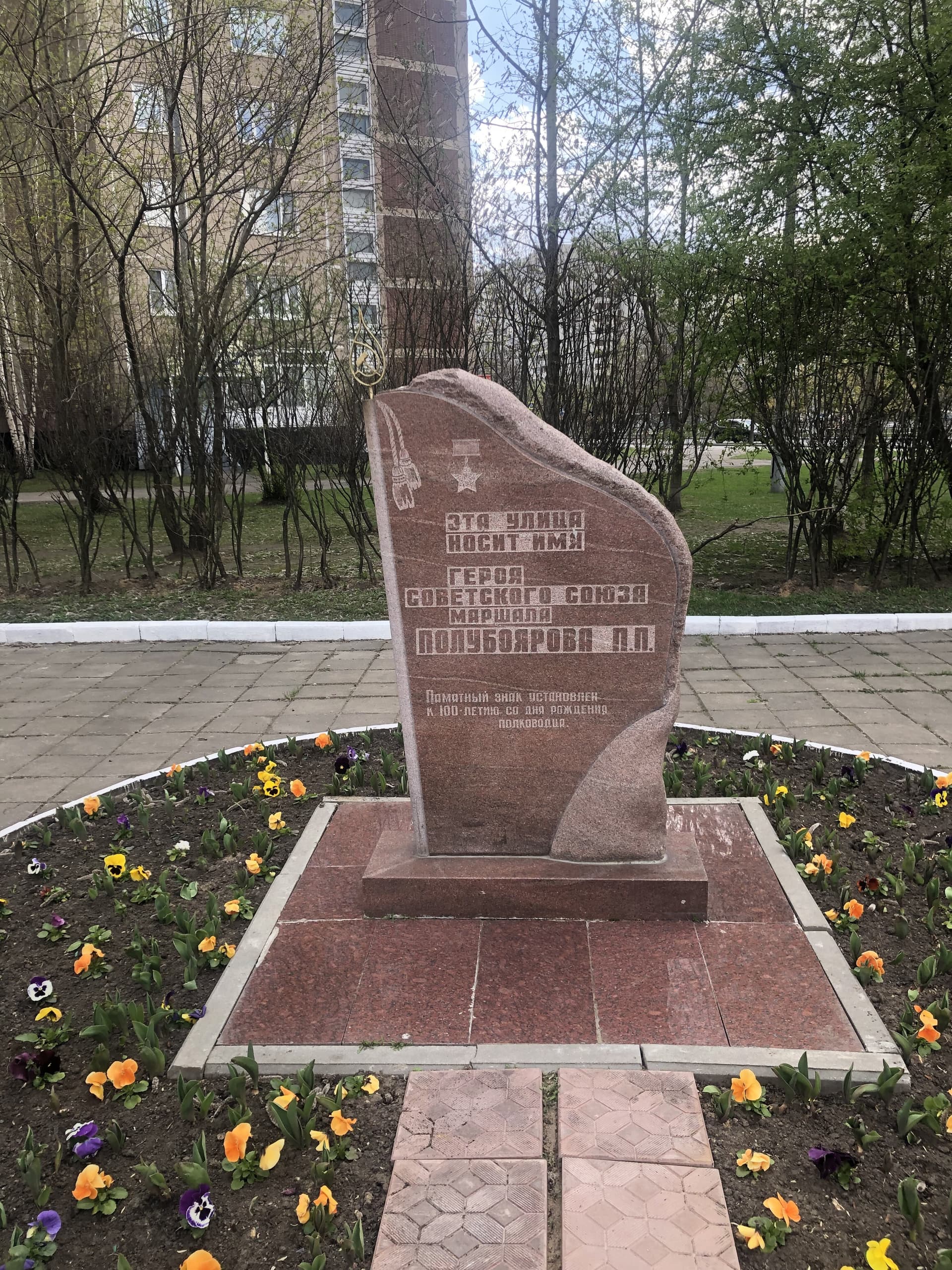 Памятный знак представляет собой цельный гранитный блок сложной конфигурации, установленный на основание из полированного гранита. Гранитный блок выполнен в виде знамени, древко вырезано на фасаде блока, вверху изображены две кисти, навершие выполнено из латуни с геральдической советской символикой (серп и молот). На лицевой стороне надпись: «Эта улица носит имя Героя Советского Союза маршала Полубоярова П. П. Памятный знак установлен к 100-летию со дня рождения полководца».