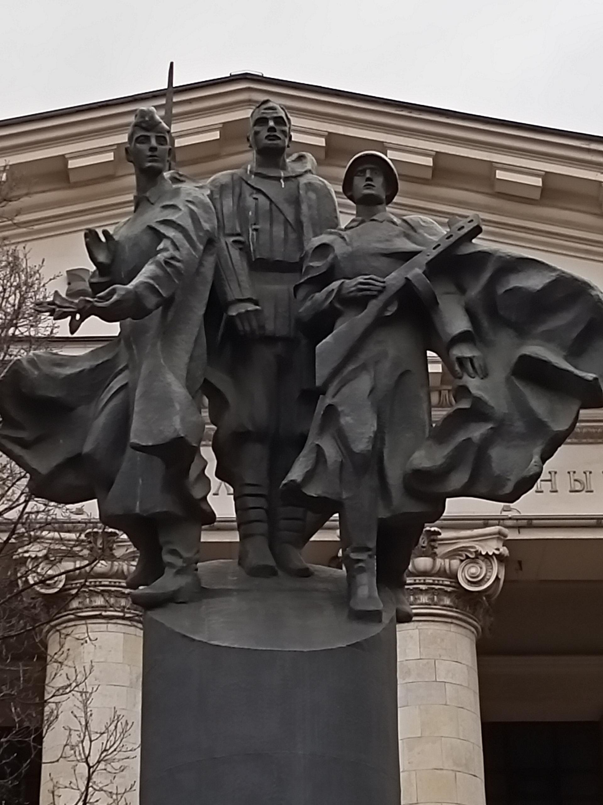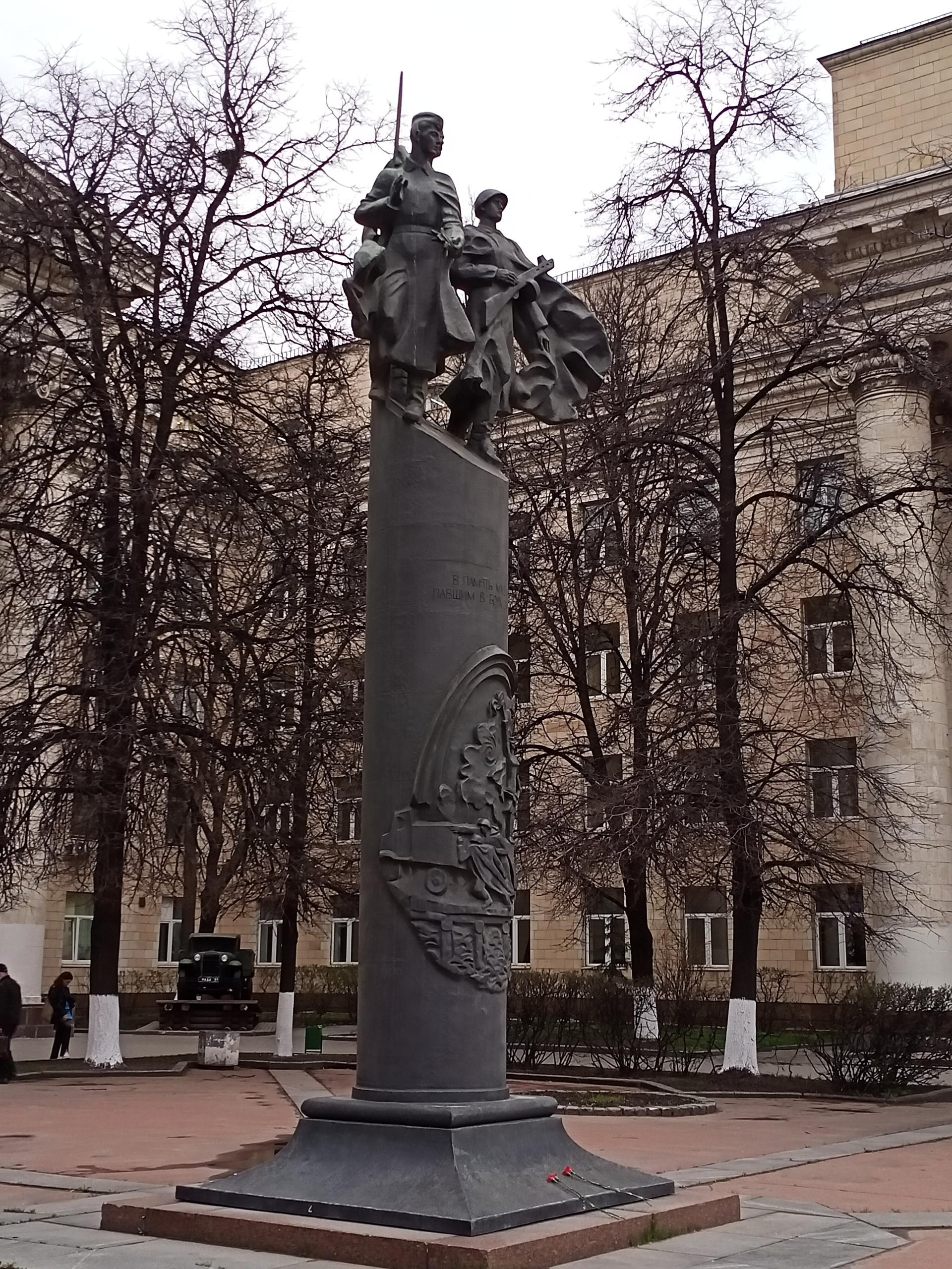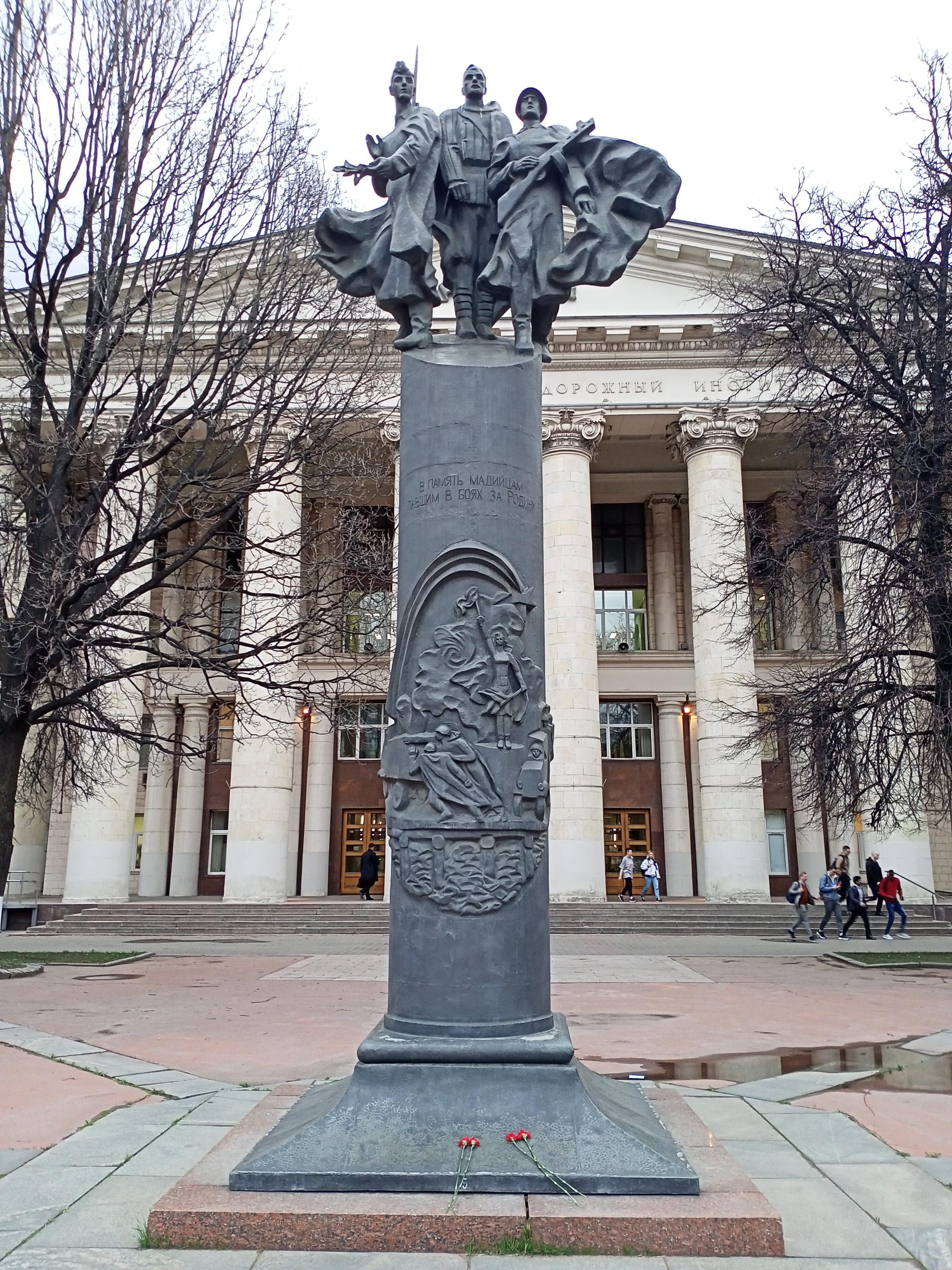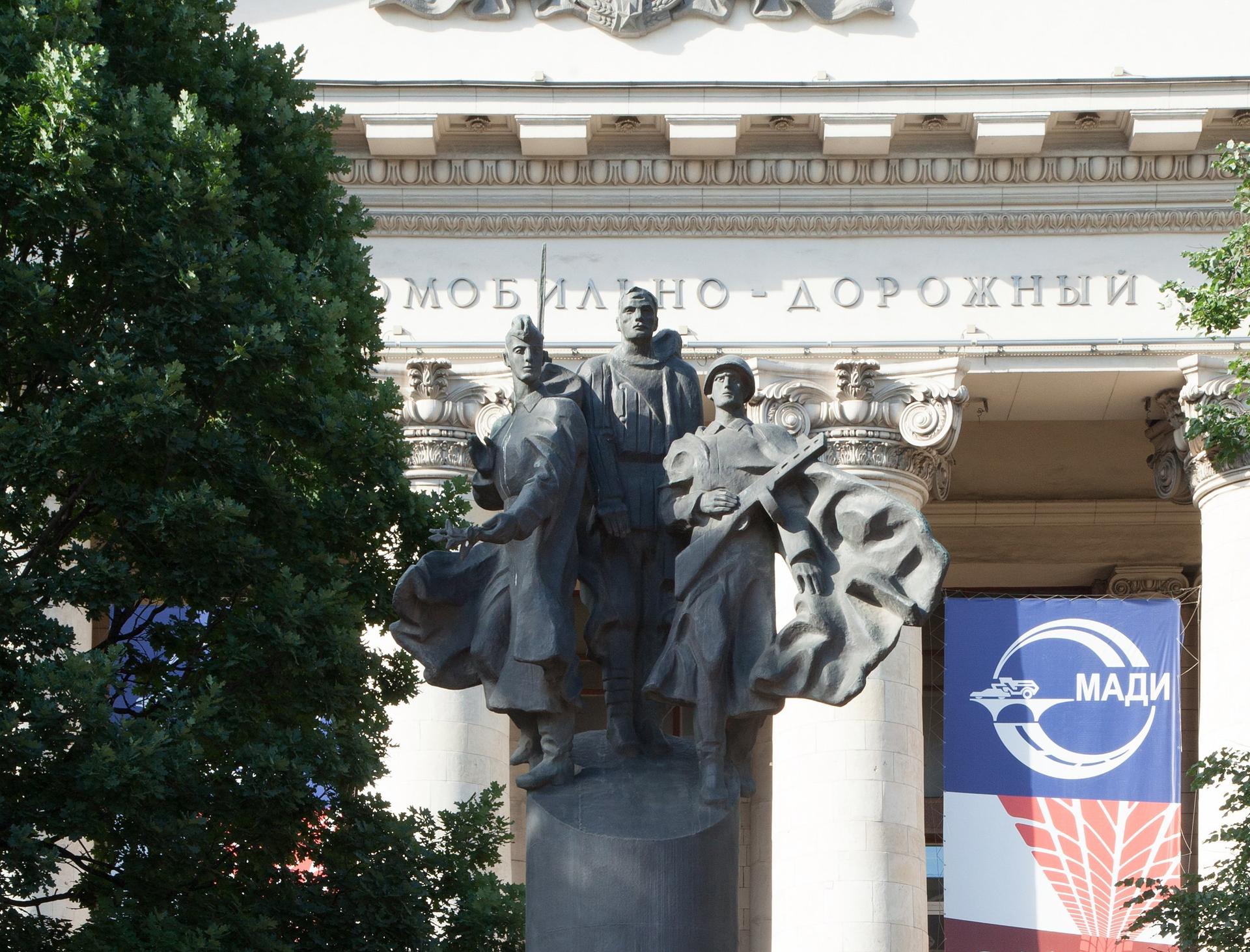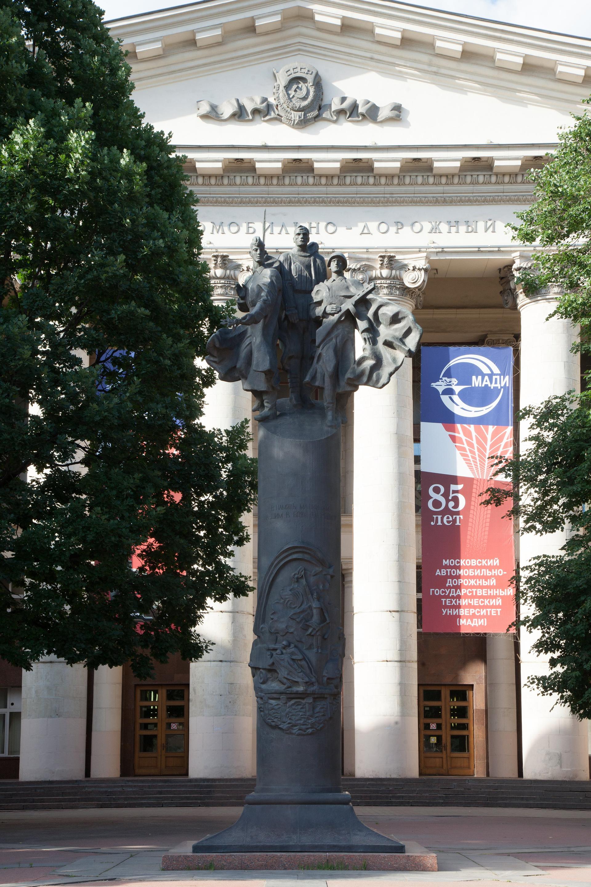 Выполненная из бронзы скульптурная группа изображает трех советских солдат. Фигуры установлены на постаменте цилиндрической формы, имеющем усеченное завершение. В центральной части постамента расположен скульптурный рельеф с изображением военных сцен. Посвятительная надпись гласит: «В память мадийцам, павшим в боях за Родину».
