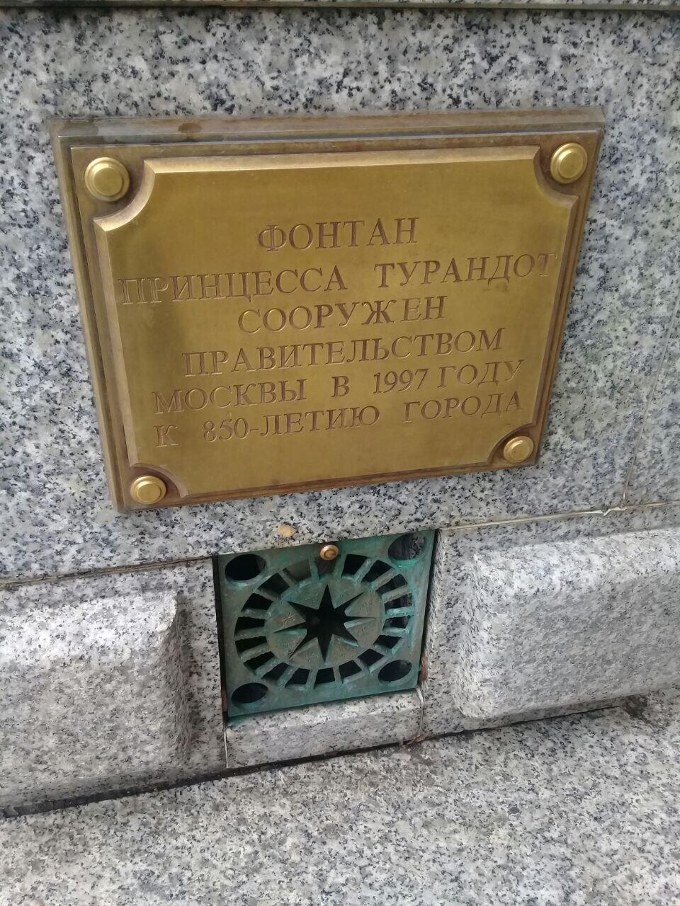 Принцесса Турандот расположена в небольшом углублении на маленькой площадке, находящейся на возвышении. Сам памятник представляет собой большую овальную чашу, в которой находится фонтанная установка. На вершине фонтана восседает на троне, покрытая позолотой, принцесса Турандот. Вокруг памятника находится длинная каменная лавочка, а по вечерам фонтан-памятник подсвечивается.