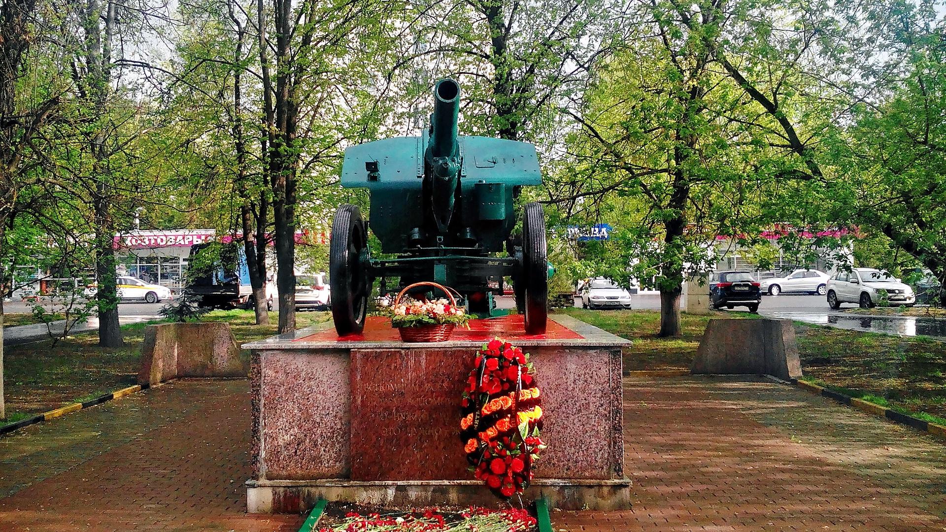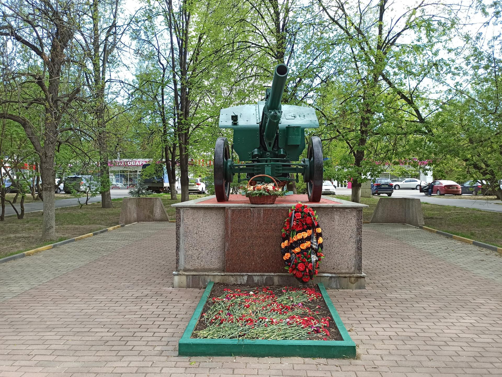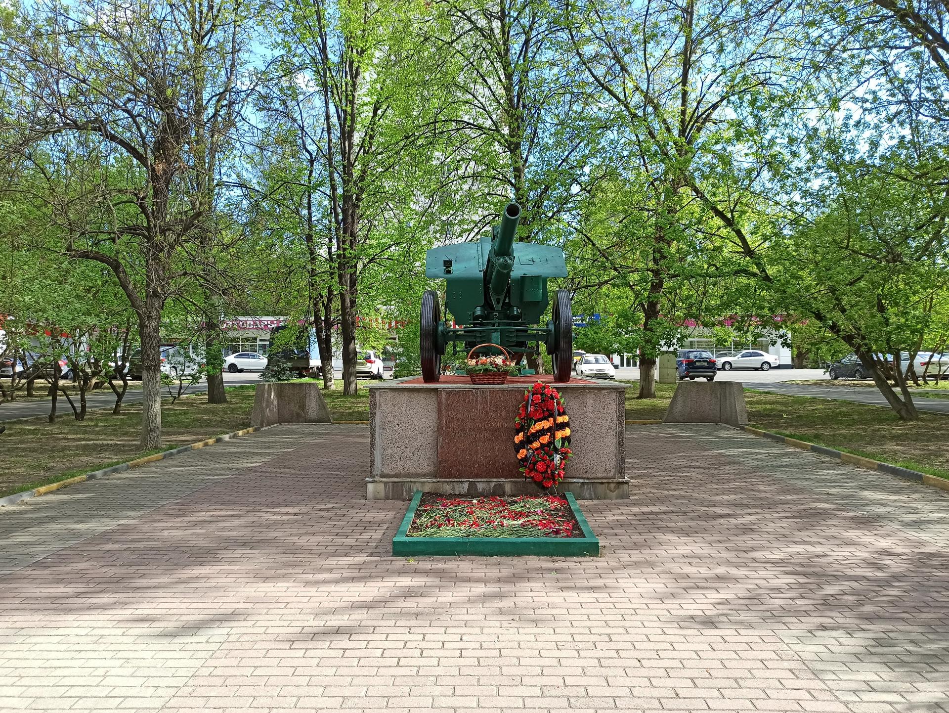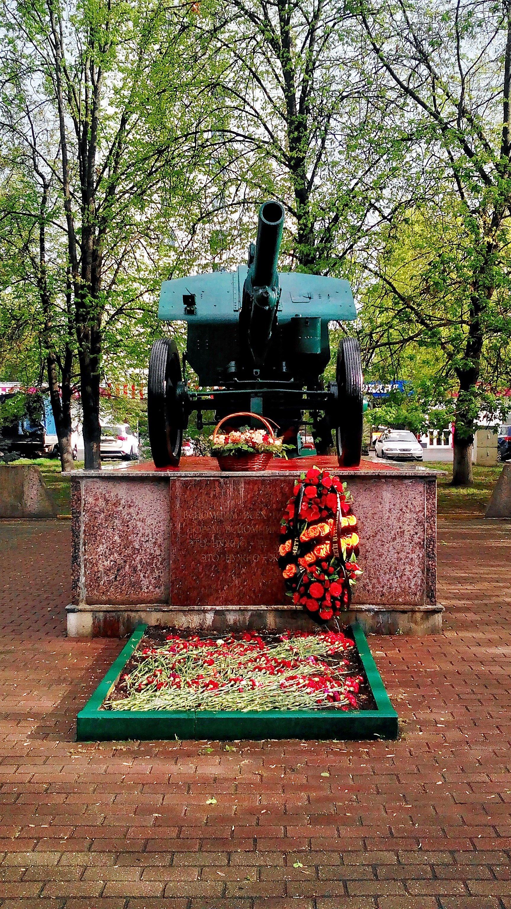 Памятный знак представляет собой пушку, установленную на прямоугольном гранитном постаменте. На лицевой стороне постамента выполнена посвятительная надпись прорезными буквами: «Вспомним всех поименно, горем вспомним своим, это нужно — не мертвым, это нужно — живым!».