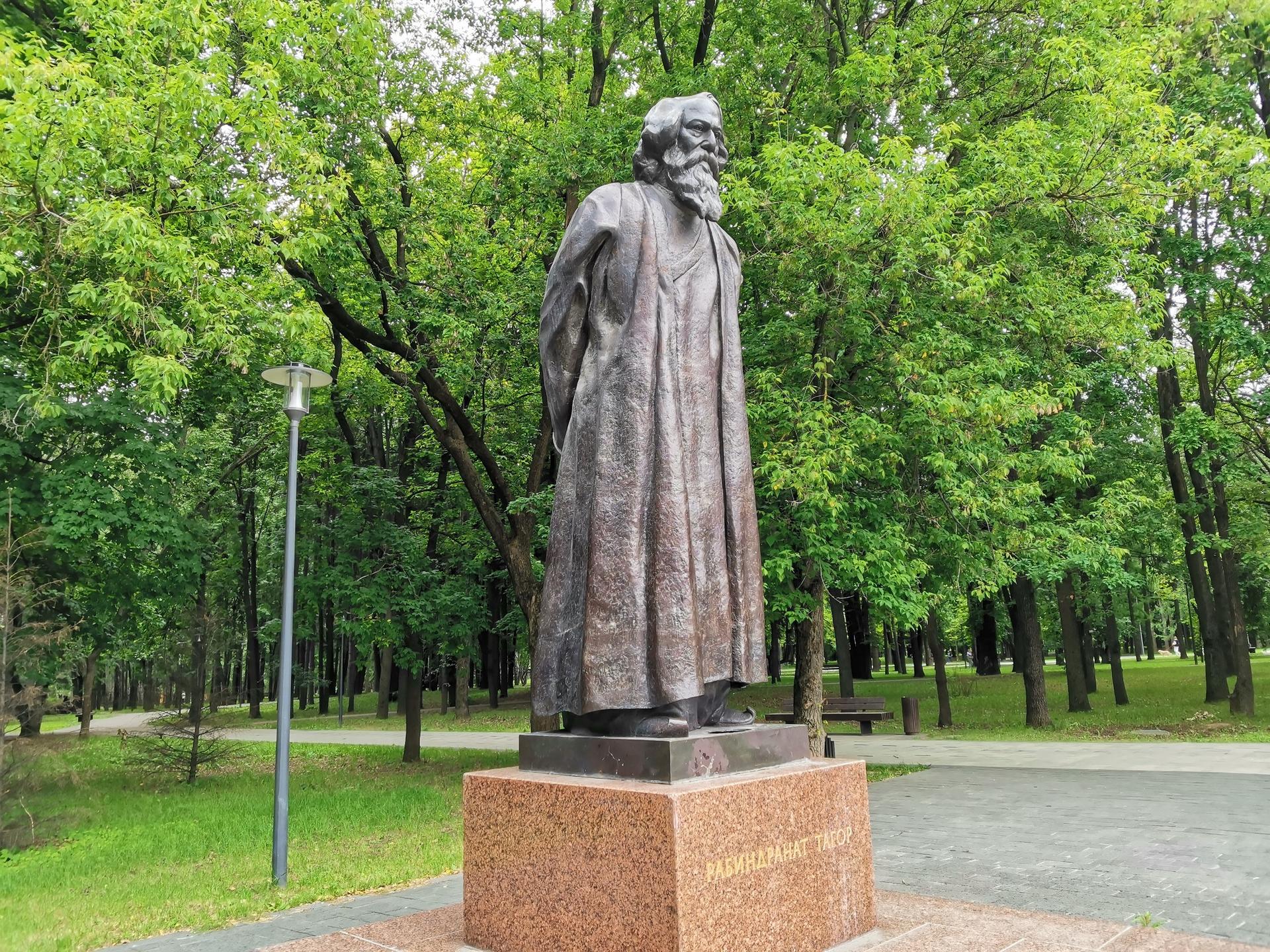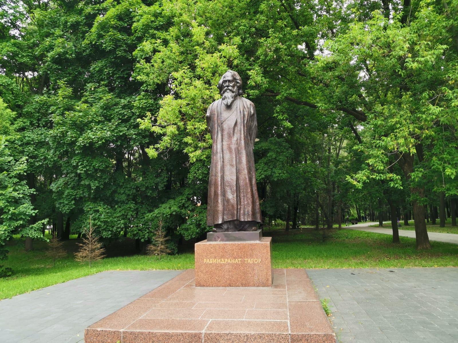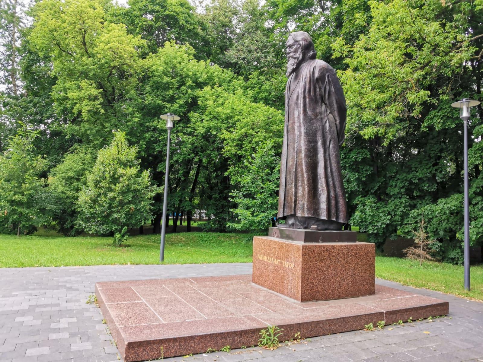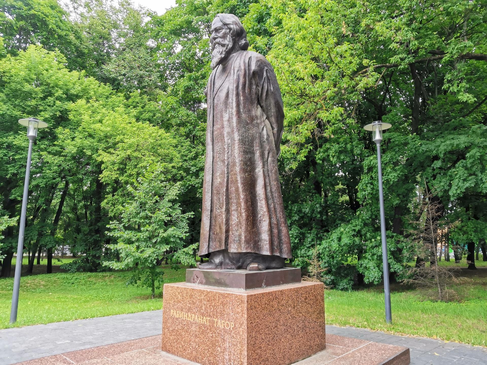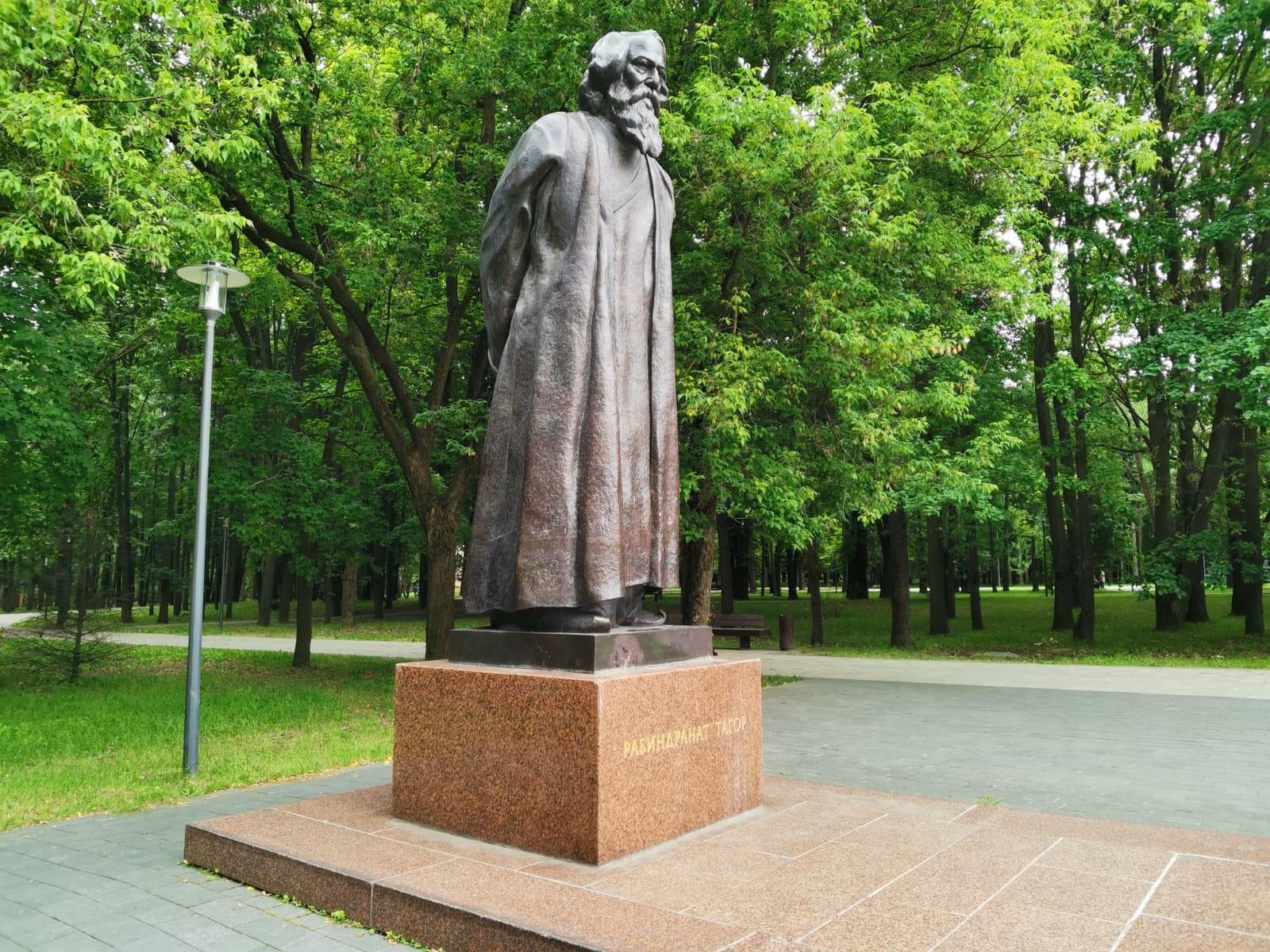 Фигура выполнена из бронзы и установлена на невысоком гранитном постаменте. Индиец одет скромно и просто, руки сложены за спиной. На лице писателя видна печать долгих философских размышлений.