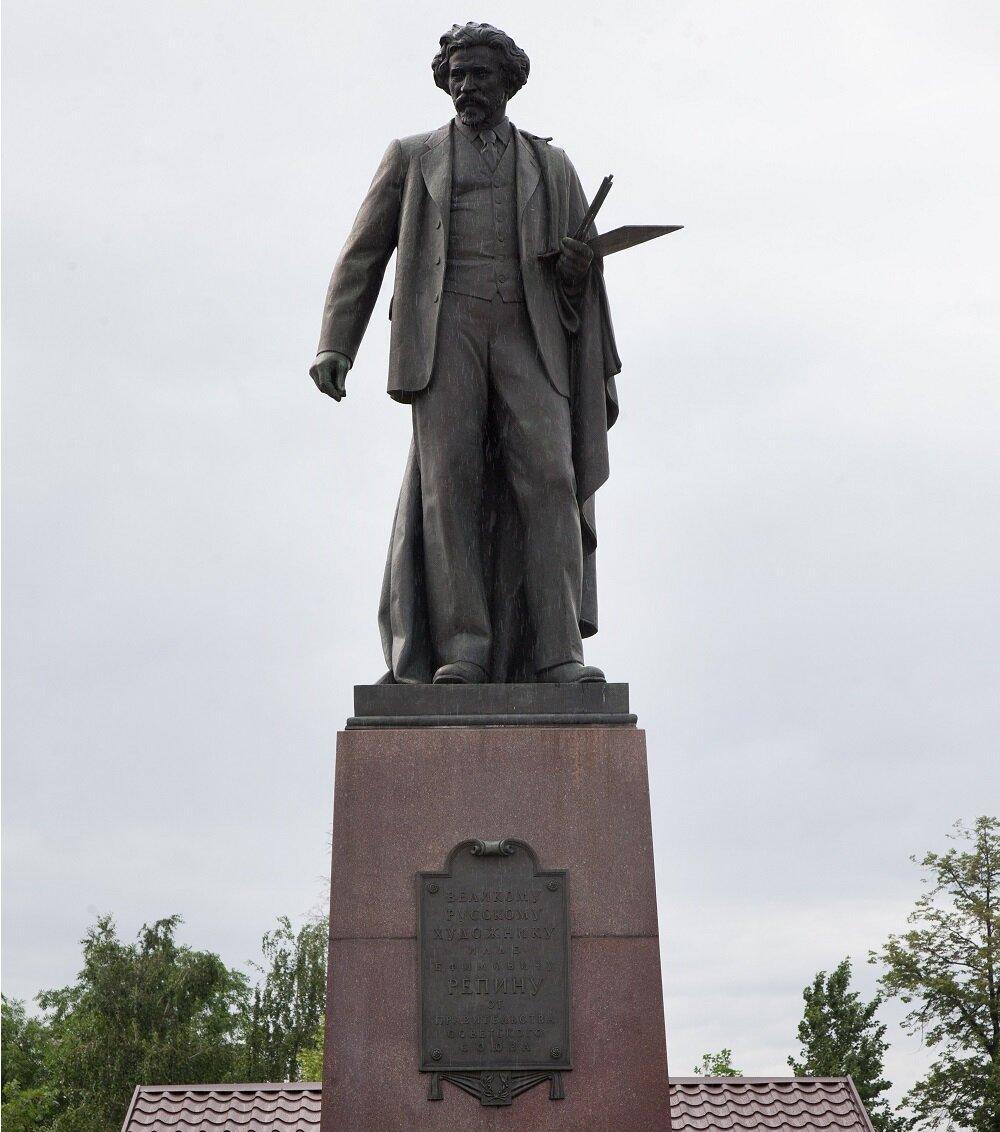 Скульптура художника выполнена из бронзы и установлена на гранитном постаменте. Репин запечатлен в момент творчества. В его руках кисти и палитра. Поза свободная, со слегка склоненной головой. Его взгляд будто ищет новую композицию для приготовленного пустого холста. На постаменте картуш, выполненный из бронзы, с надписью: «Великому русскому художнику Илье Репину от Правительства Советского Союза».