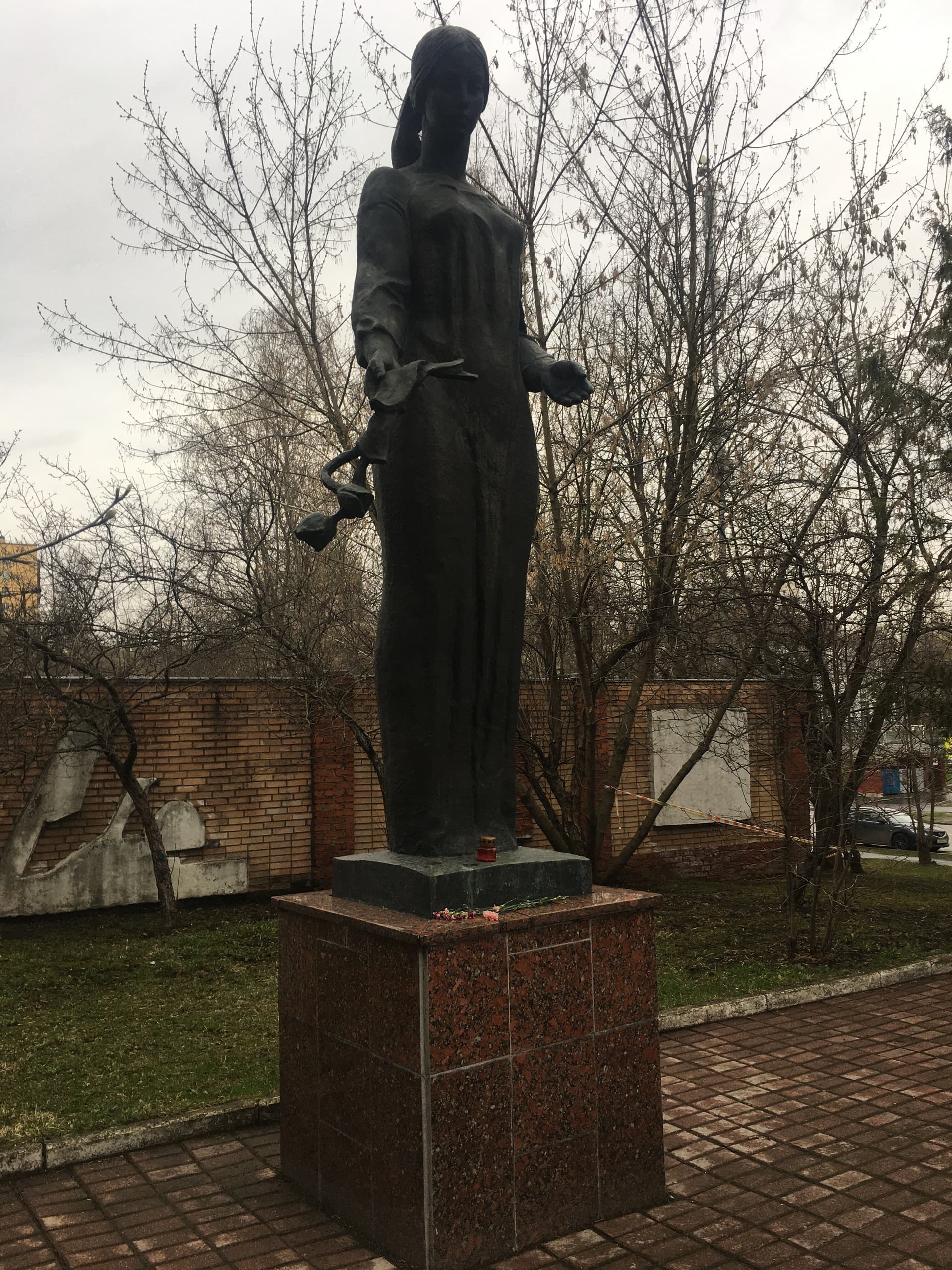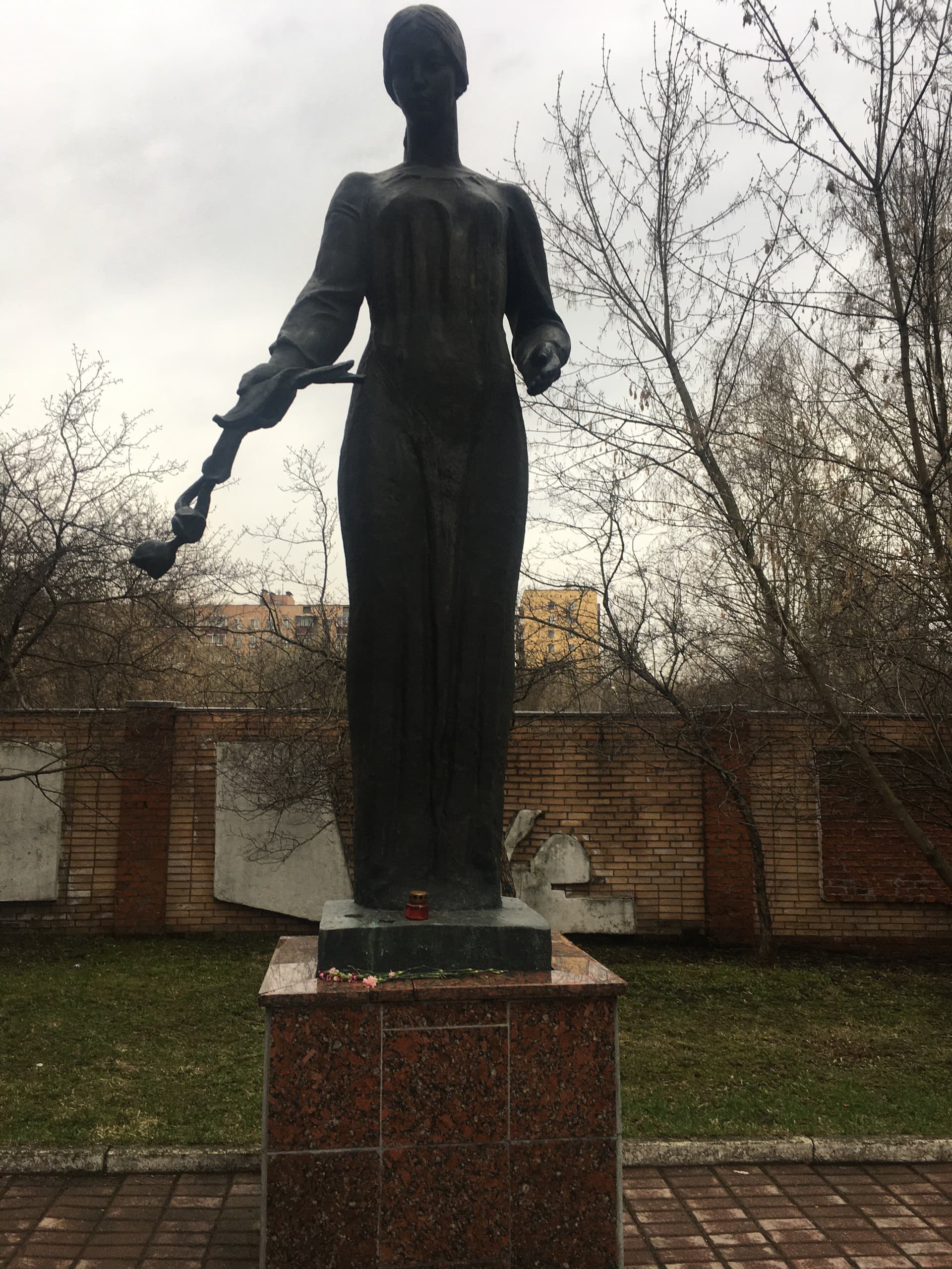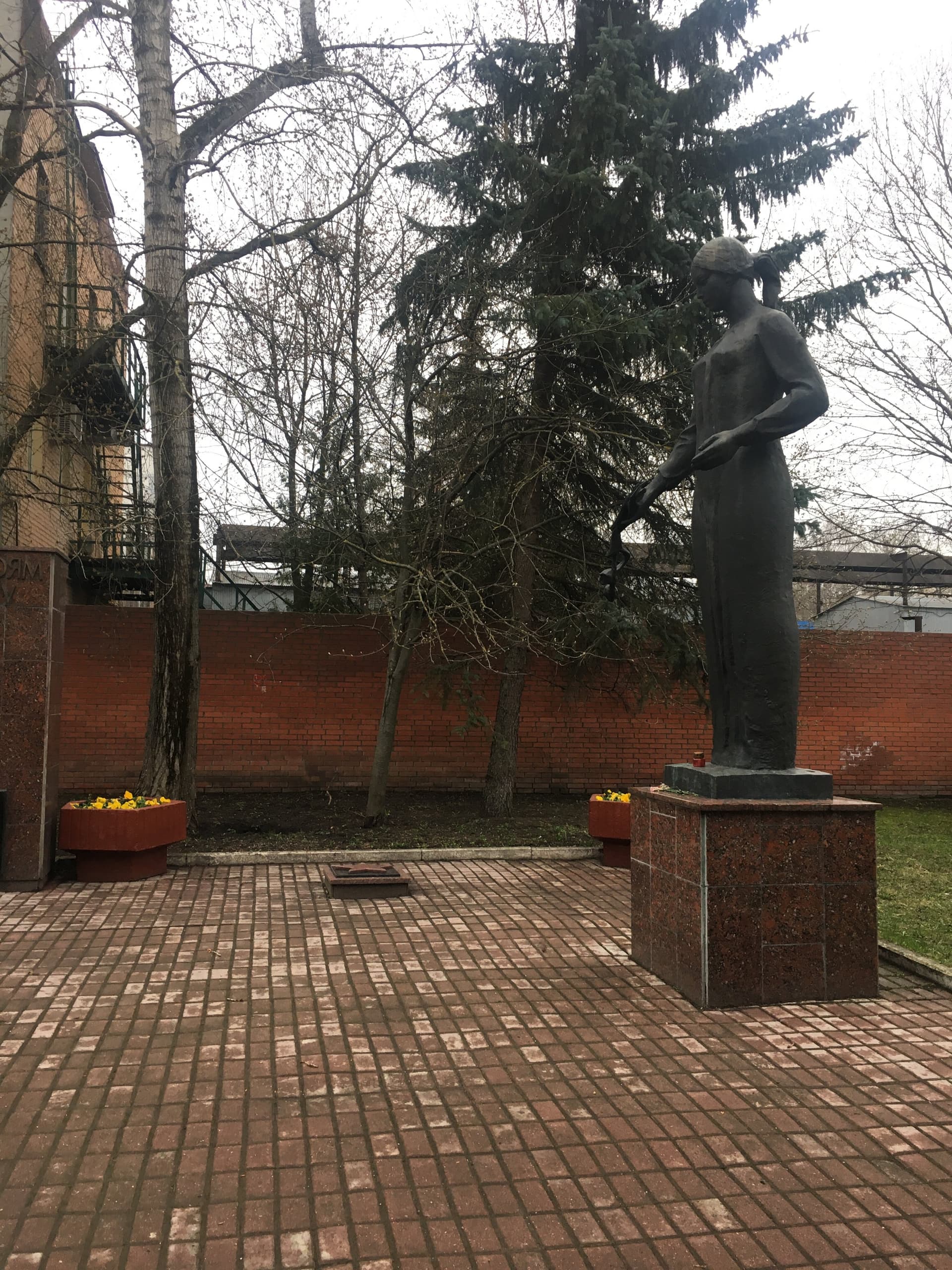 Объект посвящен работникам абразивного завода, погибшим в годы Великой Отечественной войны 1941-1945 гг. Представляет собой бронзовую фигуру женщины, исполненную в полный рост. Рельефная проработка складок одеяния женщины придает скульптуре особую пластическую выразительность. Скульптура установлена на постамент из красного полированного гранита.