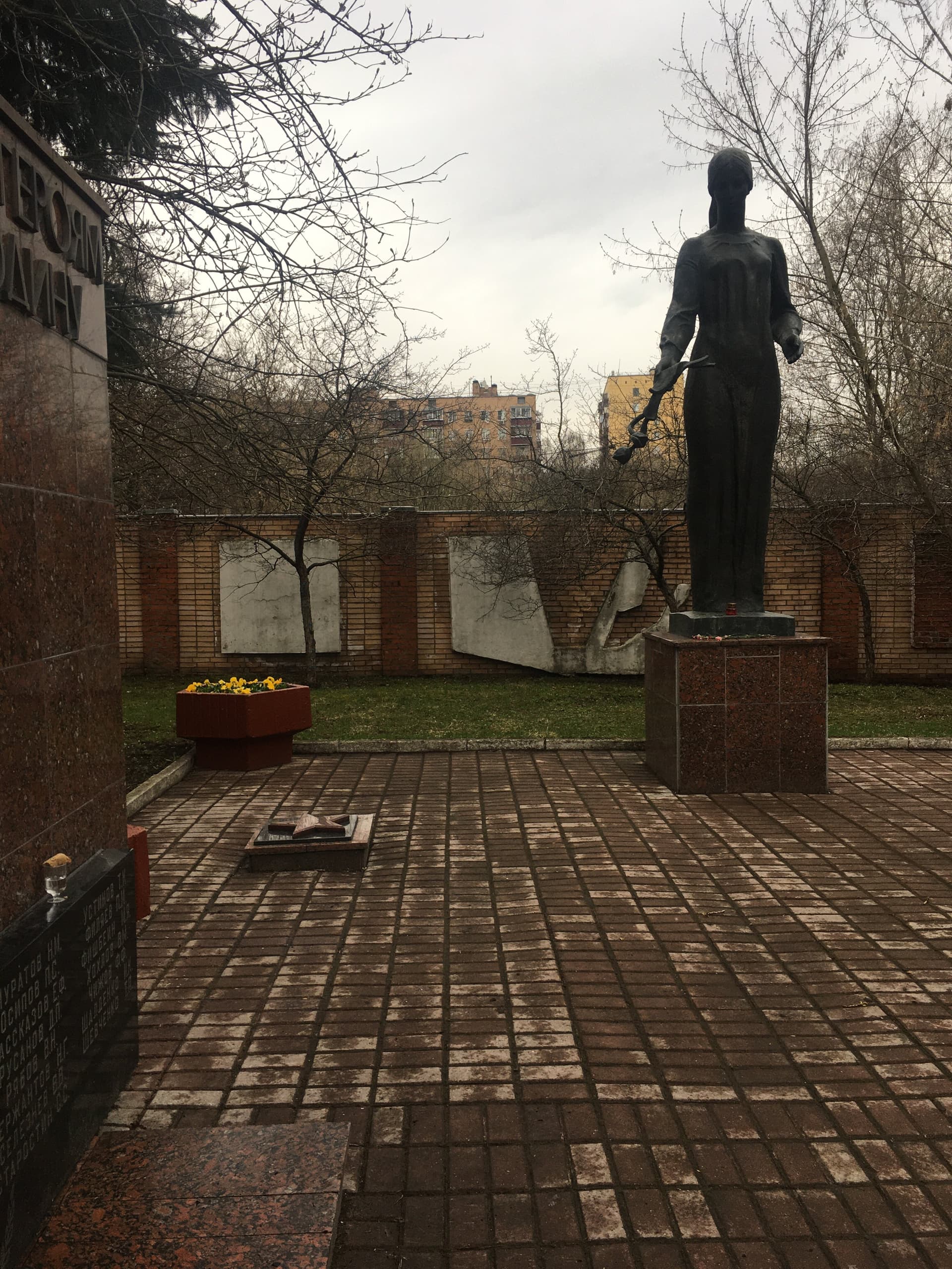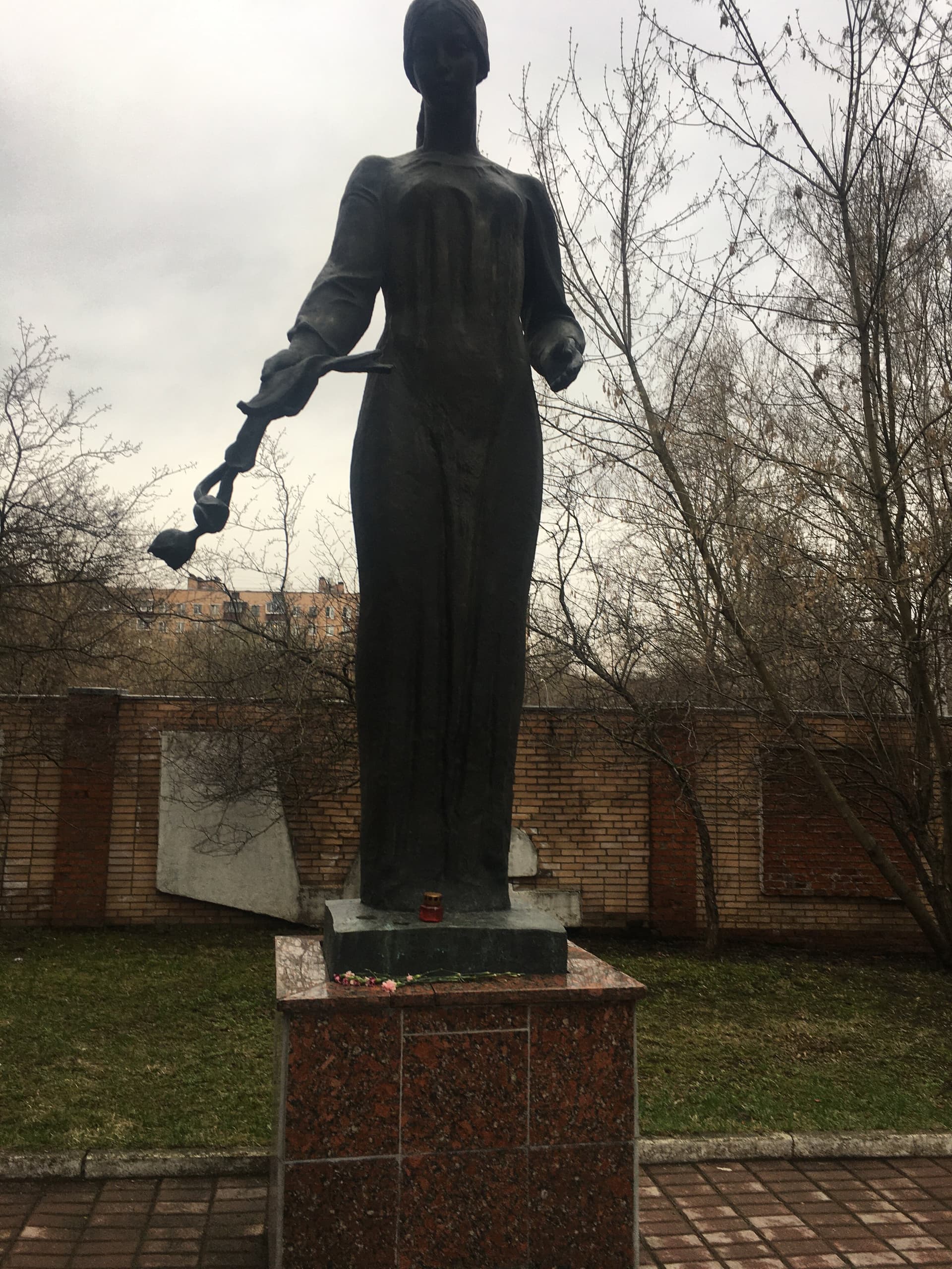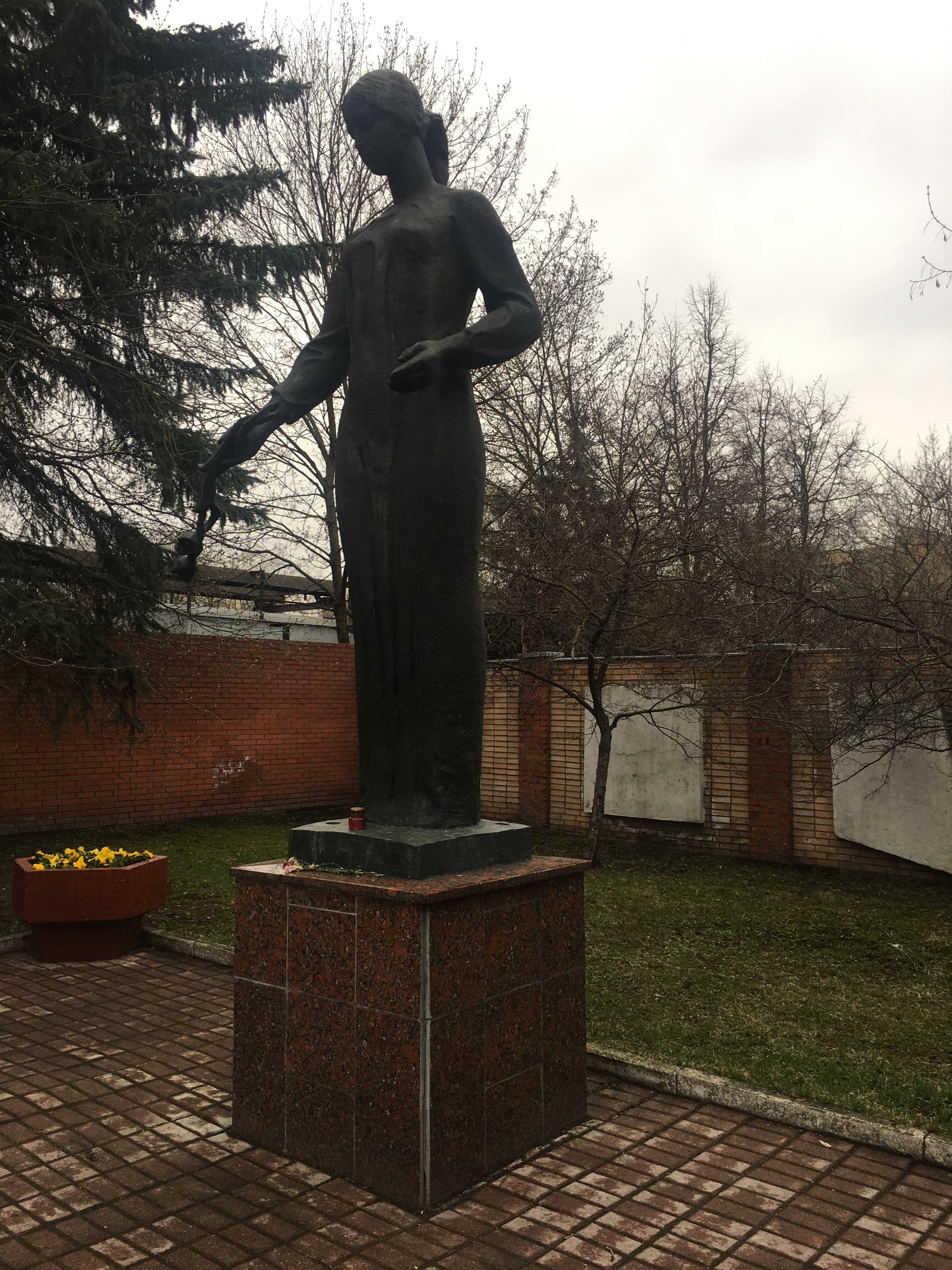 Объект посвящен работникам абразивного завода, погибшим в годы Великой Отечественной войны 1941-1945 гг. Представляет собой бронзовую фигуру женщины, исполненную в полный рост. Рельефная проработка складок одеяния женщины придает скульптуре особую пластическую выразительность. Скульптура установлена на постамент из красного полированного гранита.