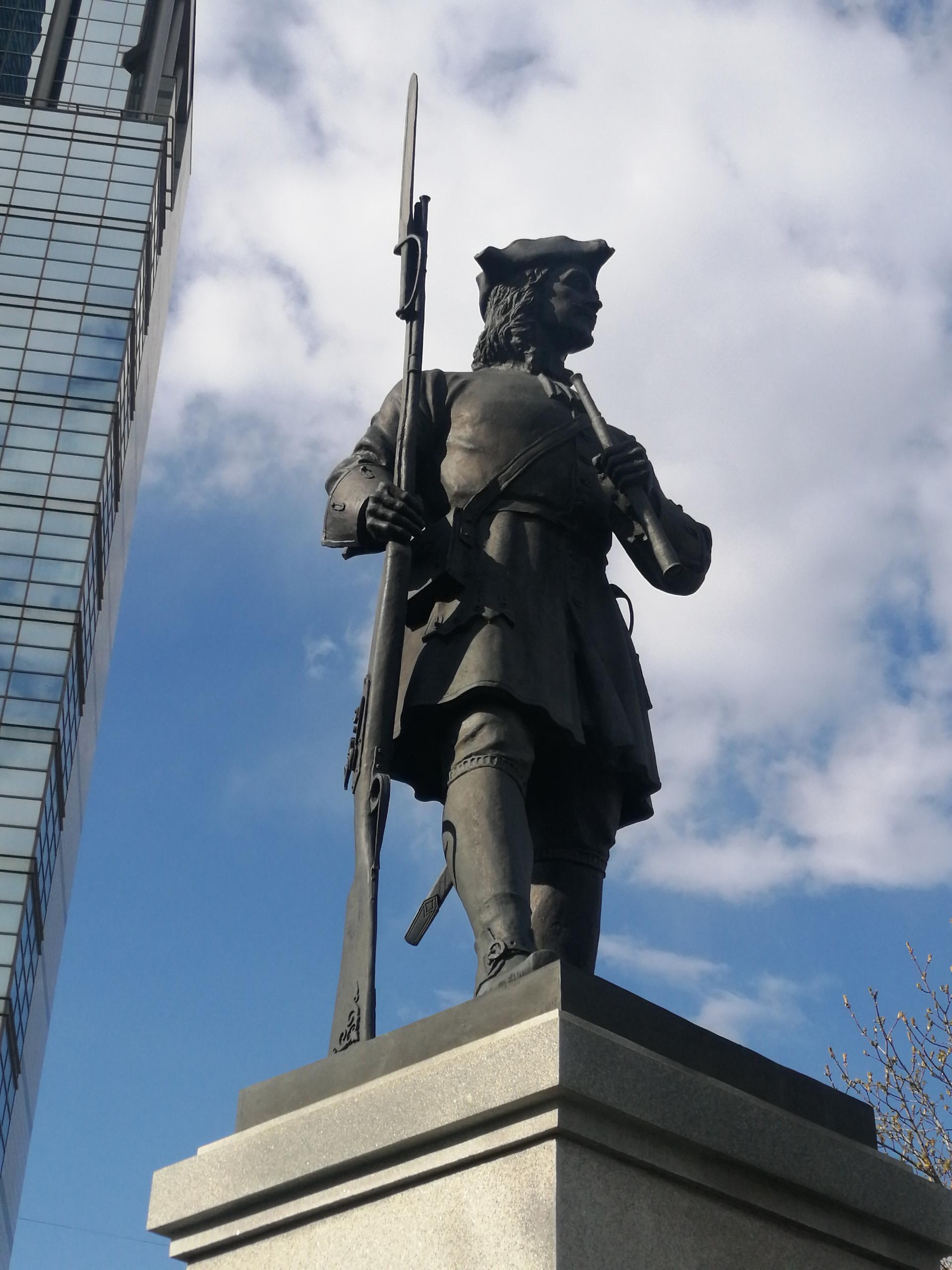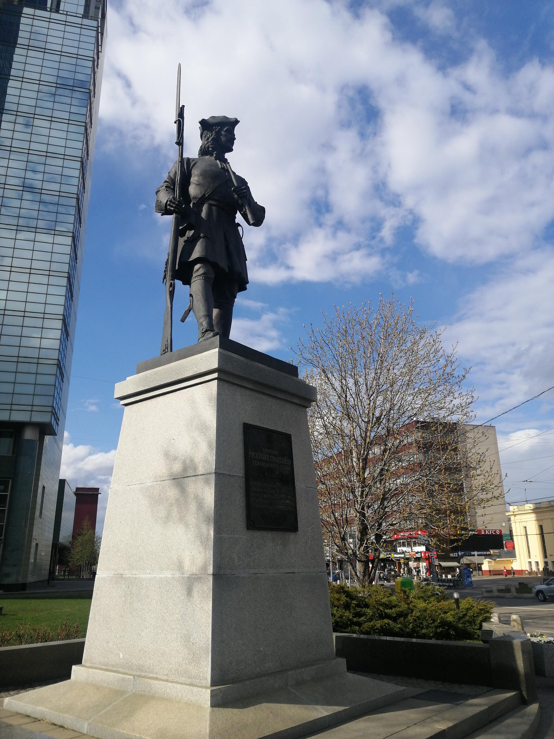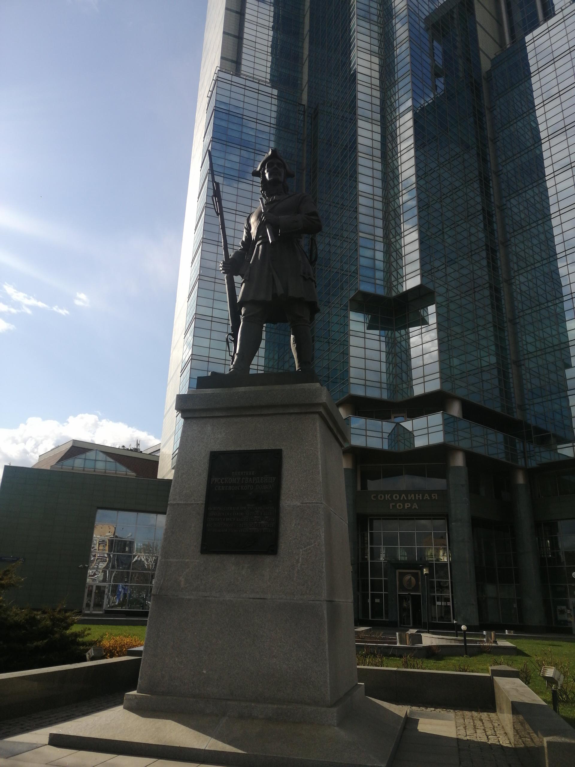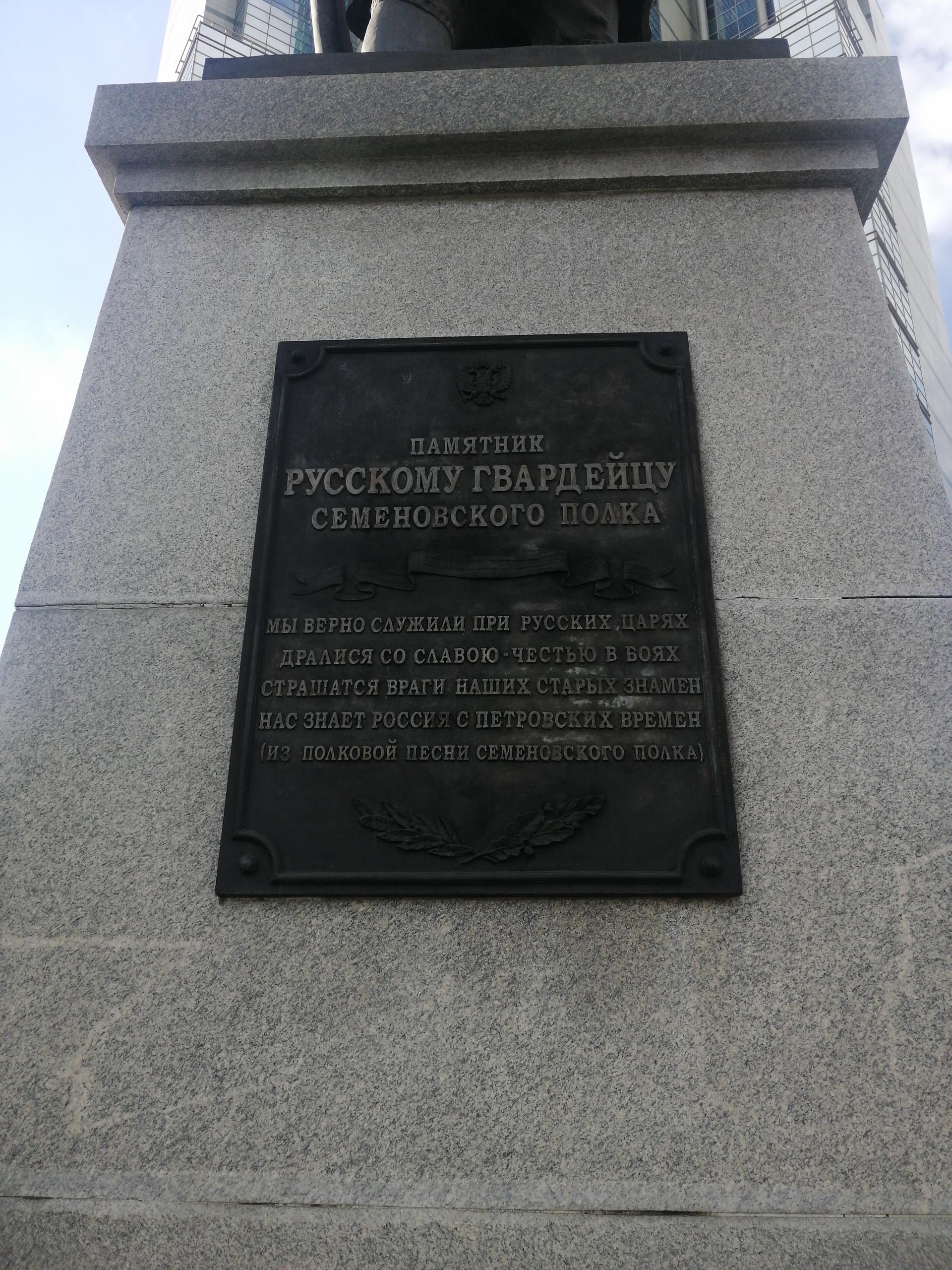 Памятник представляет собой бронзовую скульптуру гвардейца в военной форме XVIII в., держащего оружие и подзорную трубу, установленную на гранитный постамент. На нем памятная табличка: «Памятник русскому гвардейцу Семеновского полка. „Мы верно служили при русских царях, дралися со славою-честью в боях. Страшатся враги наших старых знамен. Нас знает Россия с петровских времен“ (из полковой песни Семеновского полка)».