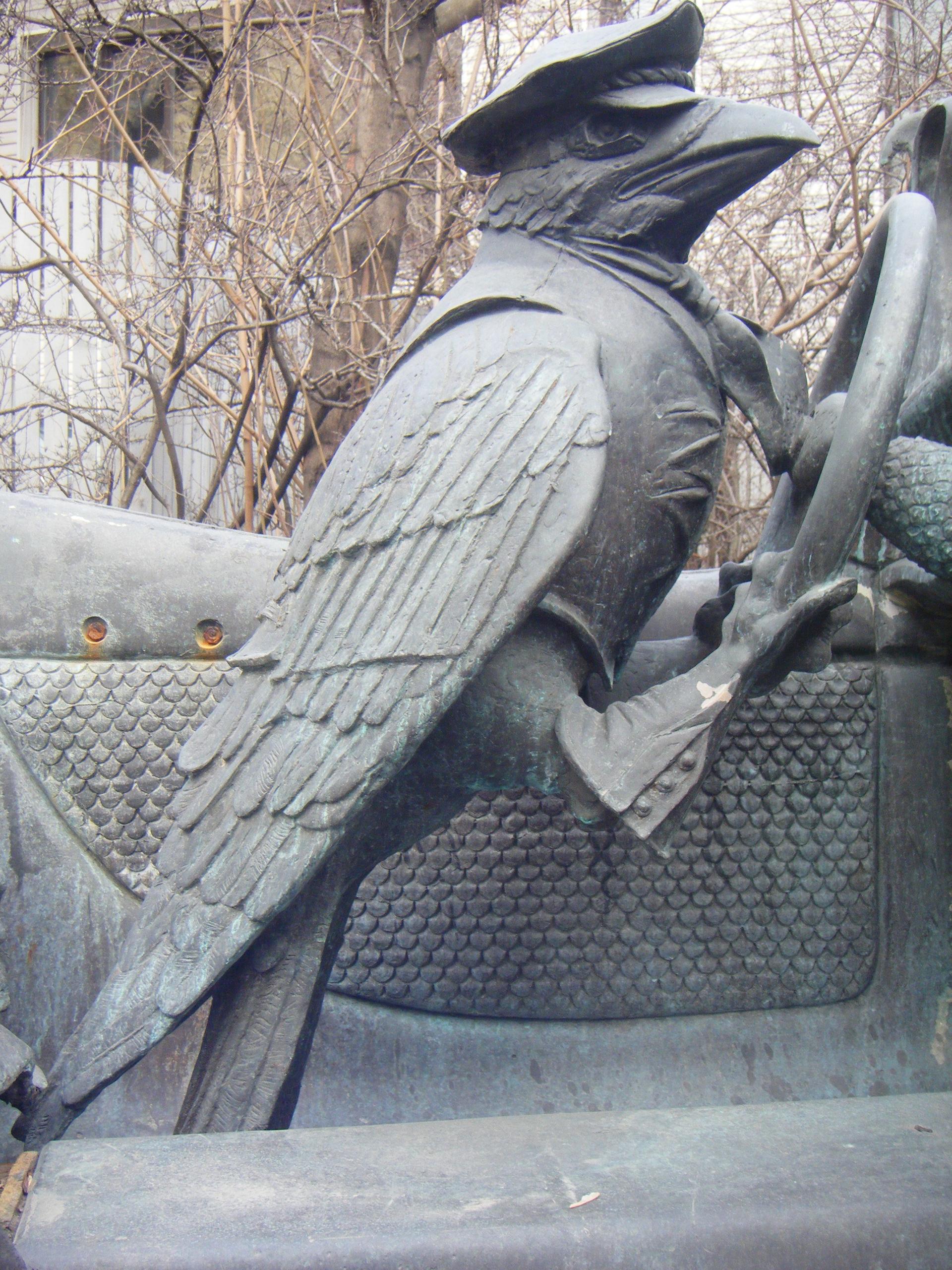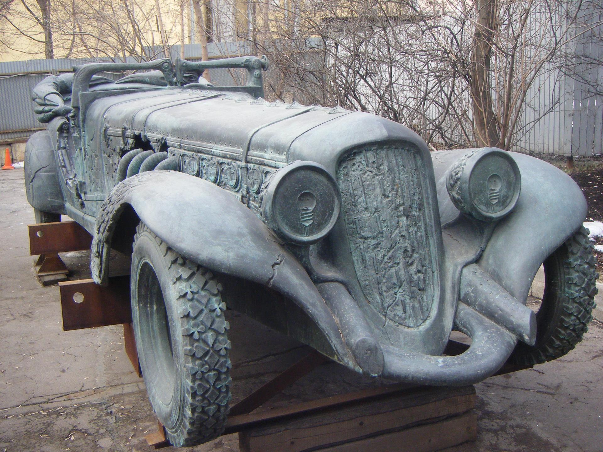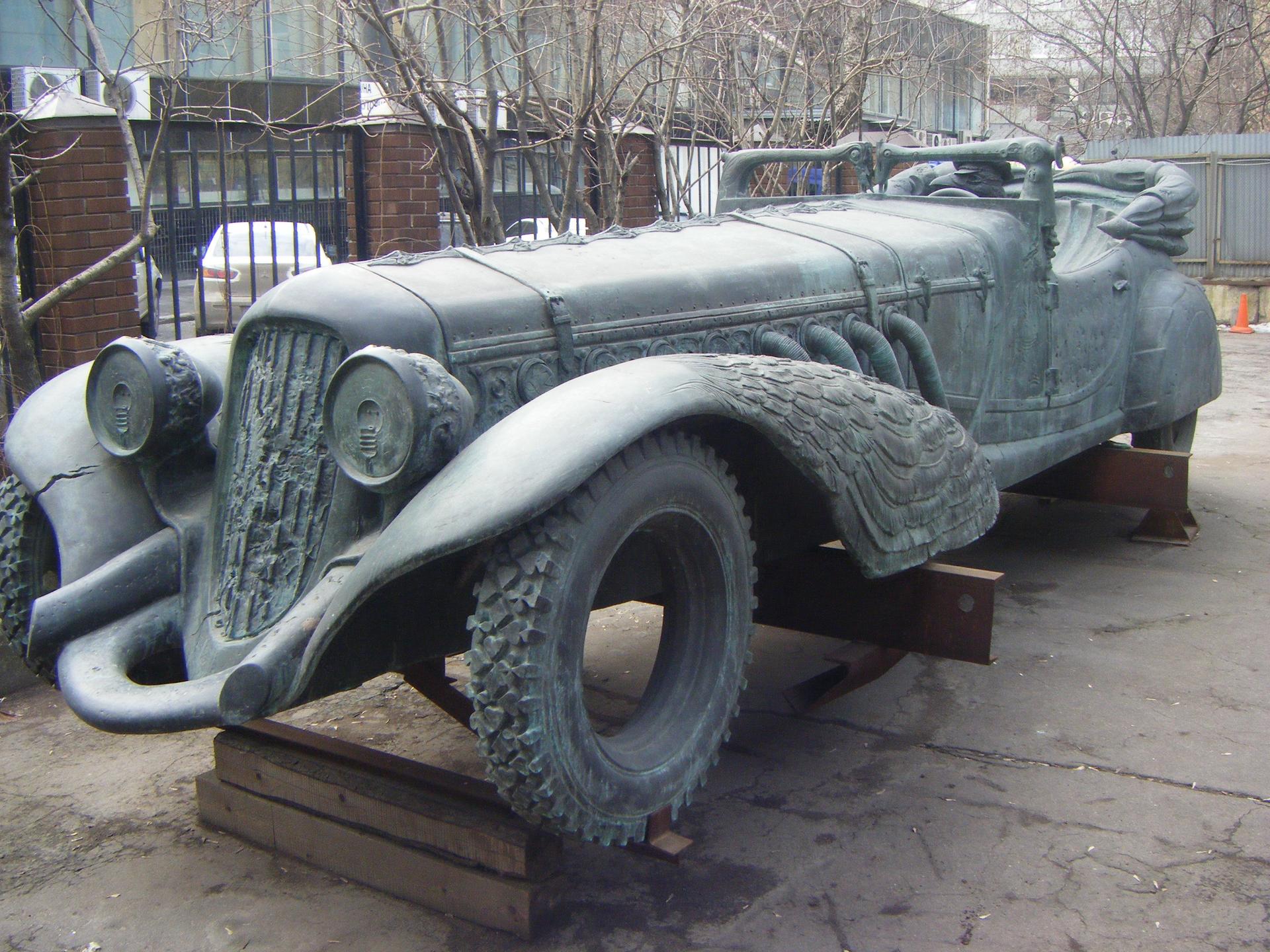 "...буланая открытая машина, только на шоферском месте сидел необычного вида шофер, а черный длинноносый грач в клеенчатой фуражке и перчатках с раструбами" - из романа М.А. Булгакова "Мастер и Маргарита"). Машина впечатляет своими размерами и оформлением : крылья над колесами сделаны в виде крыльев птиц, с оперением. Кажется, что расправит ретроавтомобиль свои крылья, взмахнёт ими, подхватит тебя и унесёт вверх, туда, где летала ночами Маргарита...
