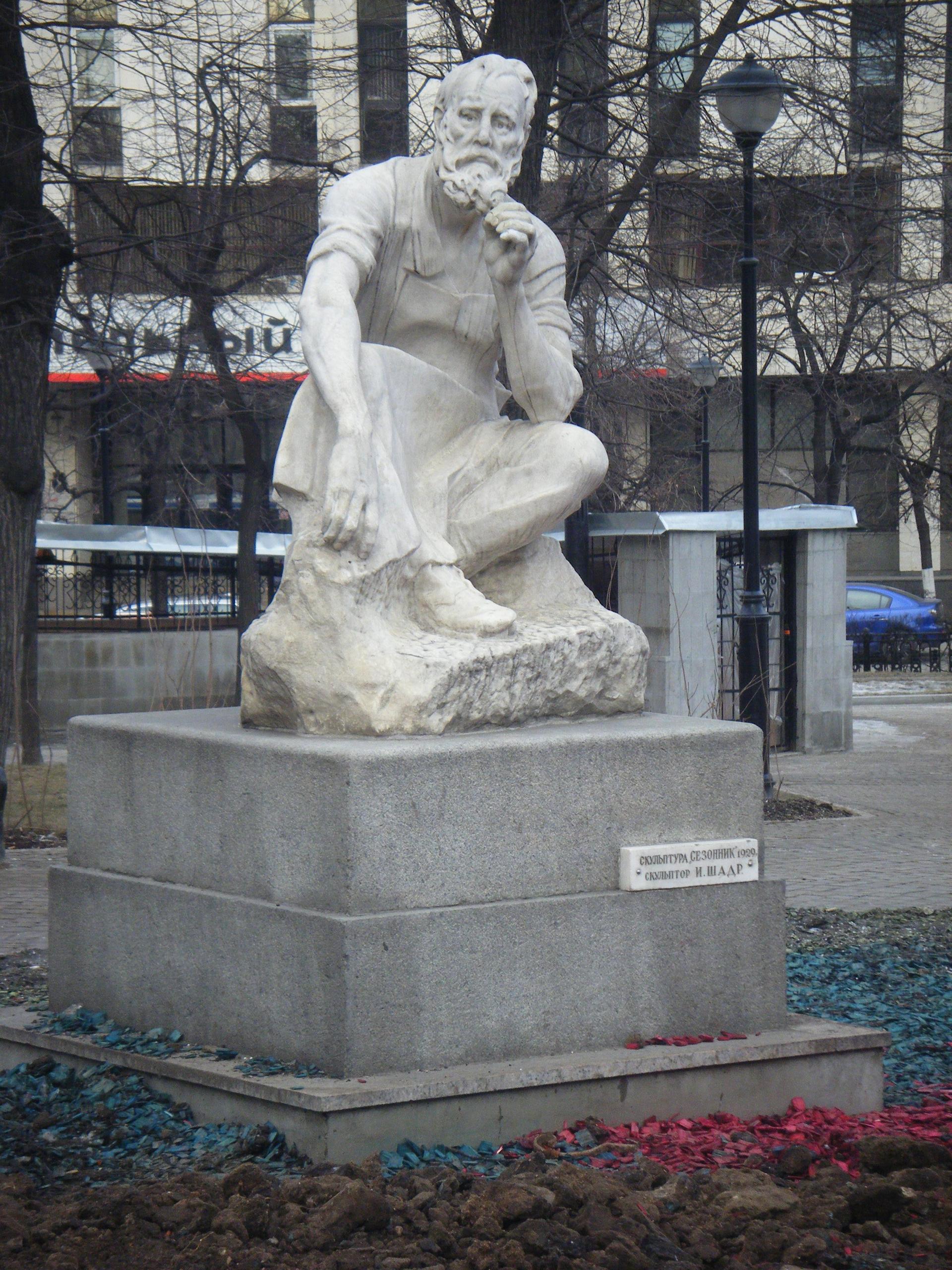 Памятник на этом месте расположен не случайно - в начале двадцатых годов здесь располагалась биржа труда, на которой искали работу на сезон приезжающие в Москву работники.