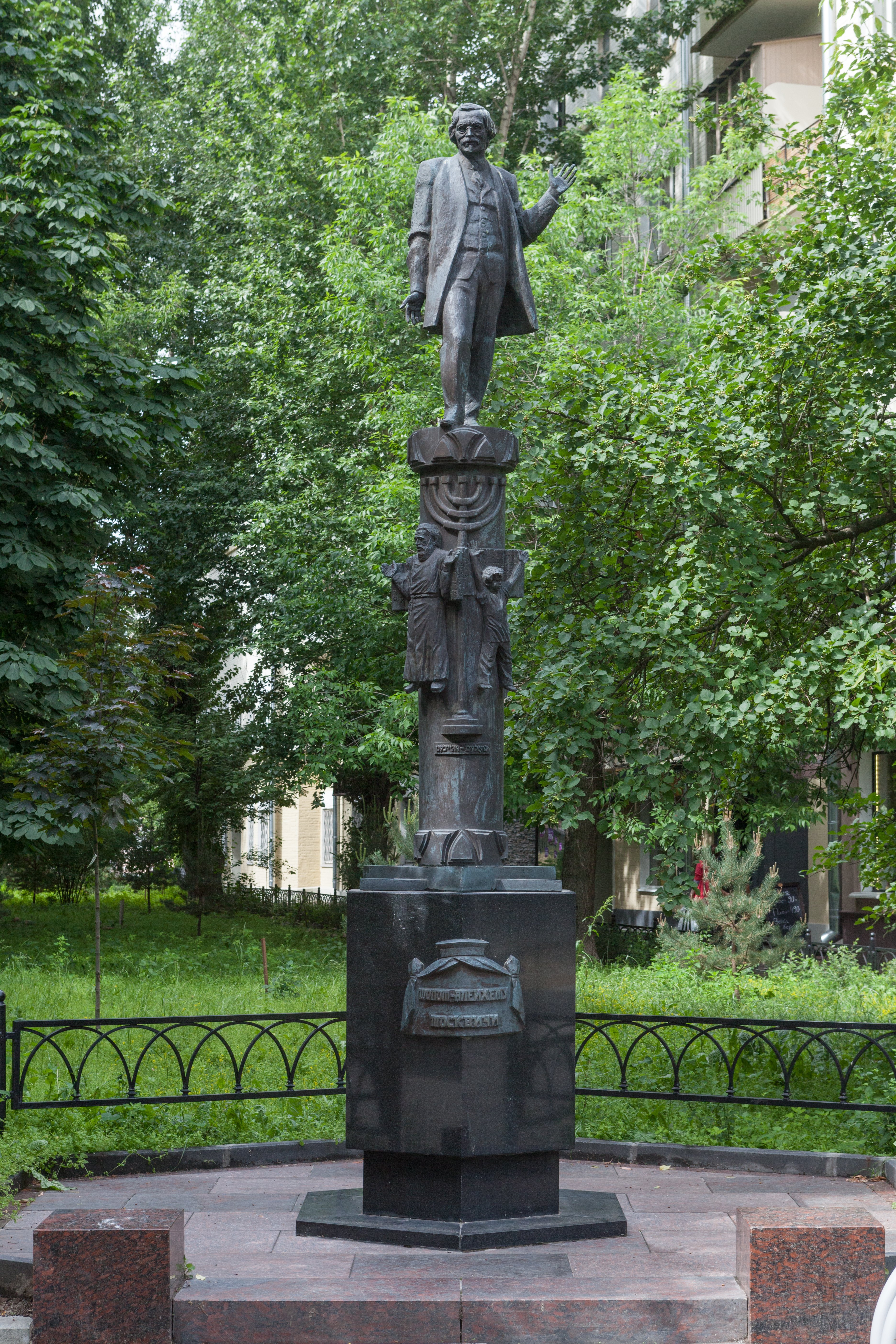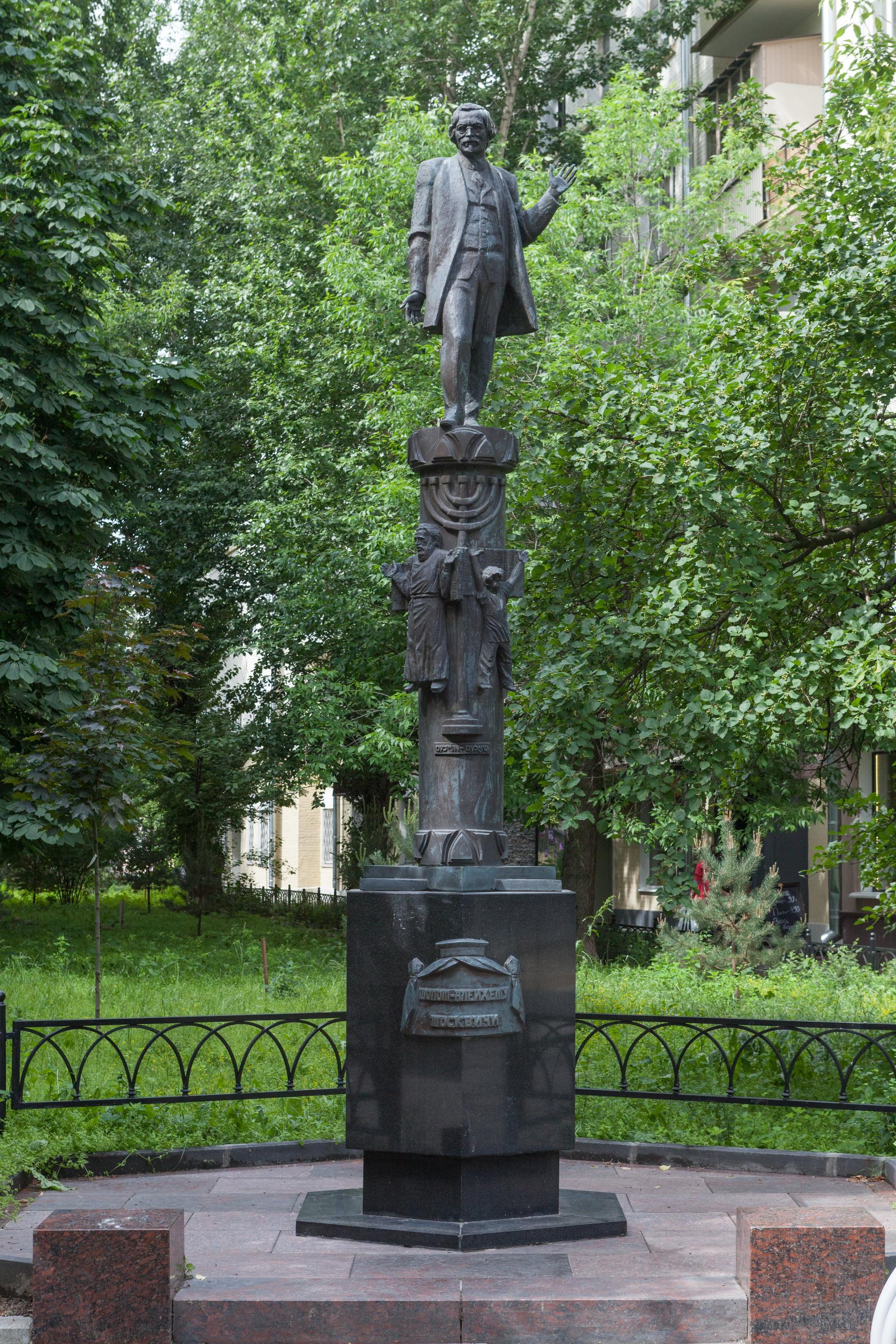 В скульптурной композиции писатель запечатлен в свободной творческой позе. На бронзовом пьедестале выгравирован семисвечник, а также расположены рельефные фигуры персонажей сочинений Шолом-Алейхема: мальчик Мотл, Тевье-молочник и герои романа «Блуждающие звезды» — Лейбл и Рейзл.
