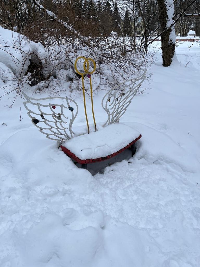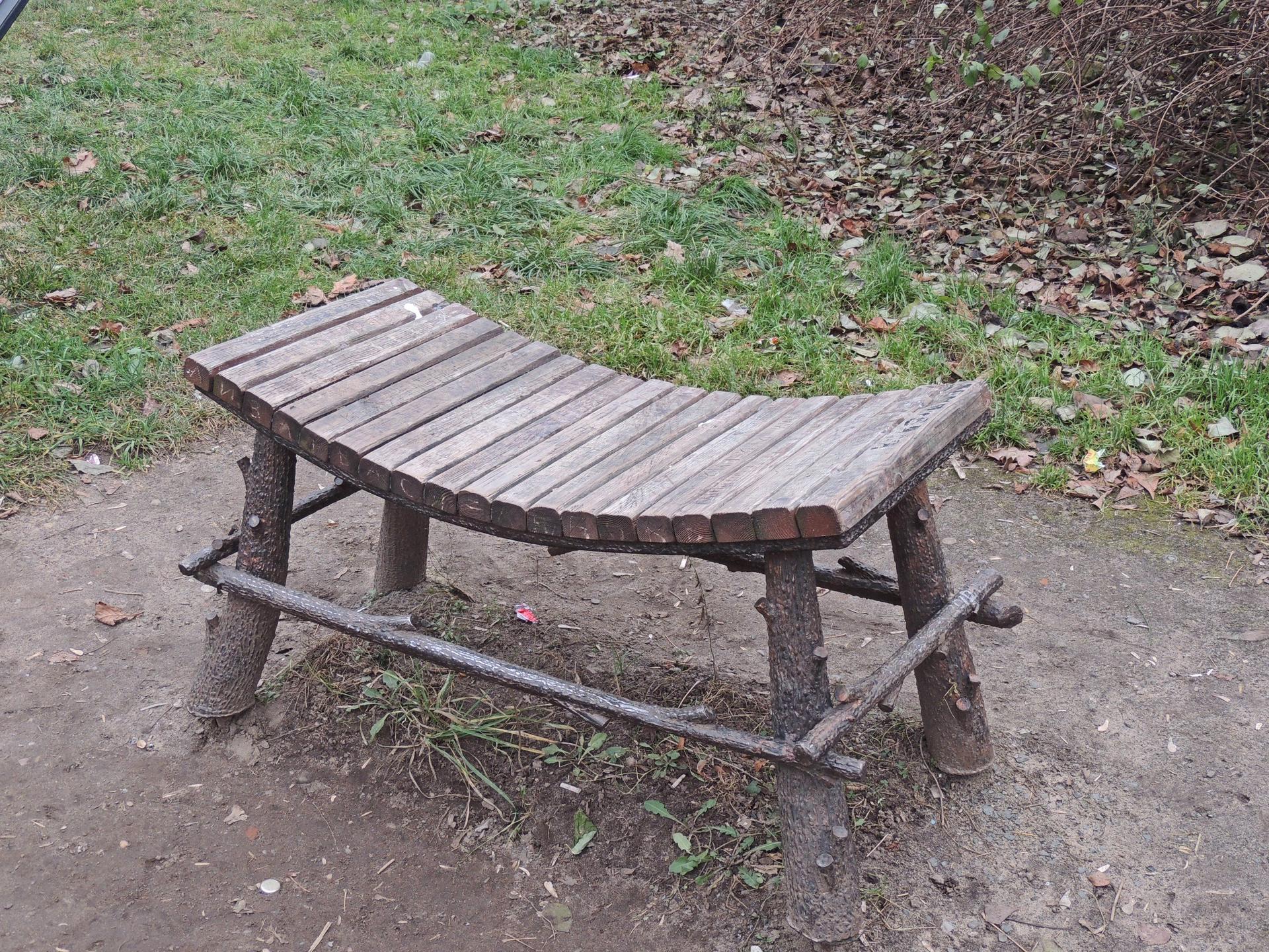 Небольшая скамейка сделана из дерева и чугуна. Сама скамья деревянная, а спинка изготовлена из чугуна в виде расправленных крыльев птицы. Литье сетчатое,поэтому, на спинку очень удобно вешать замки, ленточки и другие символы любви. Рядом установлена доска с надписью: "Разлуку вытесняет. Любовь прибавляет".