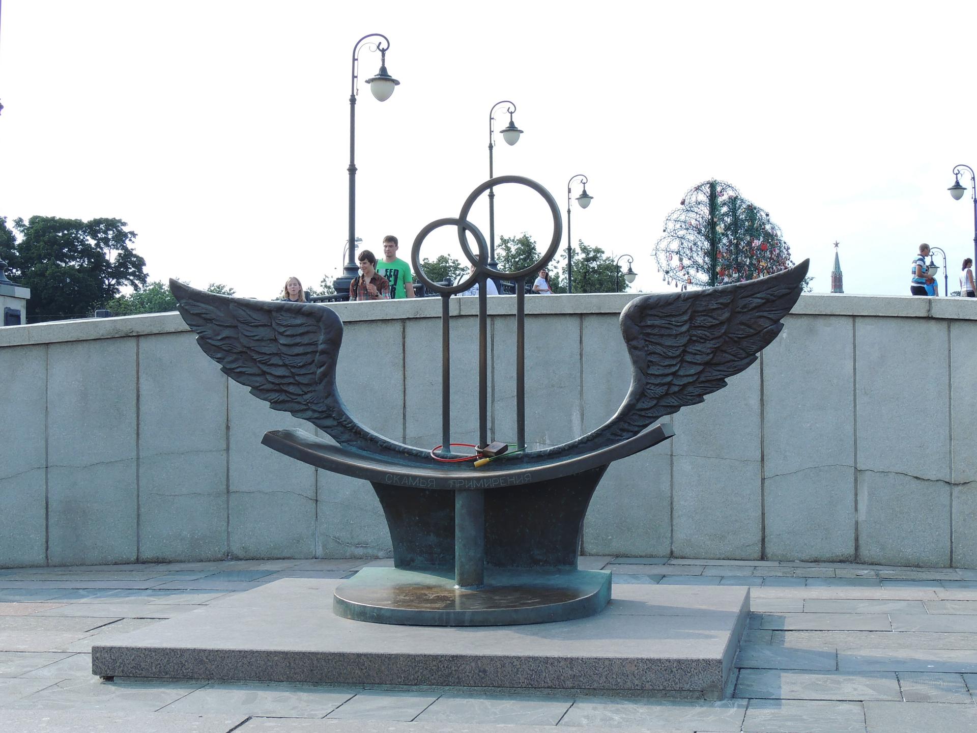 Установлена скамья на Кадашевской набережной у Лужкова моста. Место это выбрано не случайно - Лужков мост уже давно в народе именуют «Мостом влюбленных». Скамью примирения придумали и воплотили в жизнь архитектор Александр Колесников и конструктор Георгий Непомнящих. Она устроена таким образом, что сидящие на ней люди поневоле прижмутся друг к другу. А крылья по бокам и нимбы над головой словно дополняют идиллию ангельского примирения. Интересно, что для изготовления скамьи использовали старую пушку, которая в войне 1812 года принадлежала французам. Ее подарил московский коллекционер, который решил, что старое орудие прекрасно может послужить вечным ценностям – любви, семьи и верности. Если вы повздорили с любимым человеком, то скамья примирения - именно то место, где можно забыть обо всех неприятностях и обидах. Просто невозможно продолжать обижаться на близкого и любимого человека, сидя в обнимку.