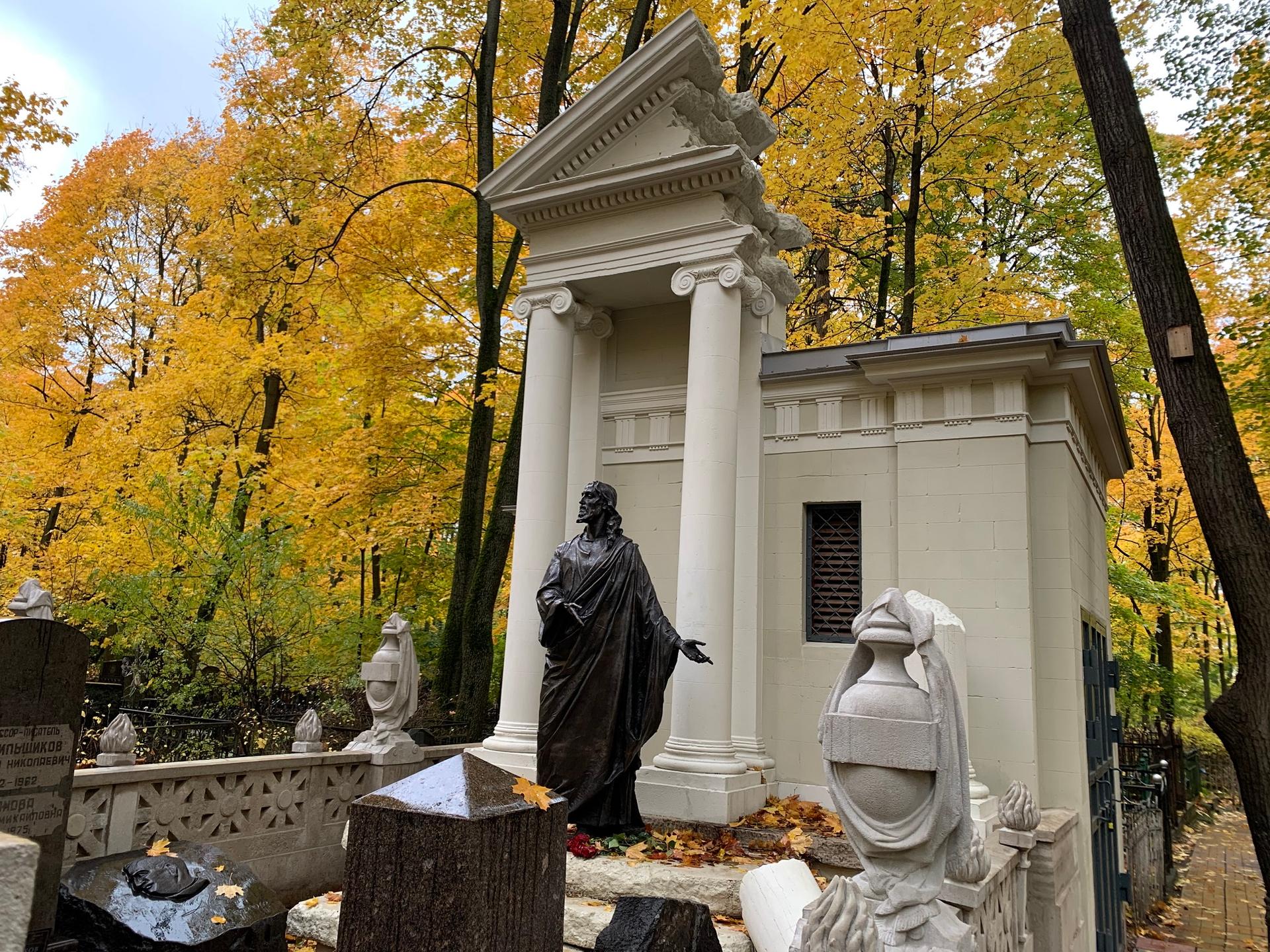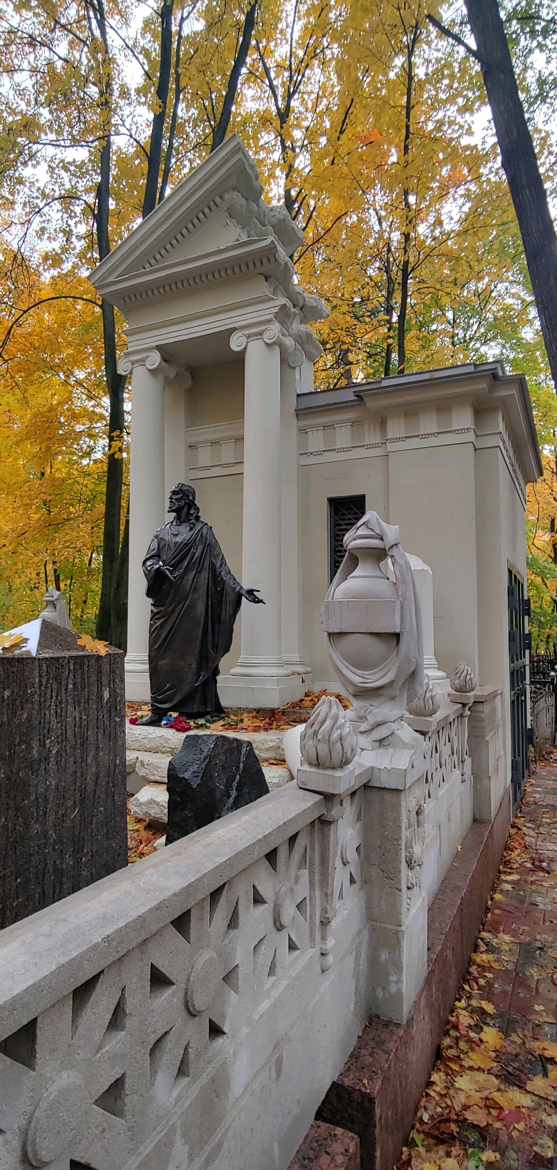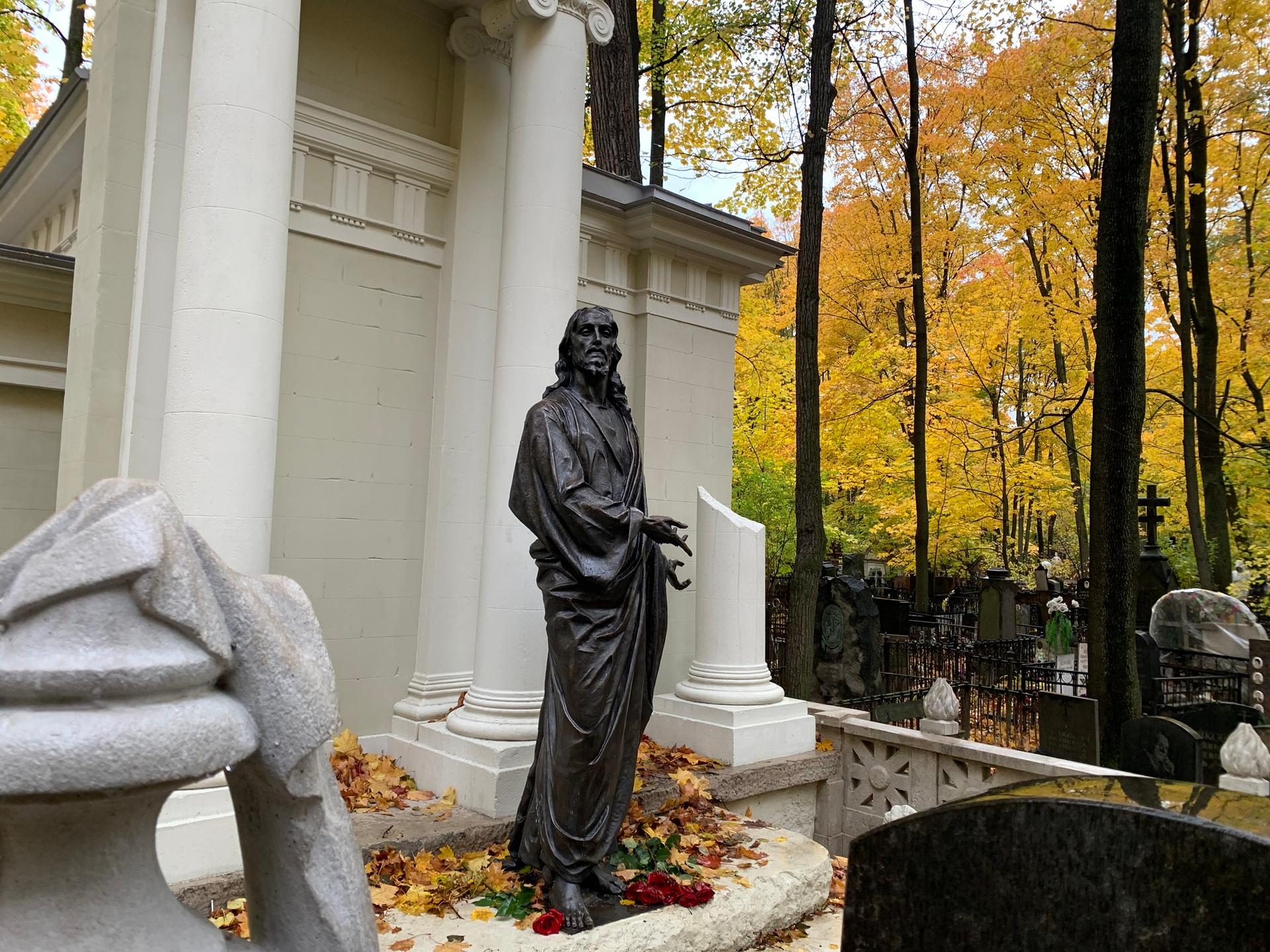 Изначально на стилобате (ступенях, ведущих к памятнику) стояла бронзовая статуя Христа, выполненная во Флоренции известным в то время итальянским скульптором Рафаэлло Романелли. Эта скульптура имела интересную судьбу: в 1940-х годах она была снята со ступеней для прекращения паломничества верующих и долгое время хранилась в различных музеях и храмах, пока не оказалась в Троице-Сергиевой лавре, где находится по сей день.