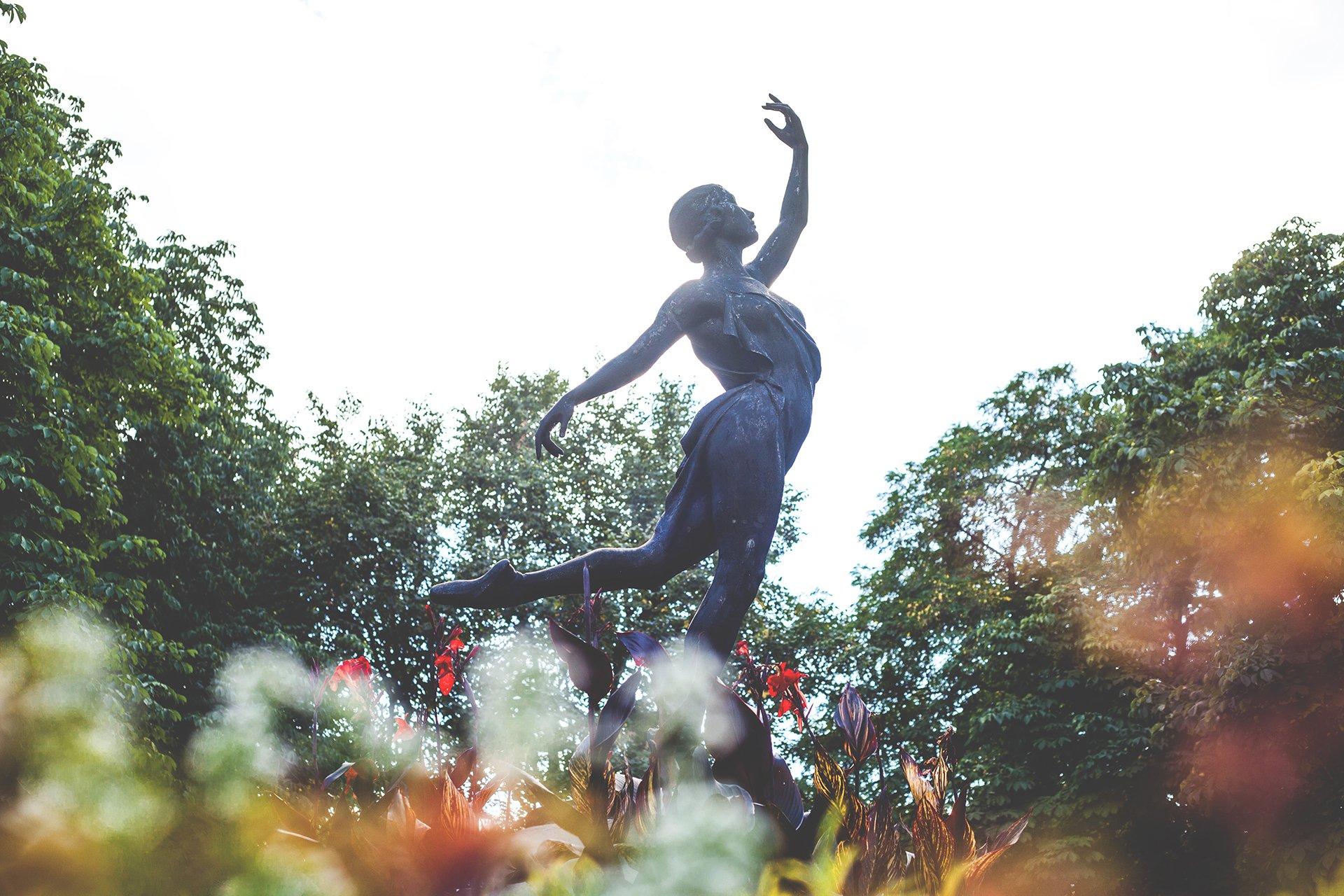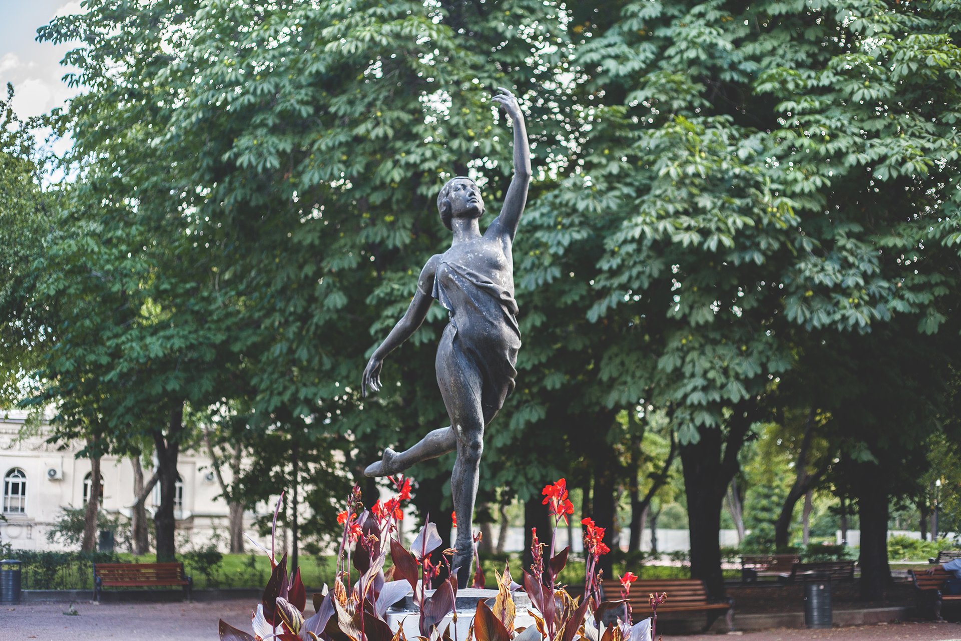 У ограды Парка справа за Главным входом в центре круглой клумбы расположена скульптура «Балерина» (1938 г.), - одна из немногих, сохранившихся до наших дней работ Елены Александровны Янсон-Манизер. Моделью для создания скульптуры «Балерина» стала знаменитая советская балерина, солистка Большого театра Галина Уланова. В 1930-е гг. скульптура «Балерина» находилась на Центральной аллее, а на месте клумбы возвышалось другое легендарное сооружение – Парашютная вышка.