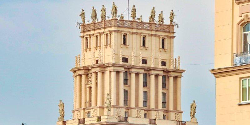 Скульптурную композицию на доме у Калужской заставы признали объектом культурного наследия в августе 2017 года. Фигуры изготовили в мастерской Александра Громова в конце 1940-х годов. Их устанавливали на галерее дома не одномоментно. Сначала достроили и украсили лепным декором башню. Далее поставили обелиски среднего яруса. Вслед за этим на кровле разместили постаменты шестнадцати парных фигур воинов-победителей и встречающих их девушек. Затем установили четыре ростовые фигуры воинов и девушек. Они стоят в гимнастерках, перехваченных армейским ремнем, в высоких сапогах и в юбках по колено. Двое юношей также одеты в гимнастерку, высокие сапоги и брюки-галифе. На головах солдат каски, в руках они держат автоматы. На плечах у юношей и девушек изображена плащ-палатка. На верхнем ярусе зрителям открывается другая картина. Здесь стоят шесть девушек в легких летних платьях с развевающимися на ветру волосами и шесть солдат с заломленными на бок пилотками и стоящими в ногах автоматами.