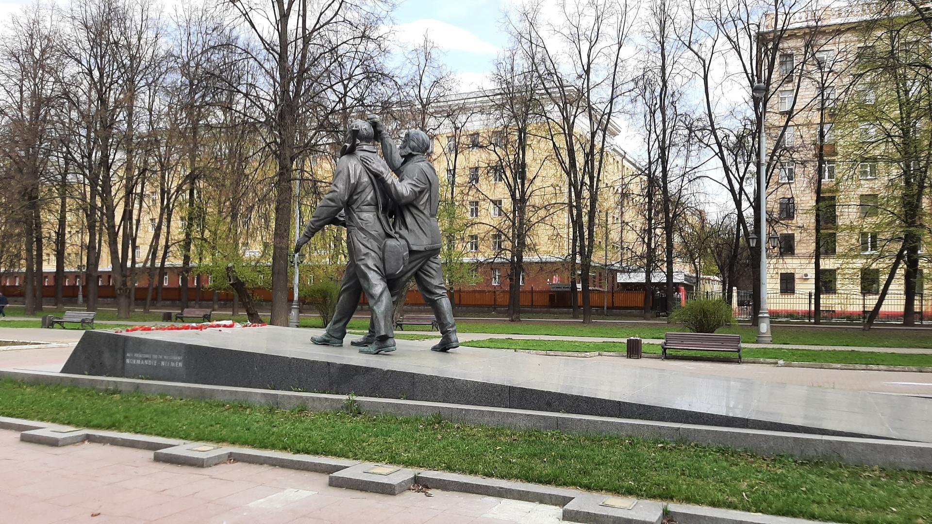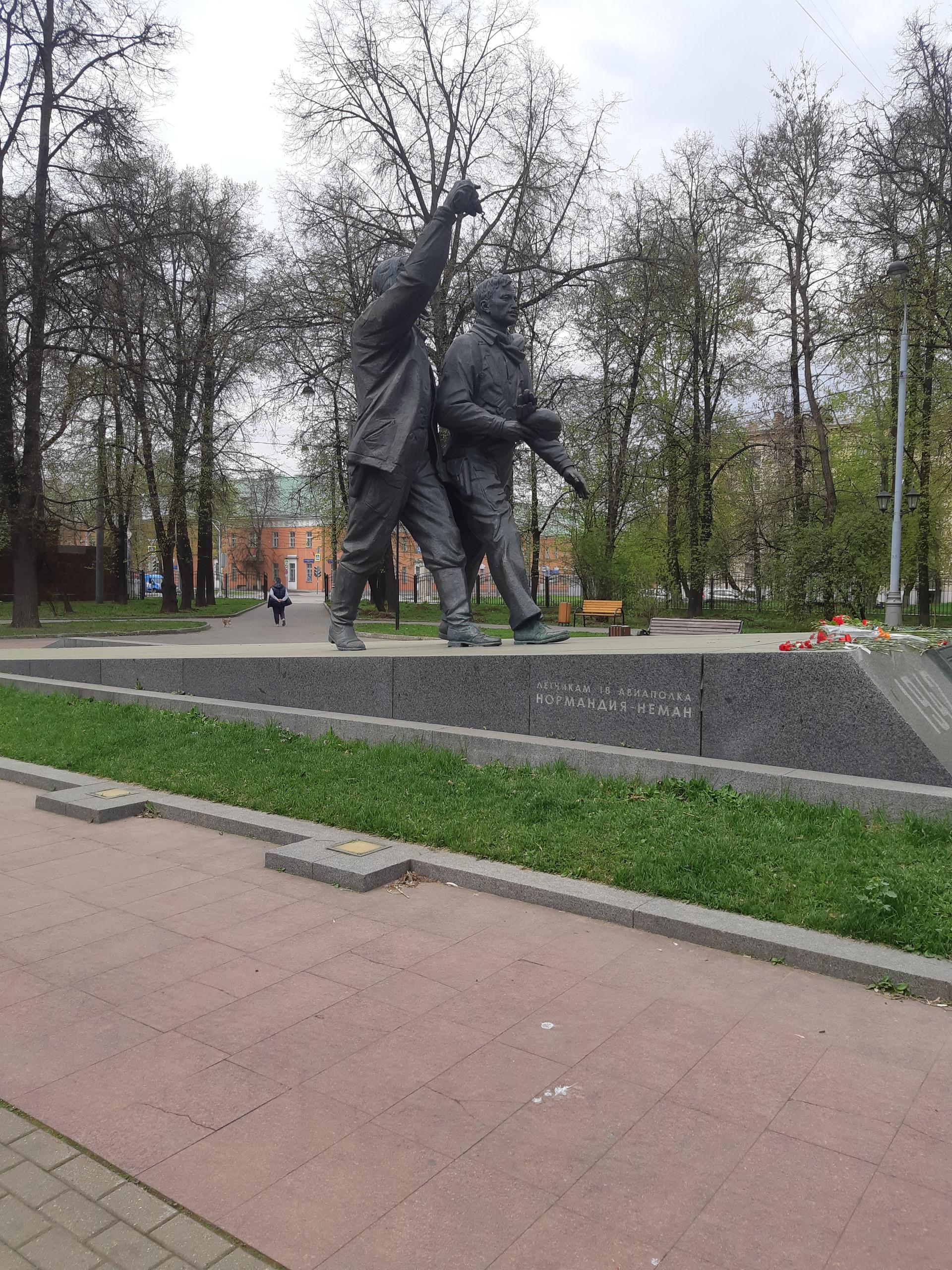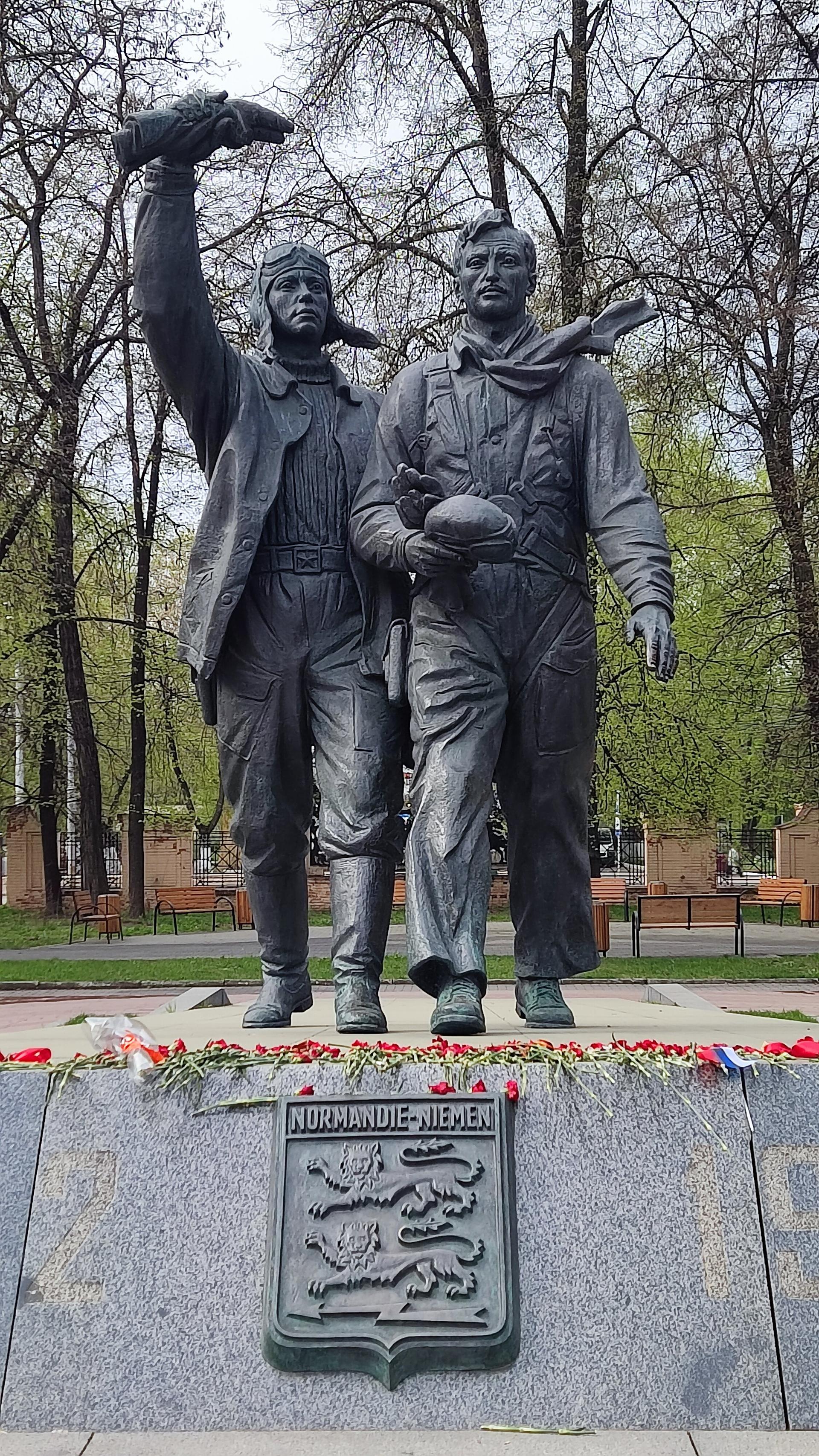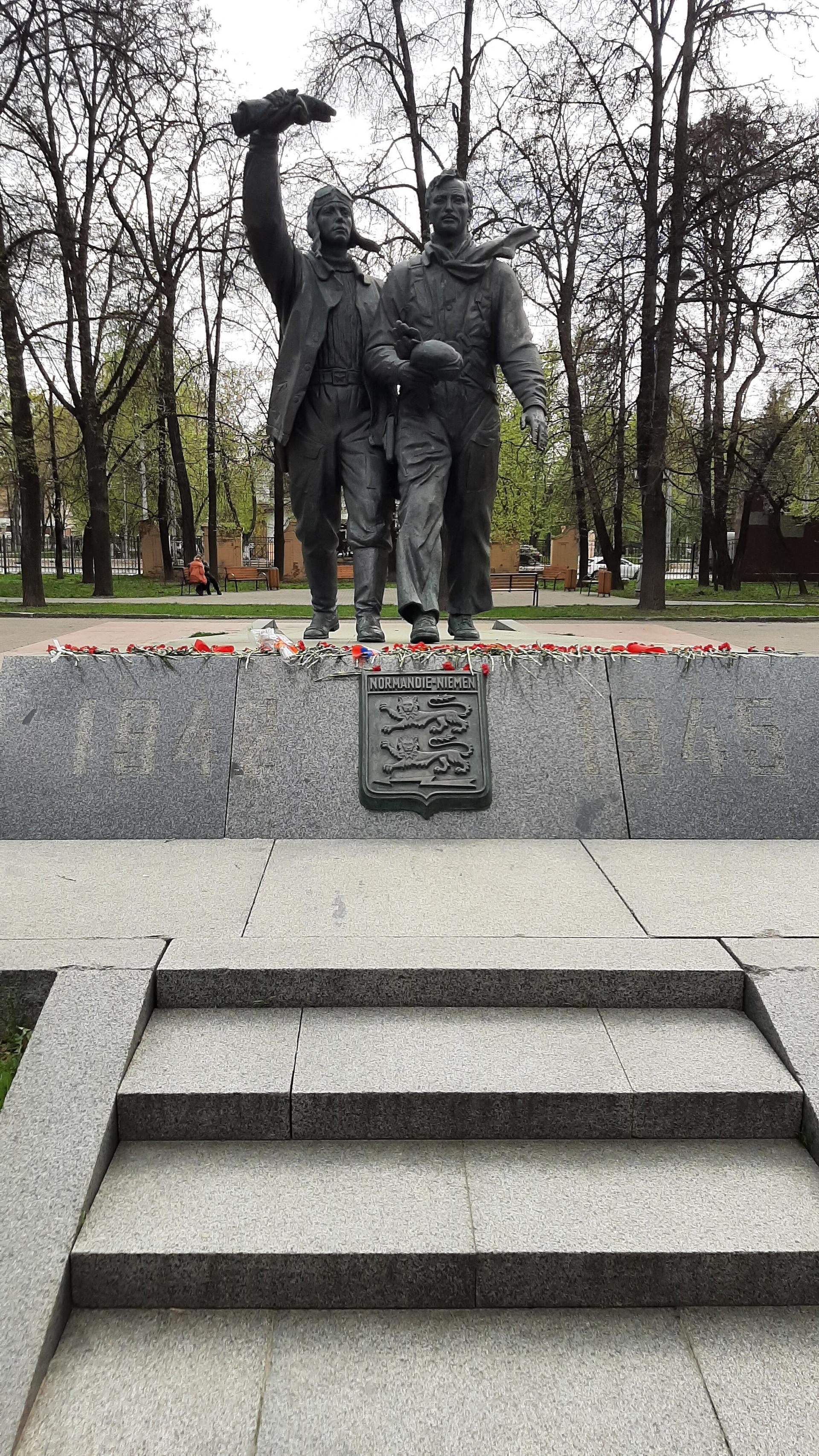 Скульптурная группа изображает идущих вместе французского летчика и советского авиамеханика. Летчик одет в летный комбинезон, на шее у него развевается шарф, авиамеханик в летном костюме. Постамент облицован серым полированным гранитом, на северо-восточном фасаде в центре расположен бронзовый опознавательный знак авиаполка, слева и справа от знака нанесены надписи методом неглубокой резки с шлифованным внутренним фоном: 1942-1945.