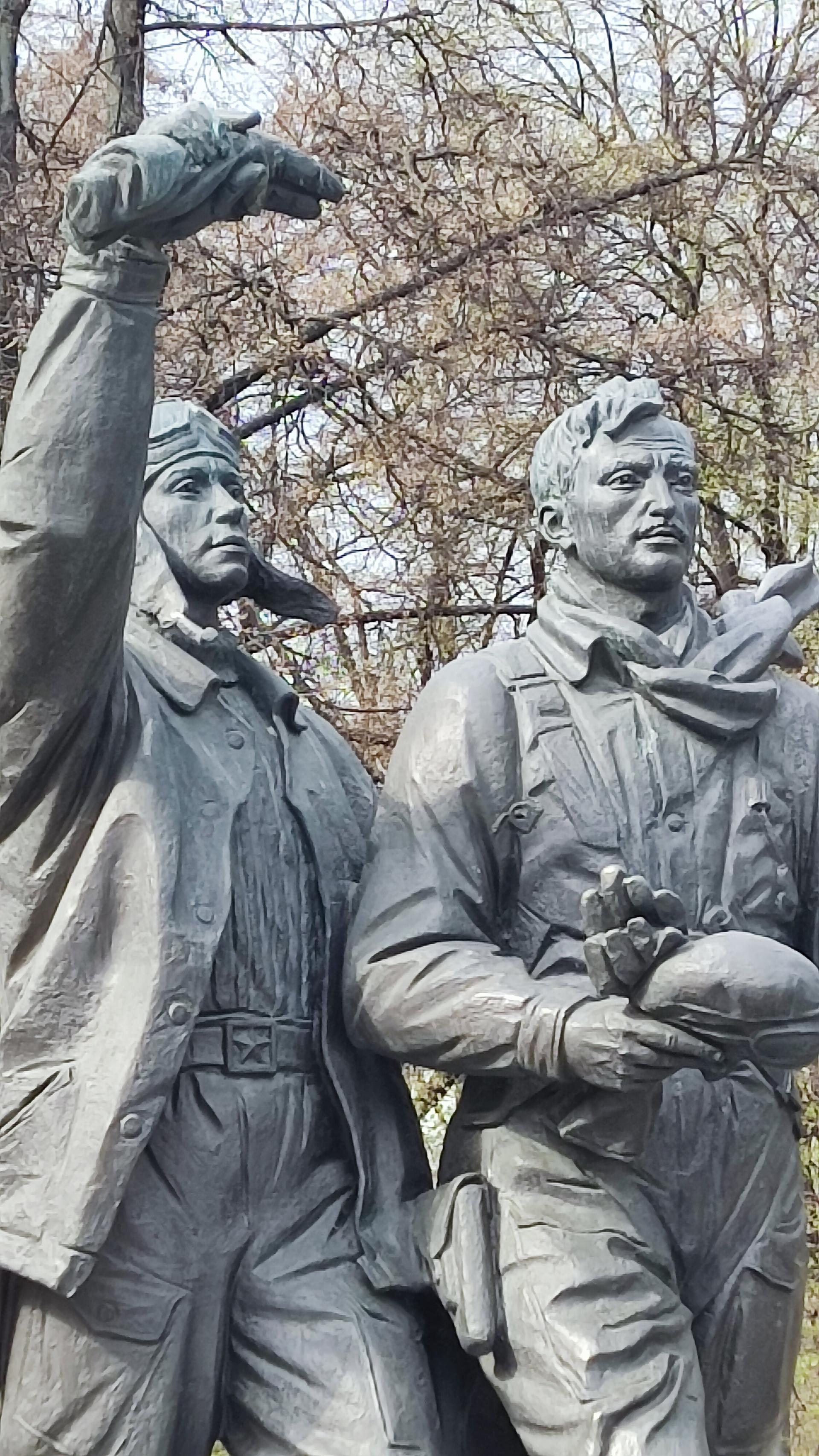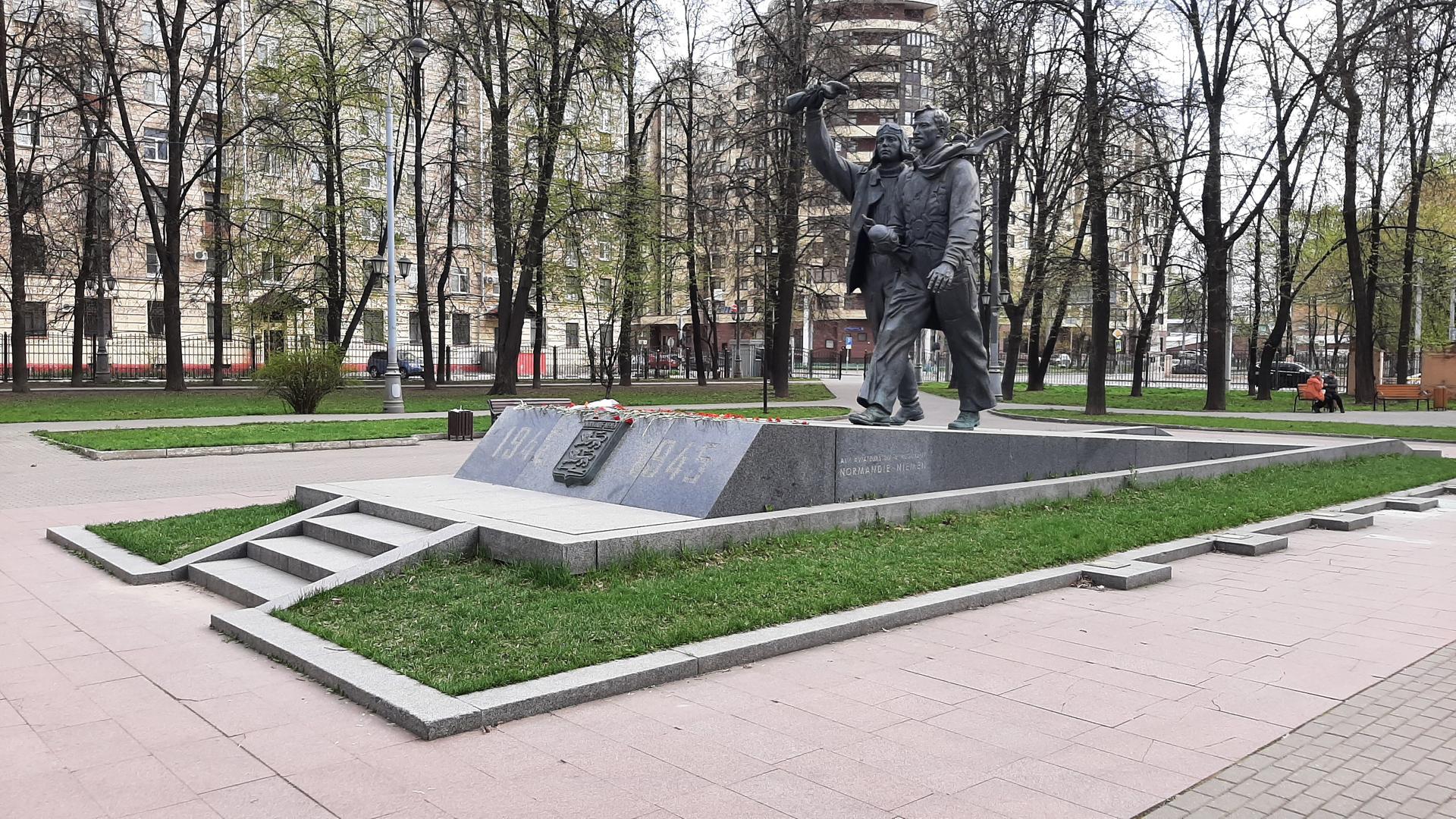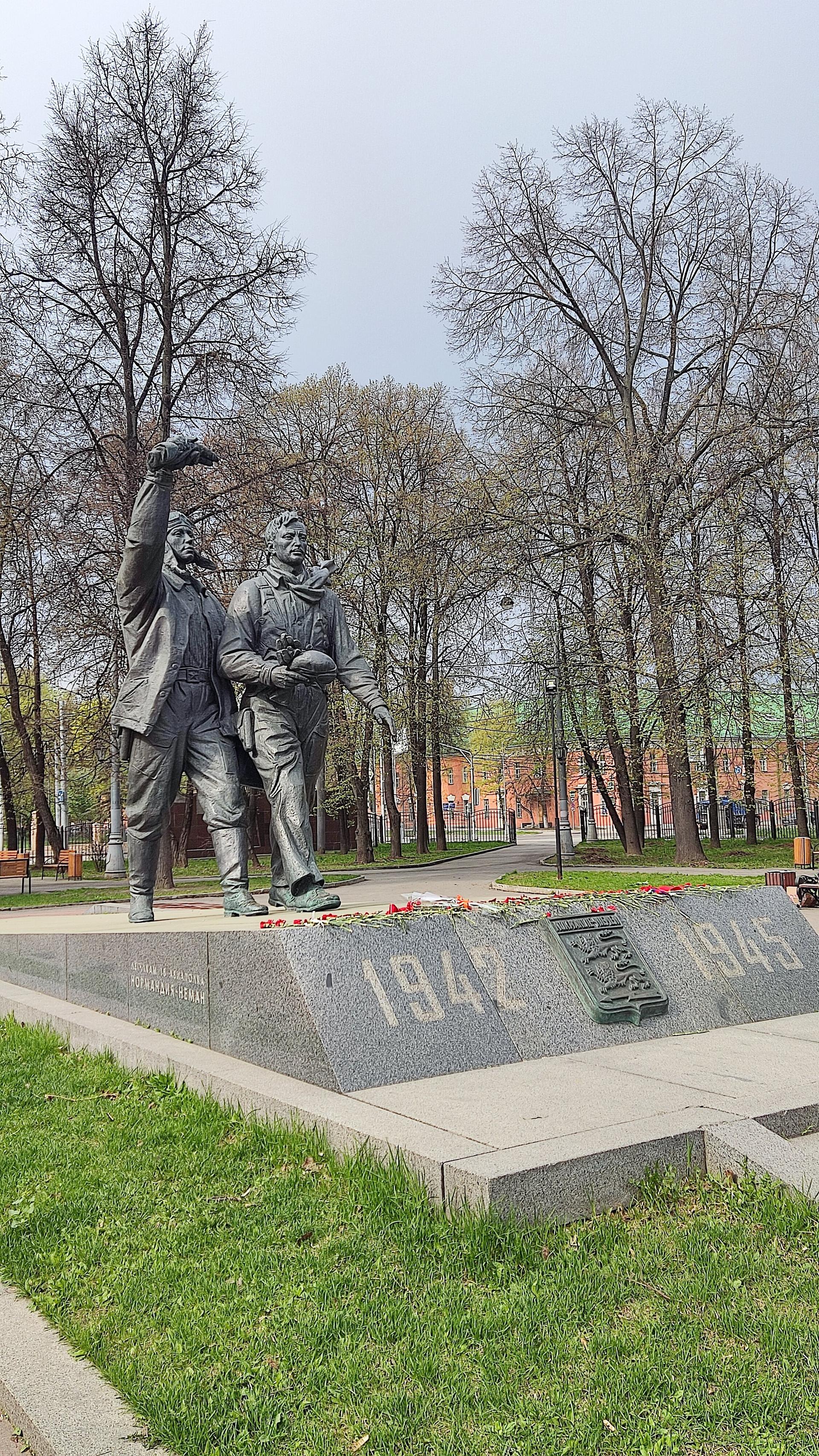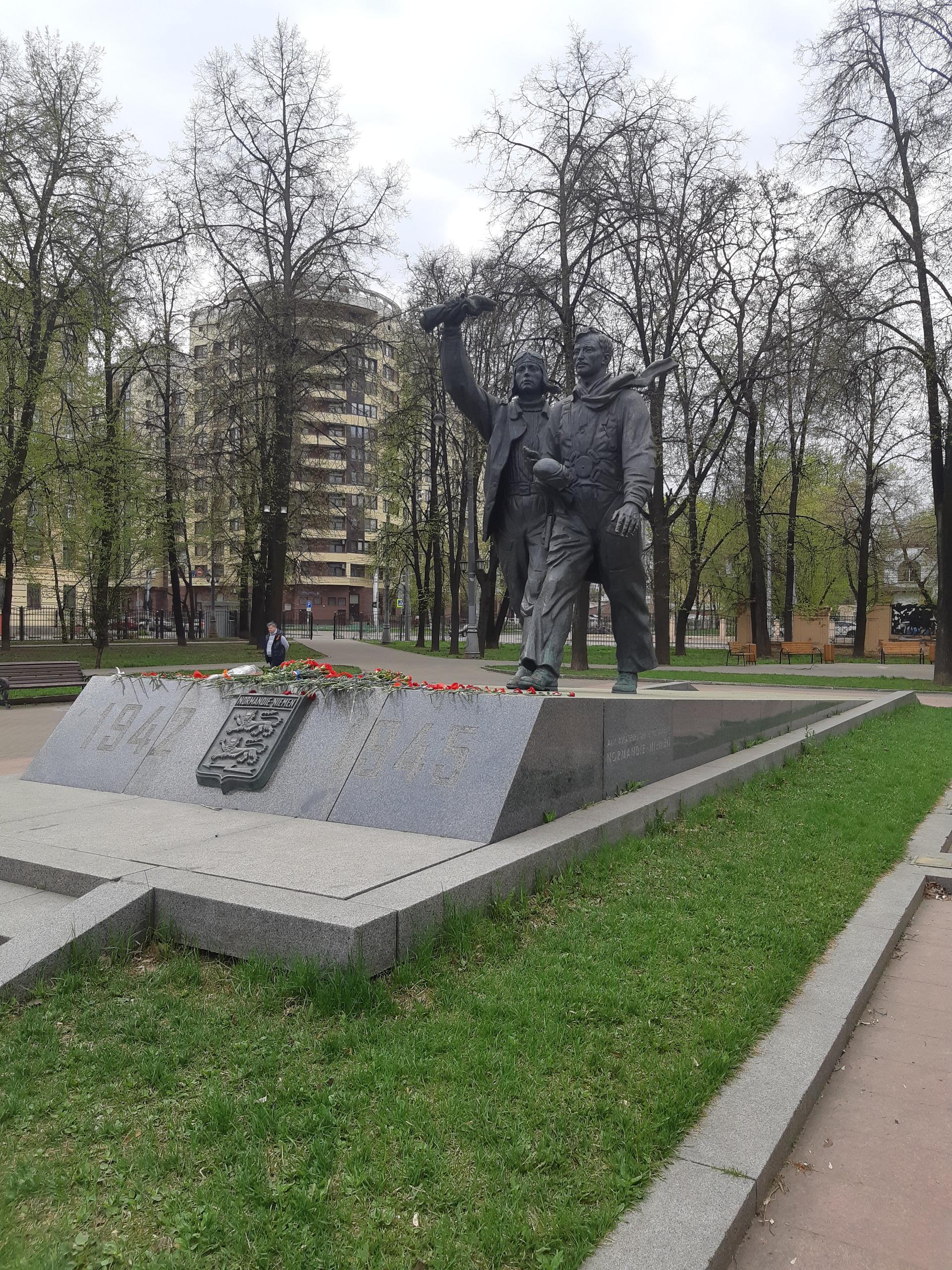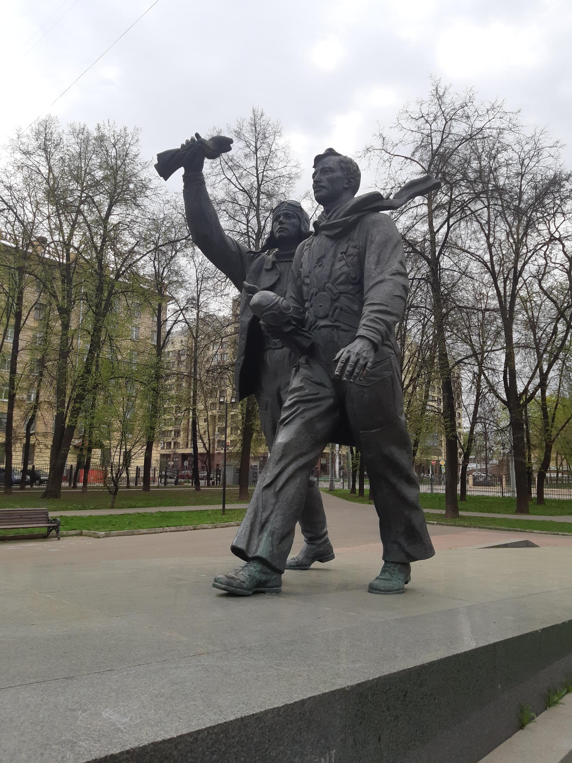 Скульптурная группа изображает идущих вместе французского летчика и советского авиамеханика. Летчик одет в летный комбинезон, на шее у него развевается шарф, авиамеханик в летном костюме. Постамент облицован серым полированным гранитом, на северо-восточном фасаде в центре расположен бронзовый опознавательный знак авиаполка, слева и справа от знака нанесены надписи методом неглубокой резки с шлифованным внутренним фоном: 1942-1945.