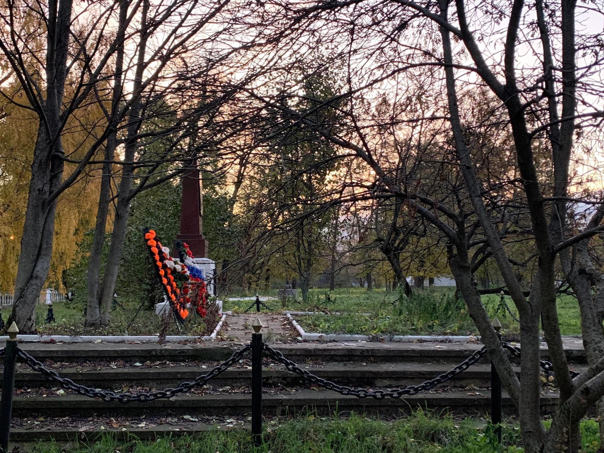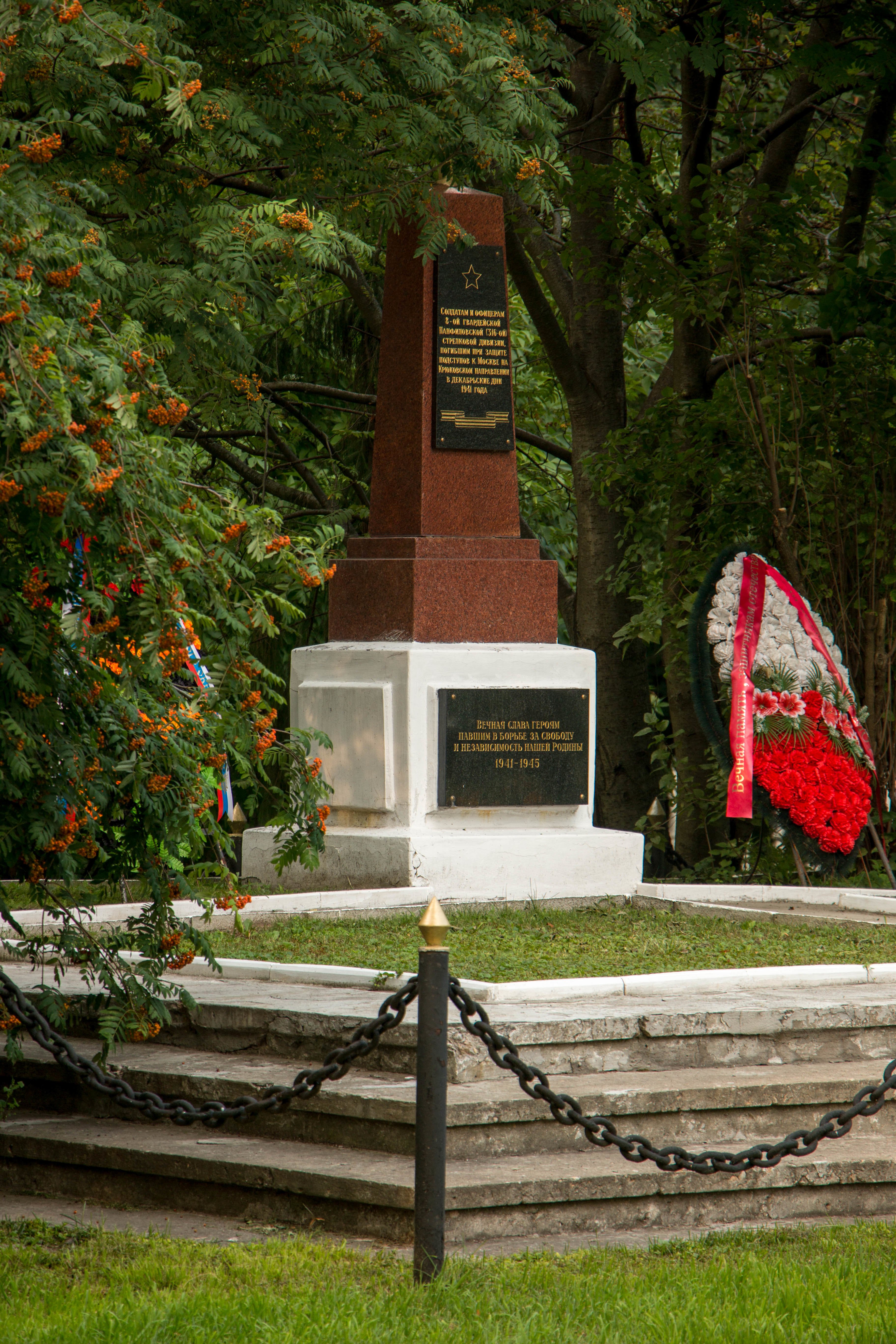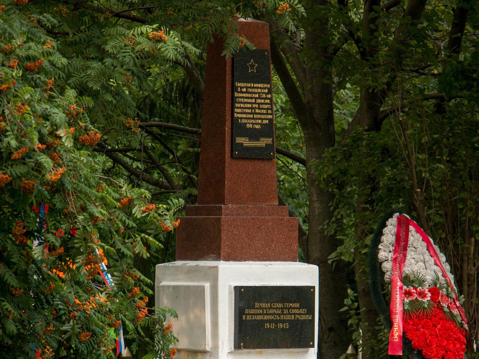 Памятник представляет собой обелиск с навершием в виде скульптурного изображения пятиконечной звезды. Обелиск из красного полированного гранита установлен на постаменте. Посвятительная надпись на обелиске вырезана позолоченными буквами: «Солдатам и офицерам 8-й гвардейской Панфиловской (316-й) стрелковой дивизии, погибшим при защите подступов к Москве на Крюковском направлении в декабрьские дни 1941 г.».