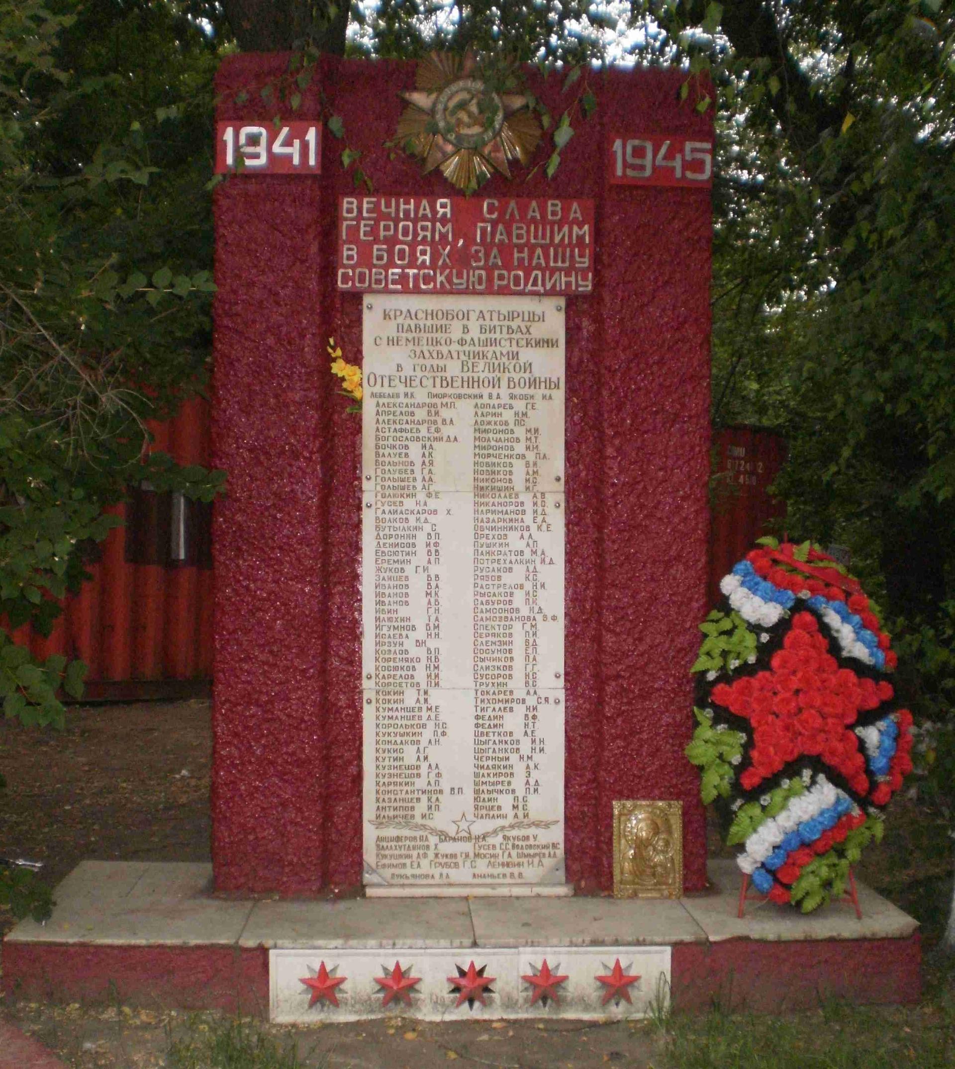 Ниже на мраморной доске белого цвета перечислены имена 102 рабочих и служащих завода «Красный богатырь», погибших в годы ВОВ. На постаменте закреплен металлический декоративный элемент — пять накладных пятиконечных звезд и столько же сквозных пятиконечных звезд.