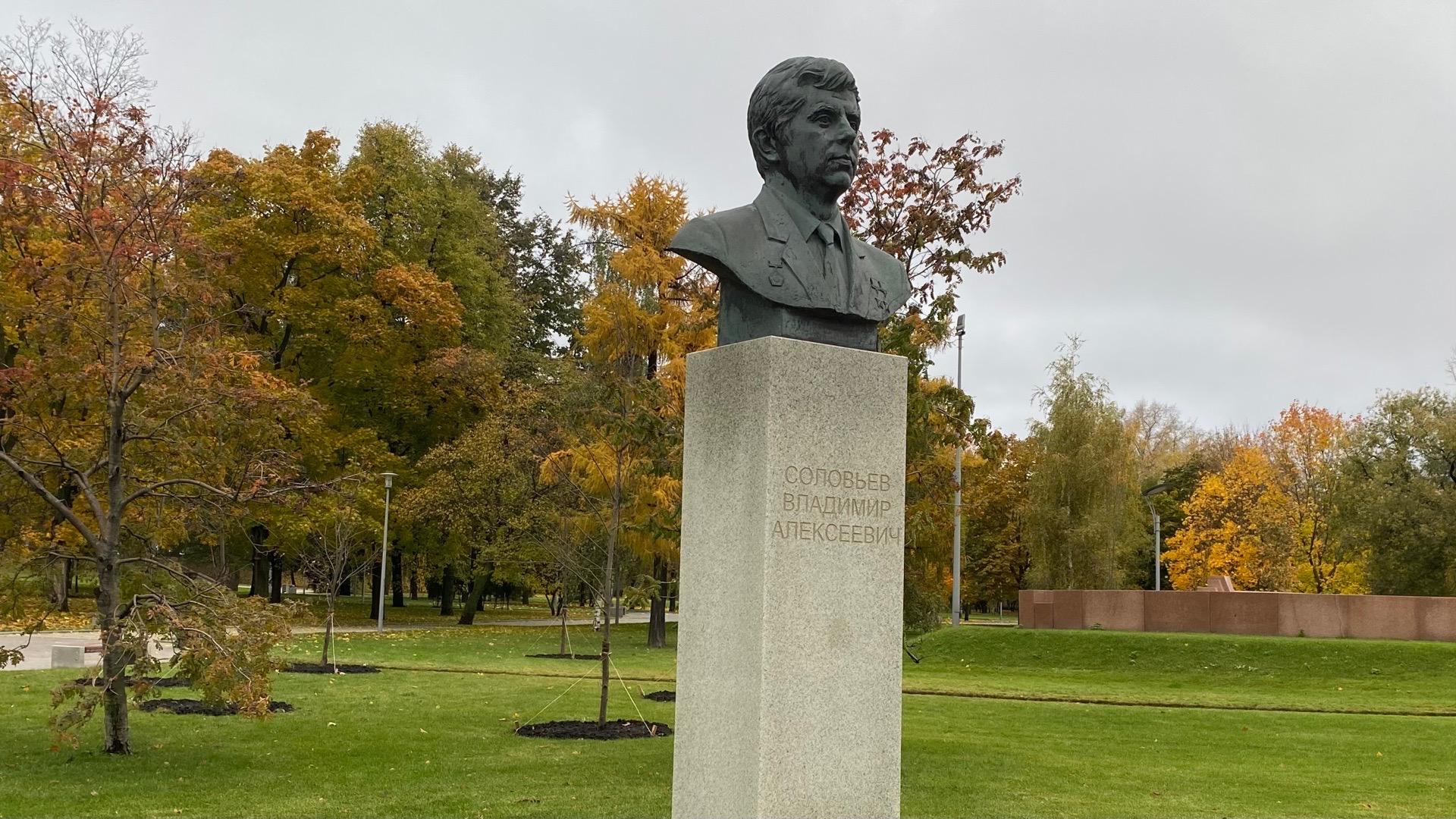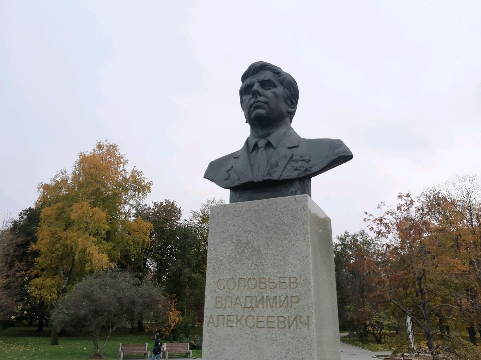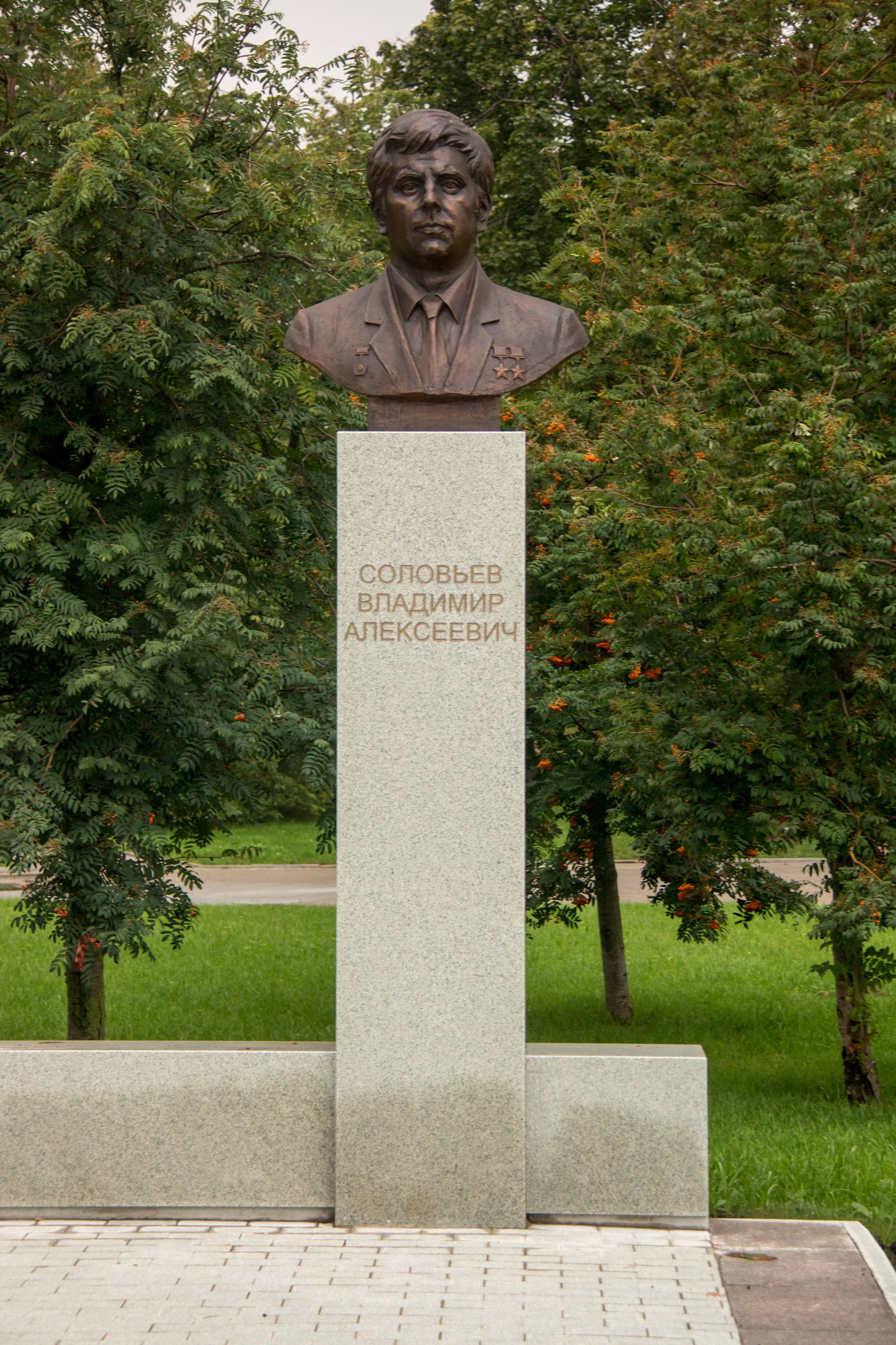 В. А. Соловьев изображен погрудно, бронзовый бюст установлен на гранитный постамент, соединен гранитным основанием с тремя другими бюстами героев-космонавтов (С. Е. Савицкой, В. В. Лебедева, А. П. Александрова).