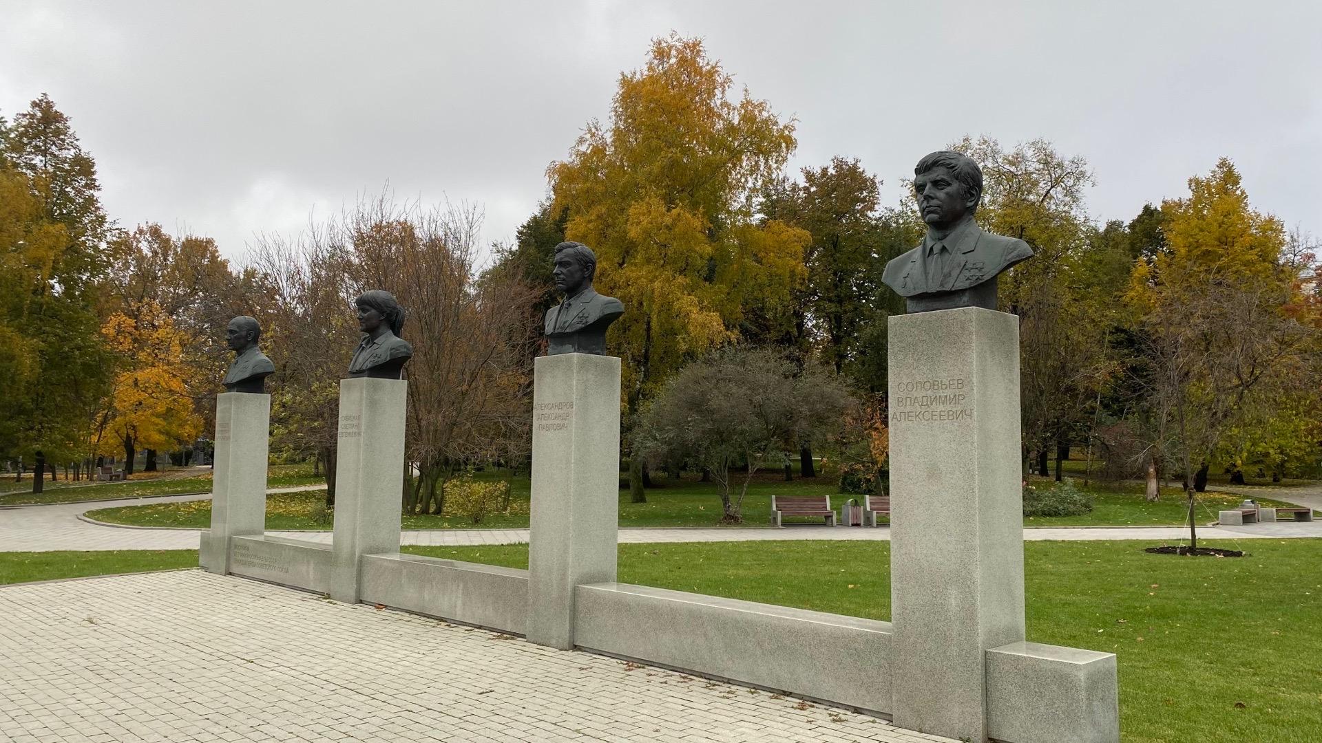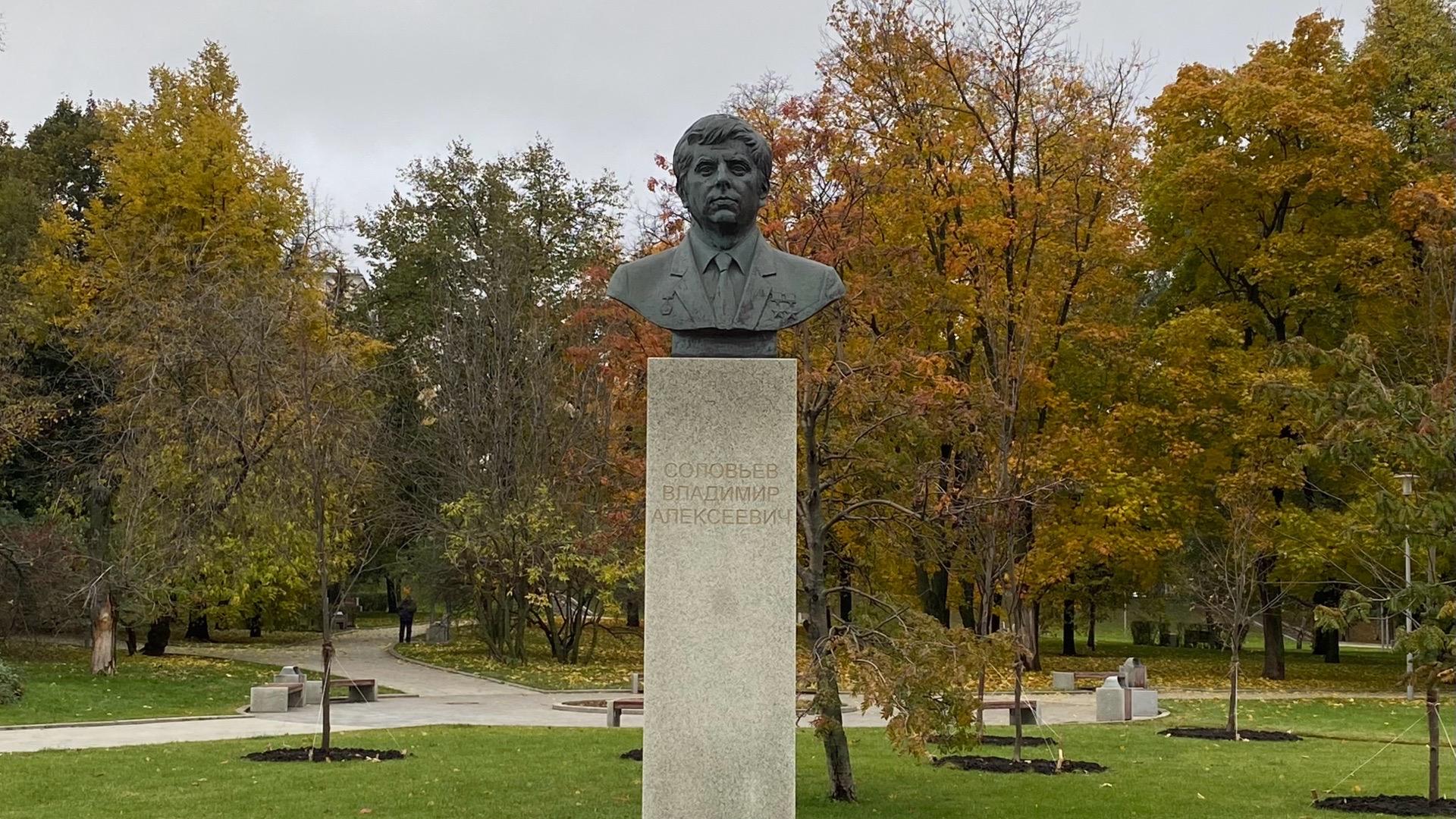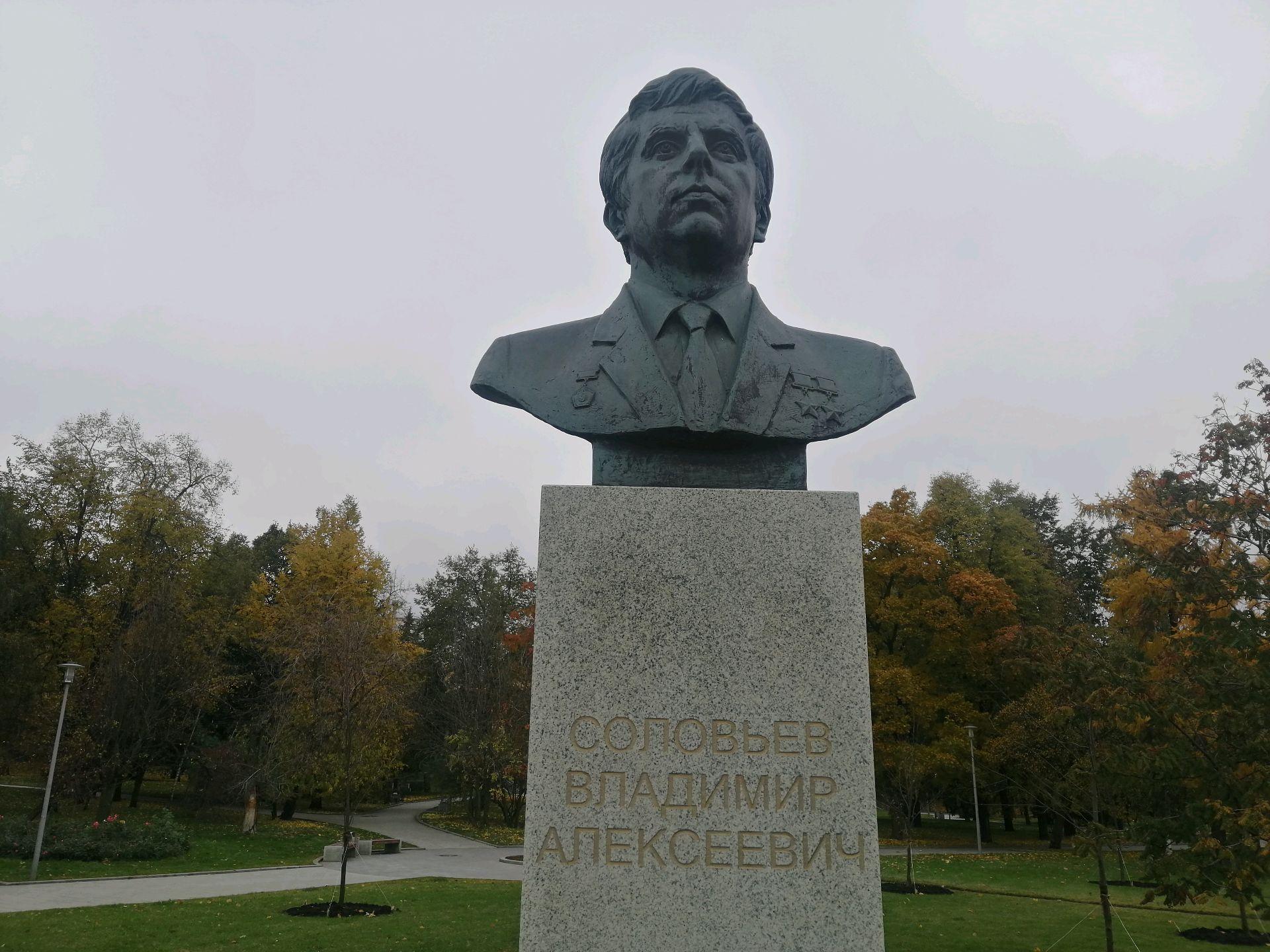 В. А. Соловьев изображен погрудно, бронзовый бюст установлен на гранитный постамент, соединен гранитным основанием с тремя другими бюстами героев-космонавтов (С. Е. Савицкой, В. В. Лебедева, А. П. Александрова).