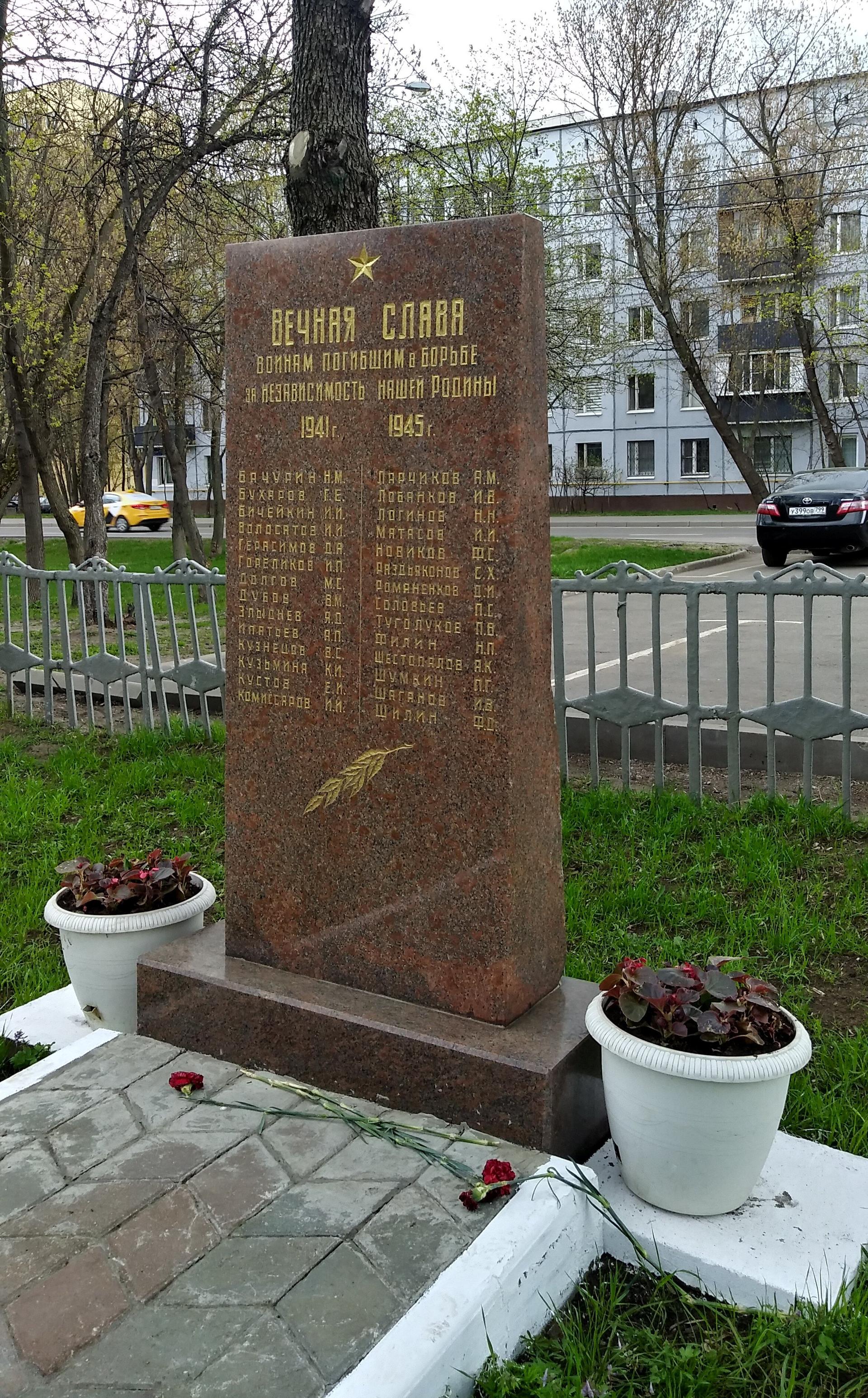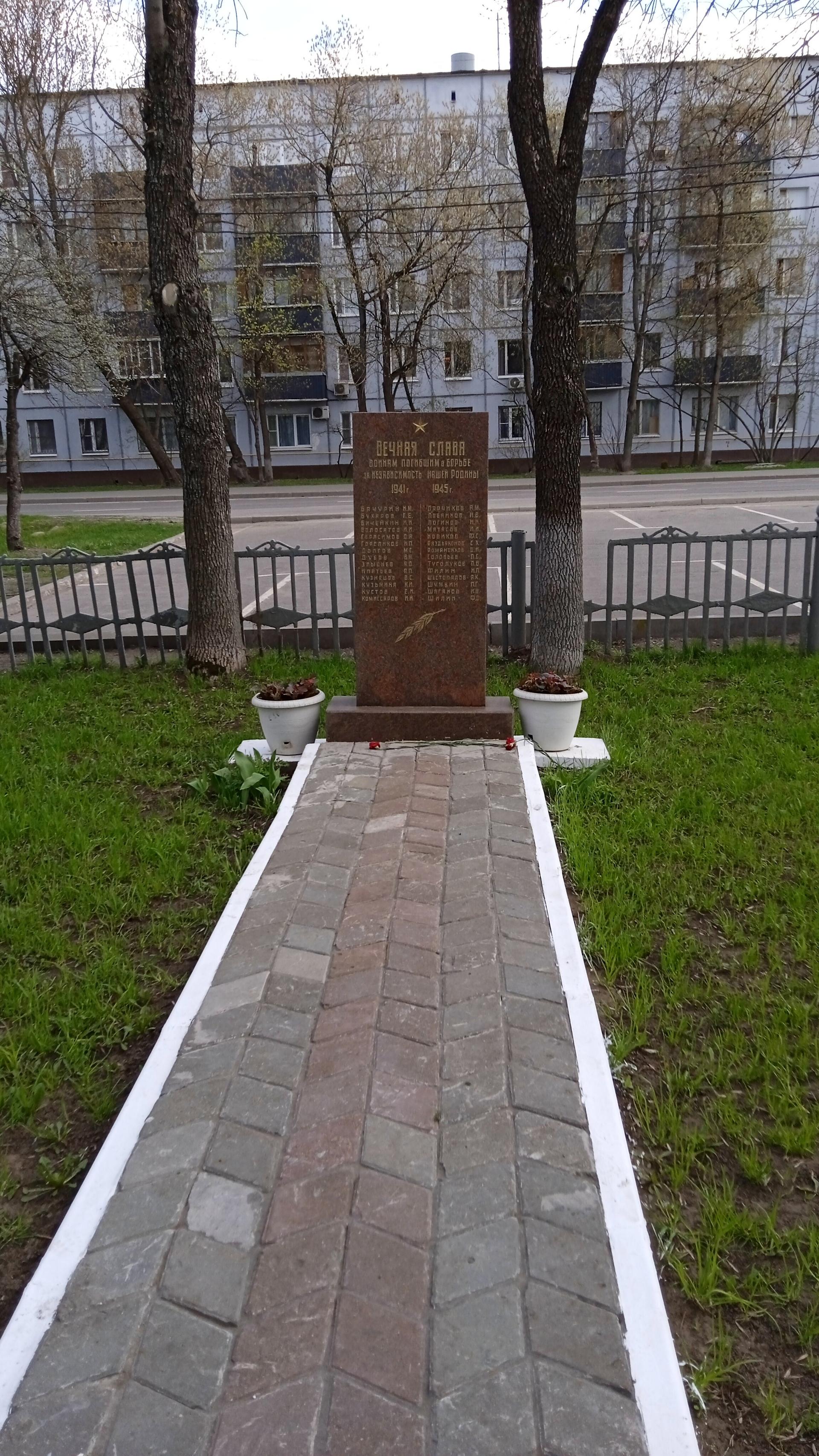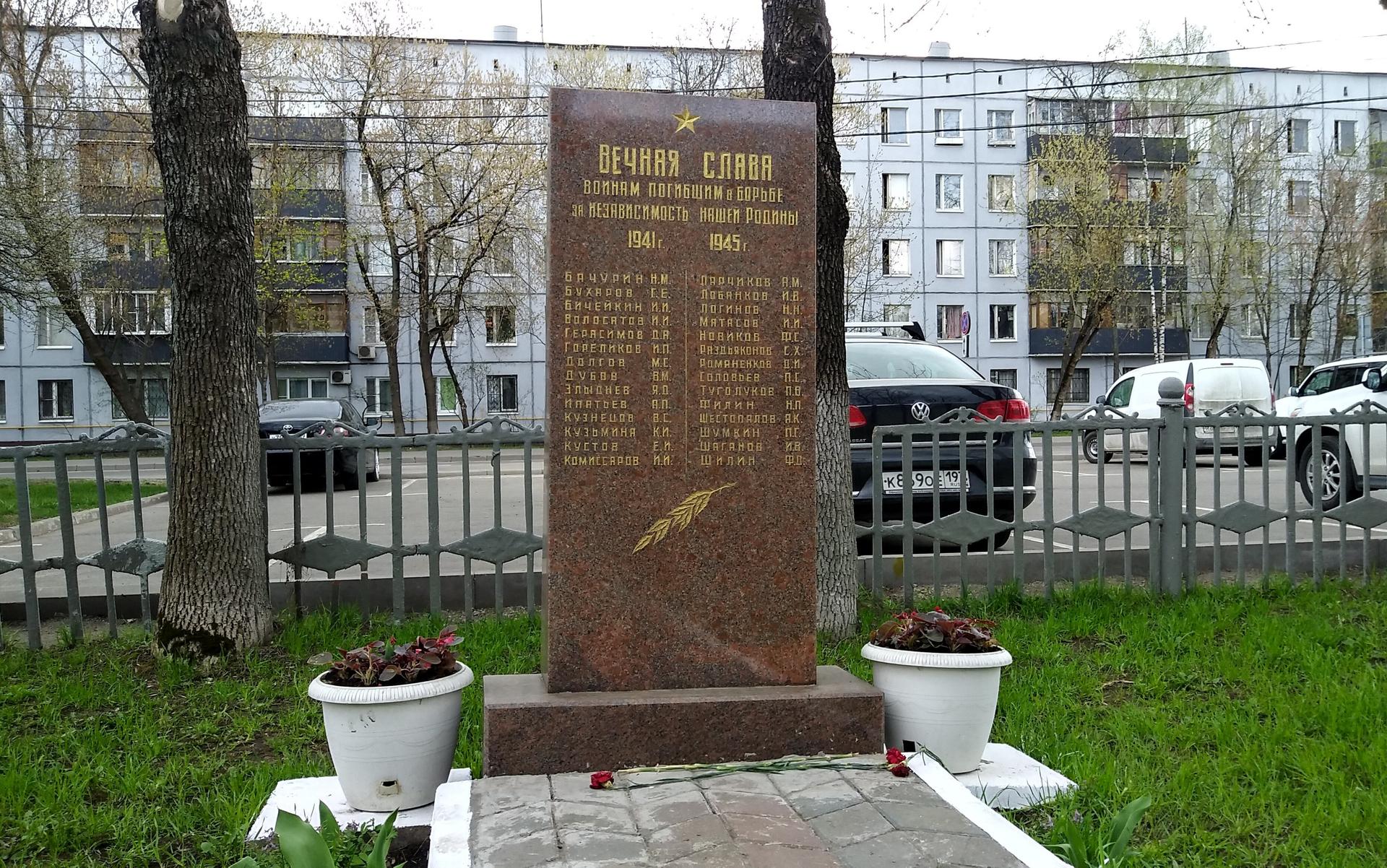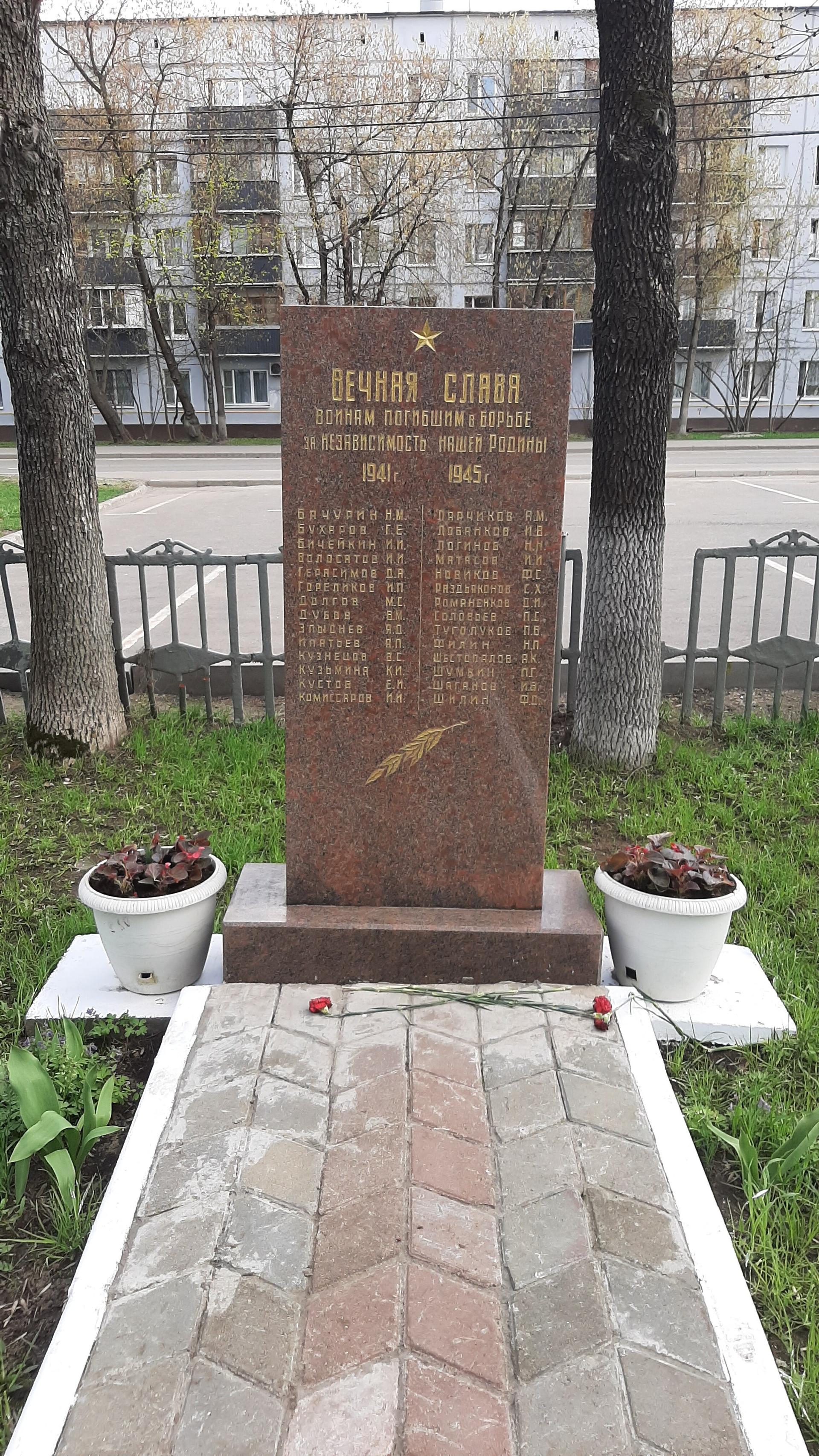 Памятный знак представляет собой стелу, выполненную из полированного красного гранита и установленную на гранитном постаменте. На фронтальной поверхности стелы в верхней части прорезным орнаментом исполнено изображение пятиконечной звезды и посвятительная надпись: «Вечная слава воинам, погибшим в борьбе за независимость нашей Родины. 1941-1945 гг.» — и перечислены фамилии 28 погибших сотрудников. Ниже — изображение лавровой ветви. Поверхность букв позолочена.