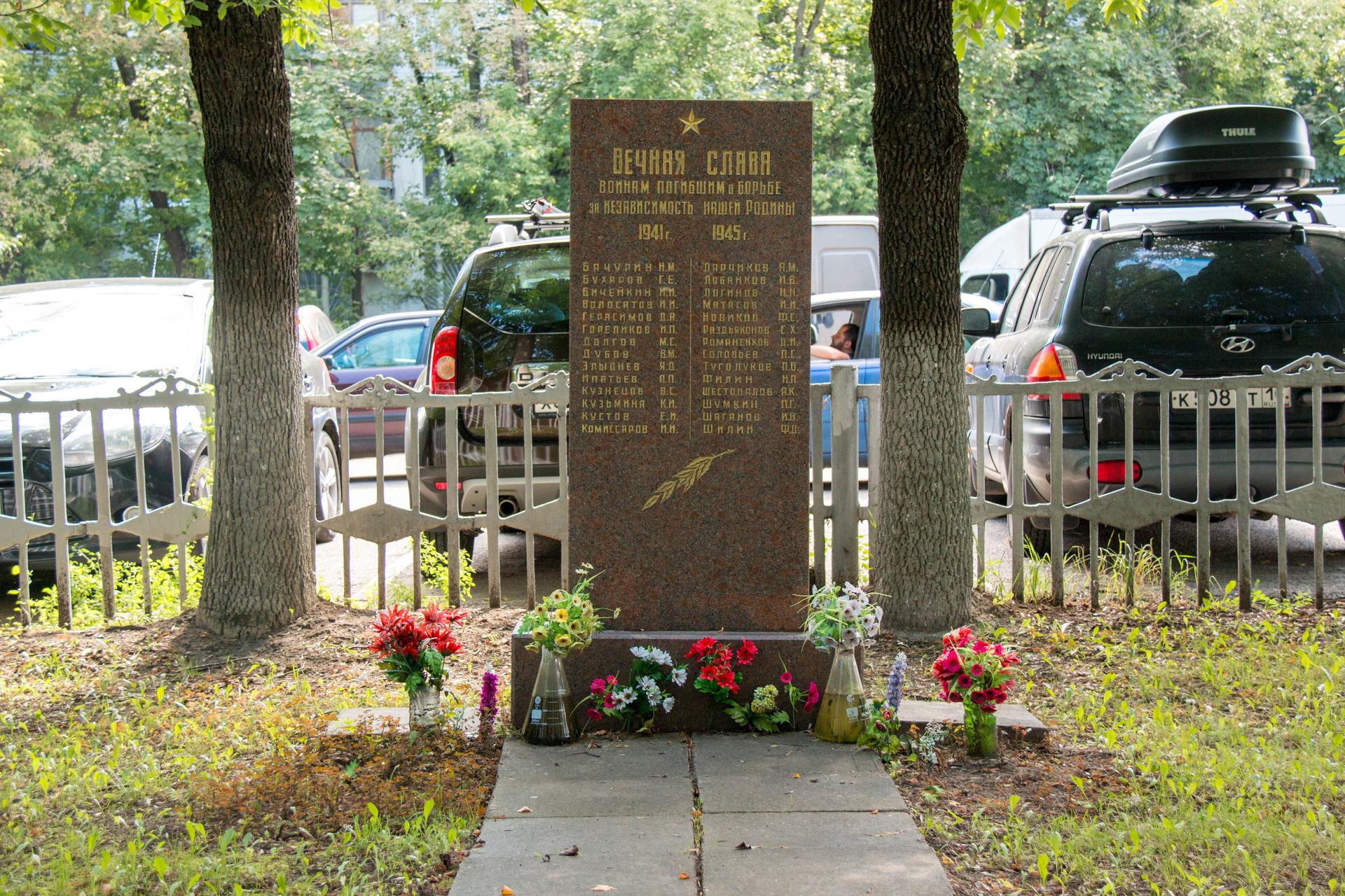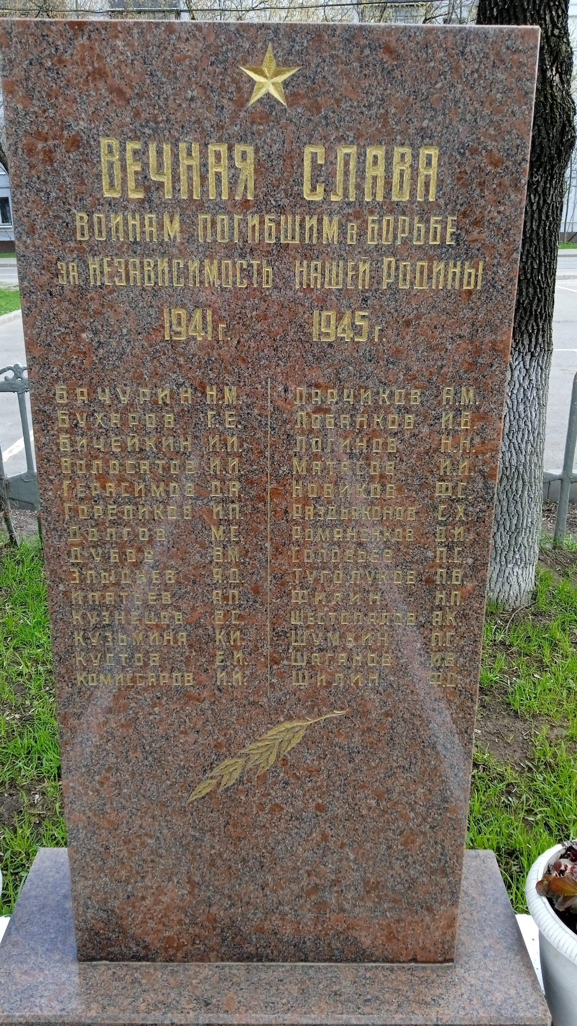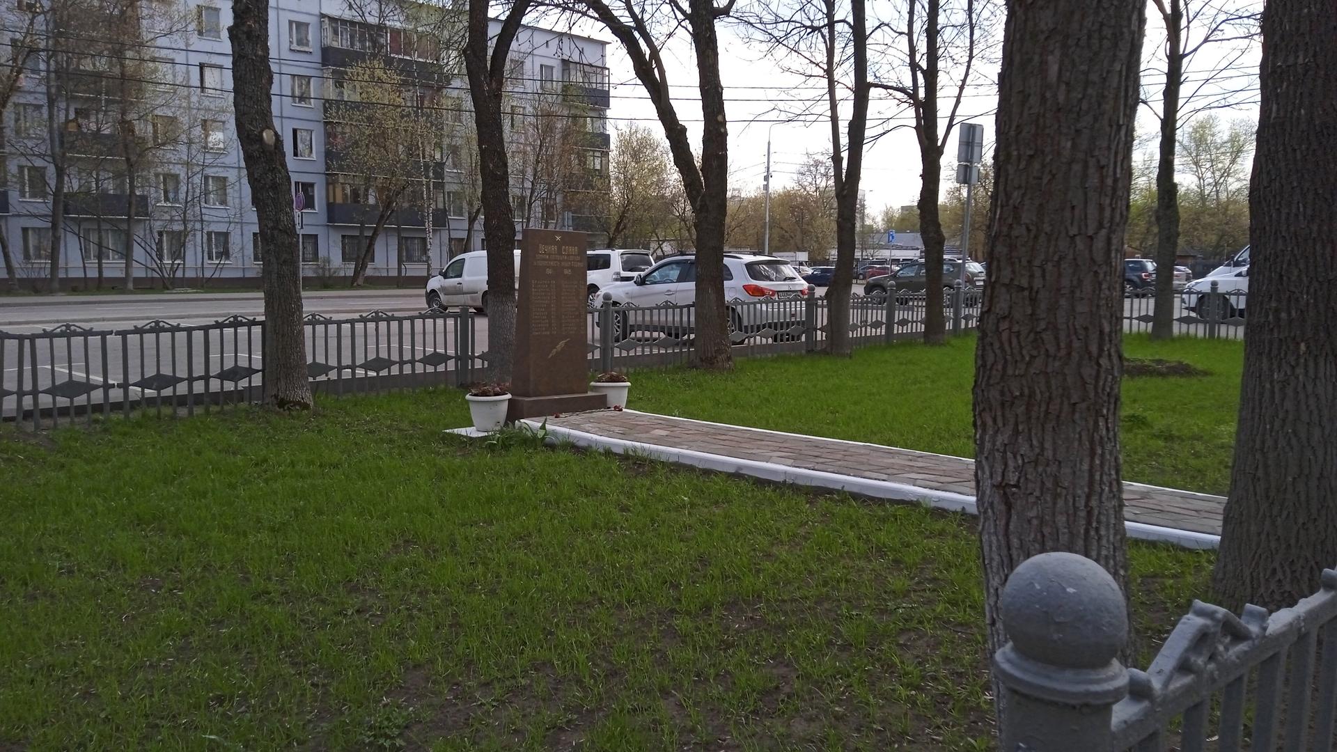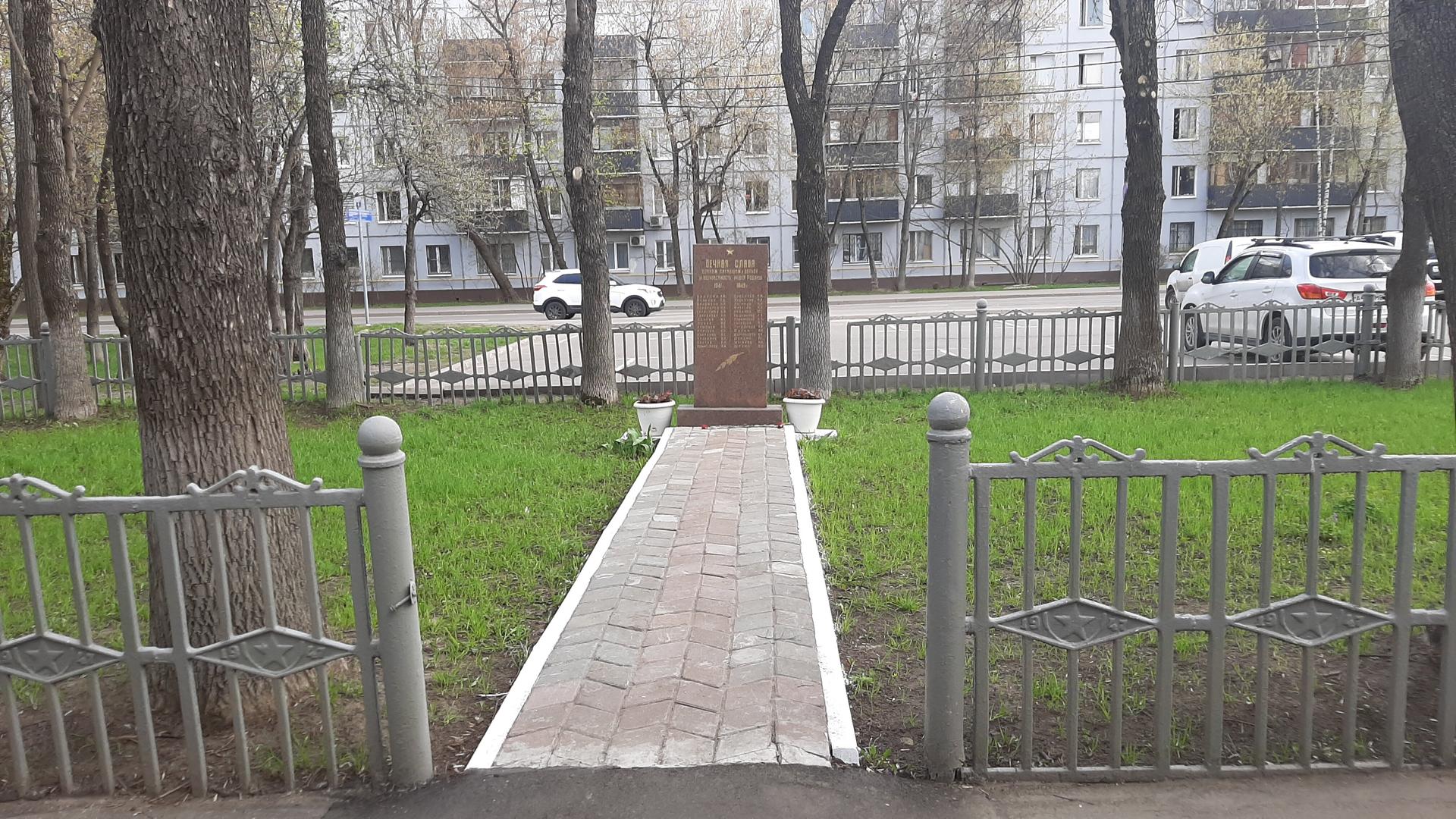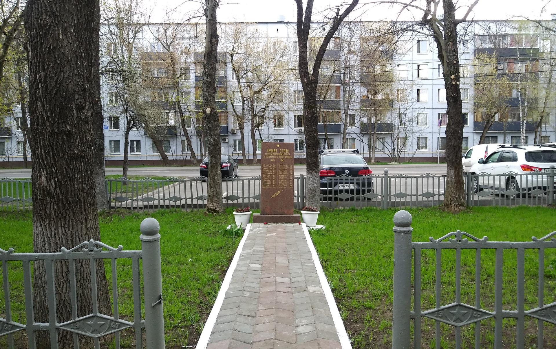 Памятный знак представляет собой стелу, выполненную из полированного красного гранита и установленную на гранитном постаменте. На фронтальной поверхности стелы в верхней части прорезным орнаментом исполнено изображение пятиконечной звезды и посвятительная надпись: «Вечная слава воинам, погибшим в борьбе за независимость нашей Родины. 1941-1945 гг.» — и перечислены фамилии 28 погибших сотрудников. Ниже — изображение лавровой ветви. Поверхность букв позолочена.