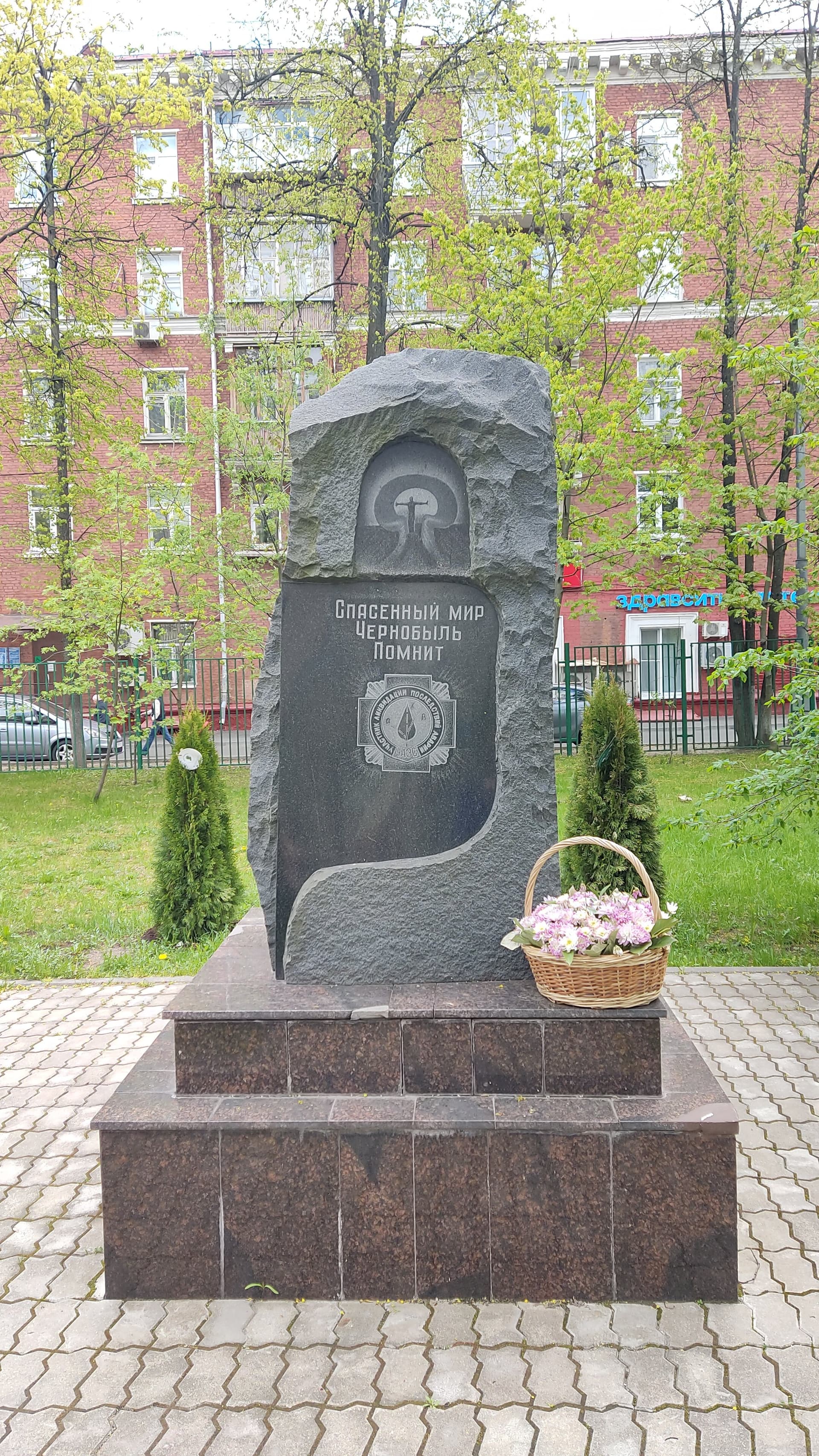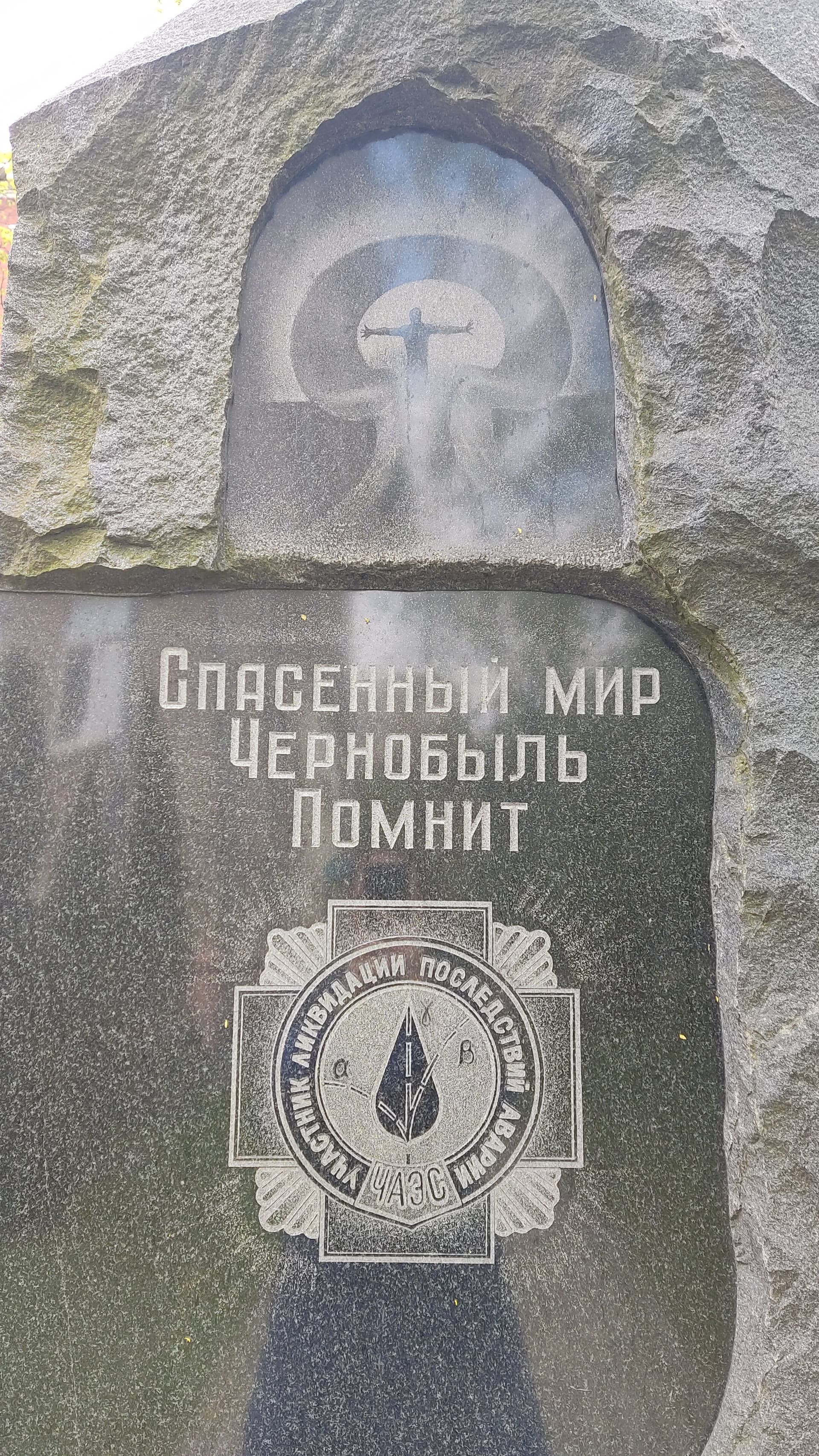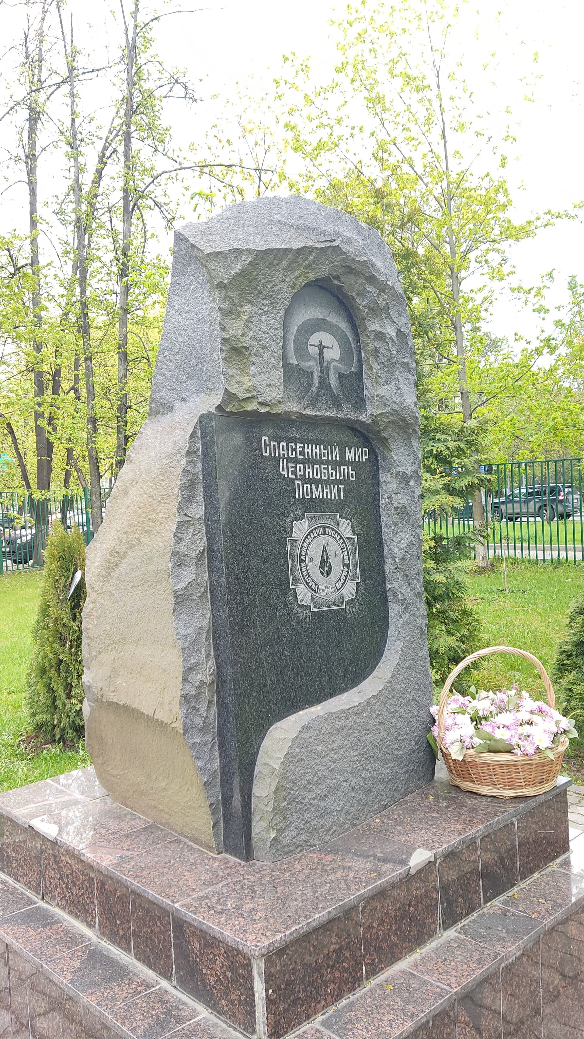 Памятный знак представляет собой блок необработанного гранита. На фасаде блока установлена гранитная плита, в верхней части которой нанесено изображение человеческой фигуры, разводящей руки в стороны, на фоне ядерного гриба. Фигура как бы заслоняет собой зрителя от взрыва. Ниже — памятная надпись: «Спасенный мир Чернобыль помнит», под ней изображение медали-креста участникам ликвидации последствий аварии на ЧАЭС.