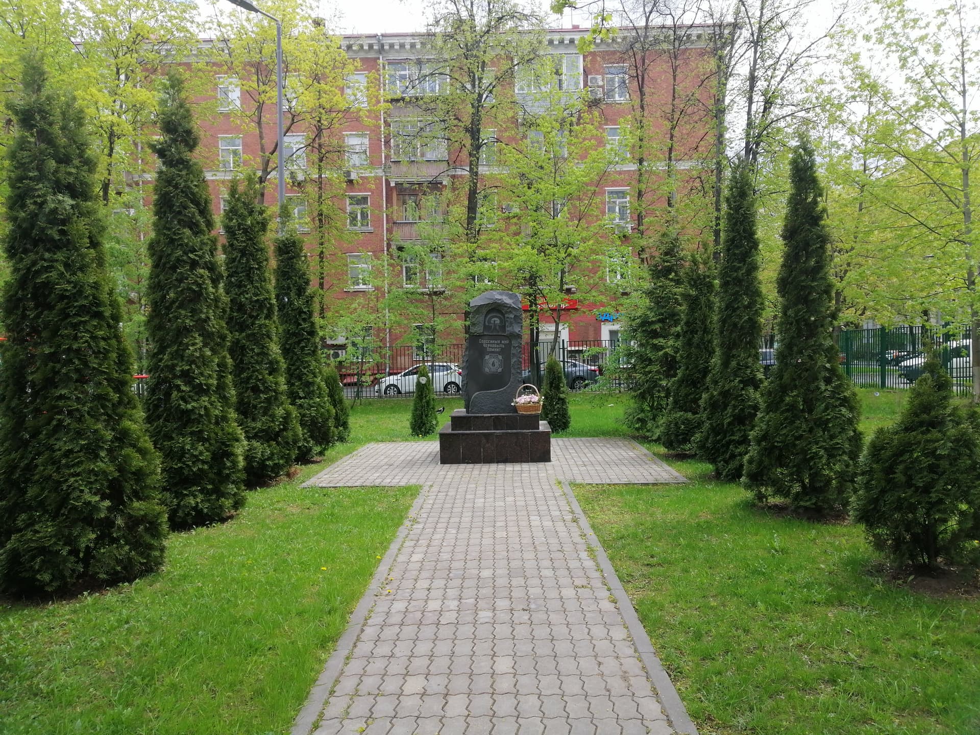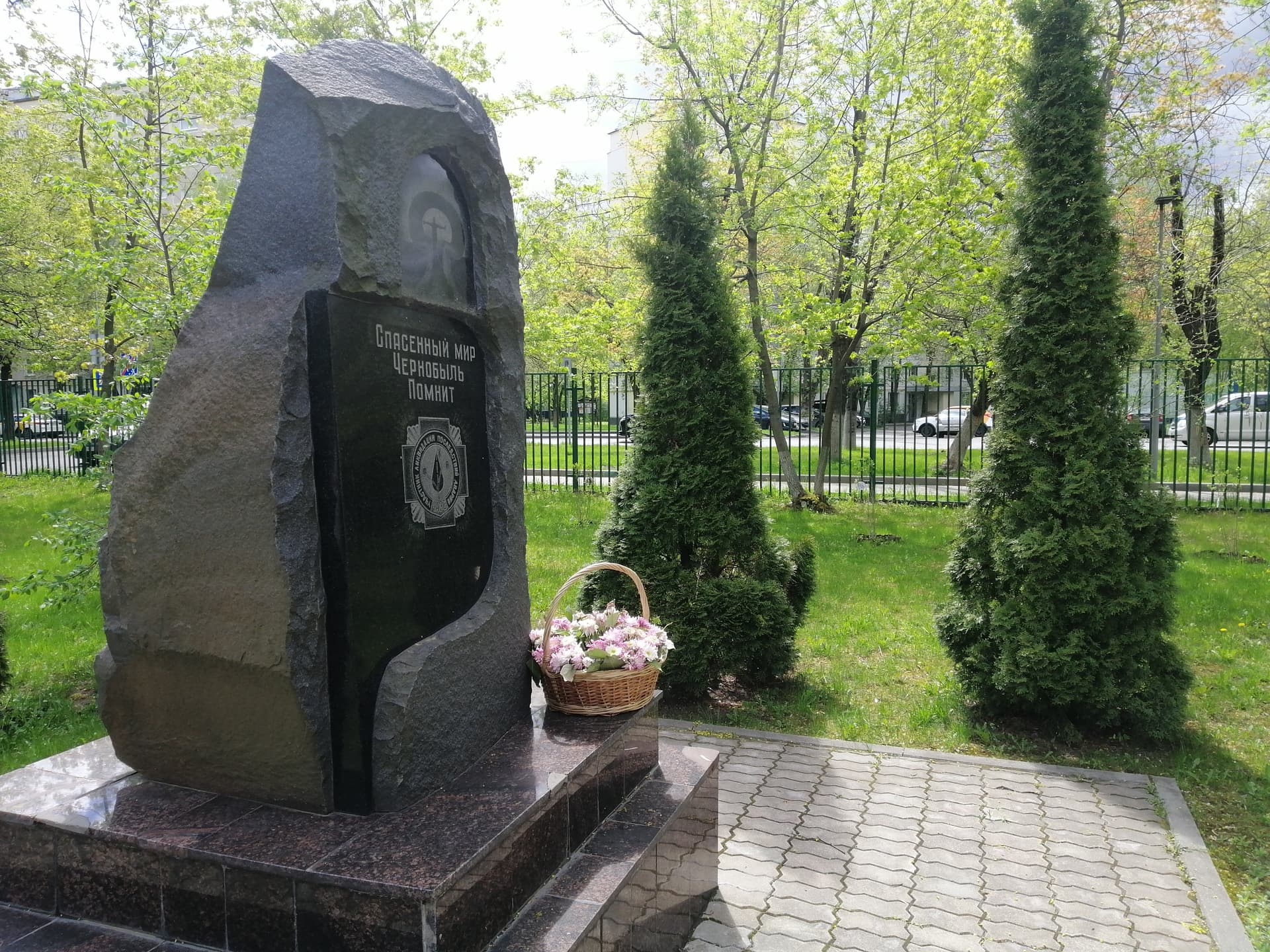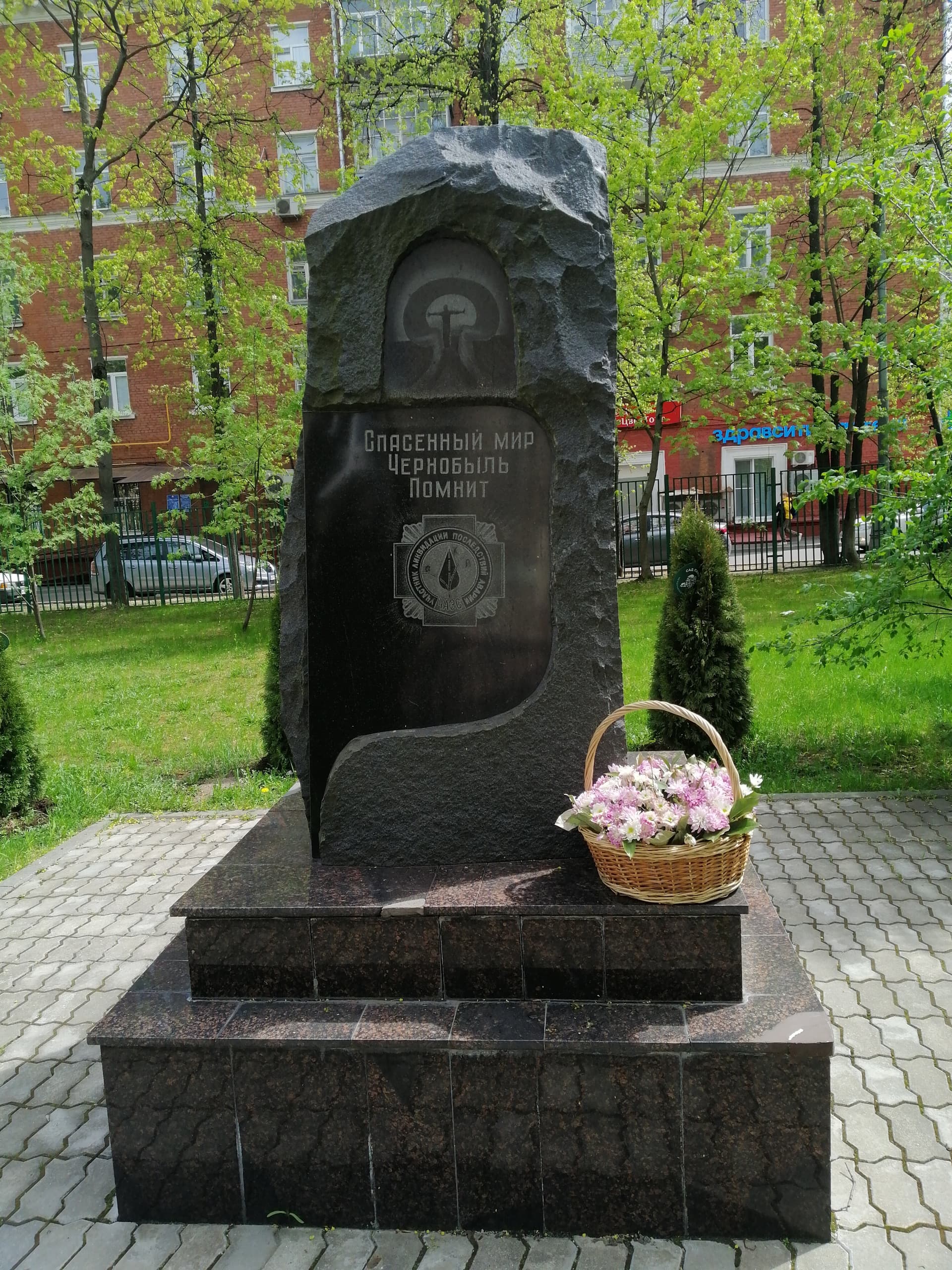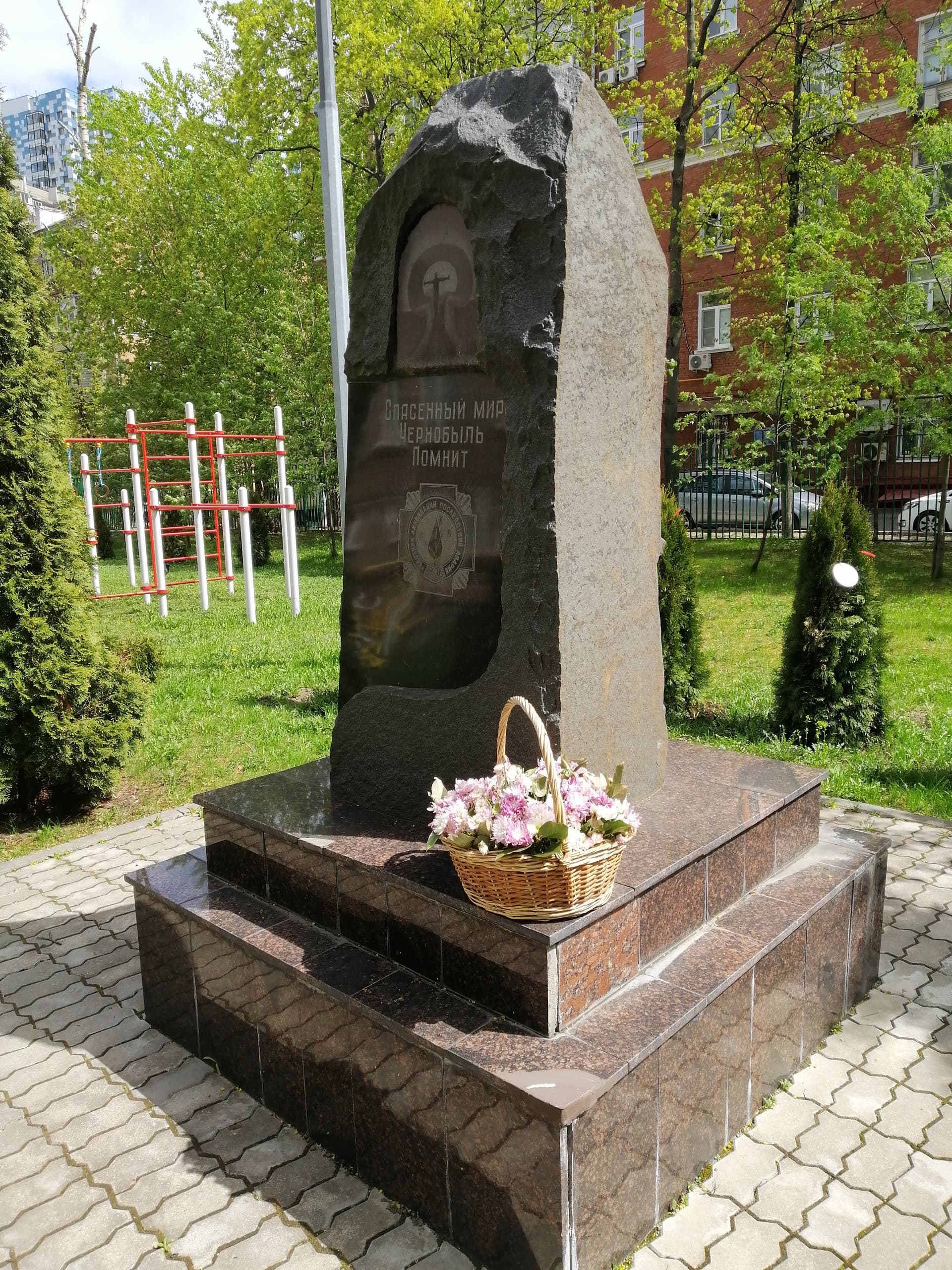 Памятный знак представляет собой блок необработанного гранита. На фасаде блока установлена гранитная плита, в верхней части которой нанесено изображение человеческой фигуры, разводящей руки в стороны, на фоне ядерного гриба. Фигура как бы заслоняет собой зрителя от взрыва. Ниже — памятная надпись: «Спасенный мир Чернобыль помнит», под ней изображение медали-креста участникам ликвидации последствий аварии на ЧАЭС.