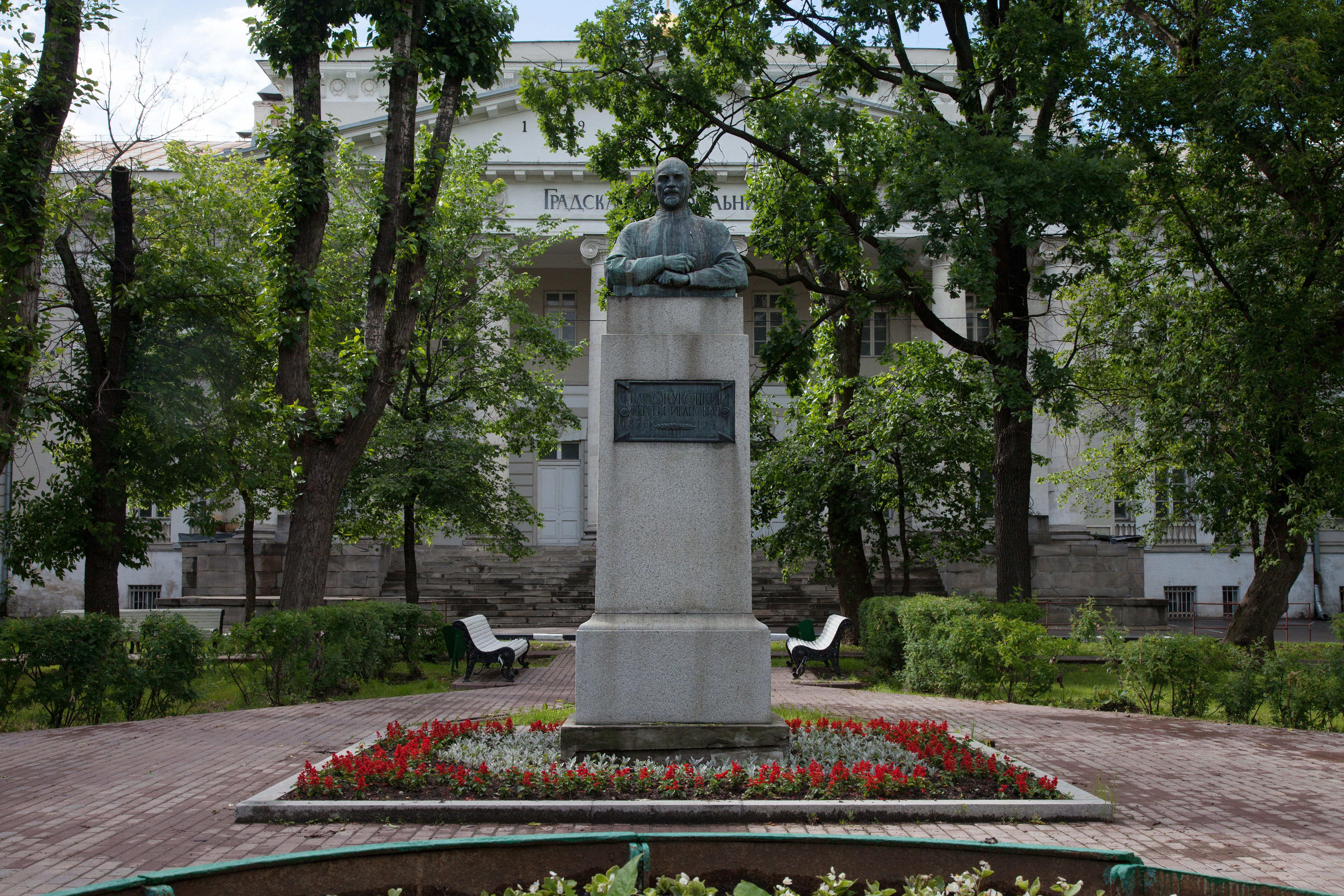 Бронзовый бюст хирурга установлен на высоком гранитном трехступенчатом постаменте. Из гранита же выполнена и памятная табличка черного цвета с указанием имени и основных дат жизни: рождения и смерти. Скульпторы запечатлели сосредоточенность и серьезность Спасокукоцкого. Одеяние, как и подобает, — хирургический халат.
