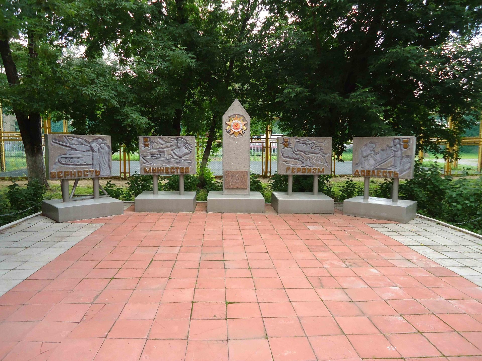Памятный знак представляет собой композицию из центральной бетонной стелы и четырех бетонных плит на металлических стойках и бетонных постаментах. На каждой стеле помещены цельнолитые надписи, окрашенные в золотой цвет: «Верность. Мужество. Героизм. Доблесть». На центральной стеле присутствует декоративный элемент из бетона и стекла — орден Великой Отечественной войны, который покрыт лакокрасочными материалами. На стеле гранитная посвятительная табличка с прорезной надписью: «Памяти павших будьте достойны».