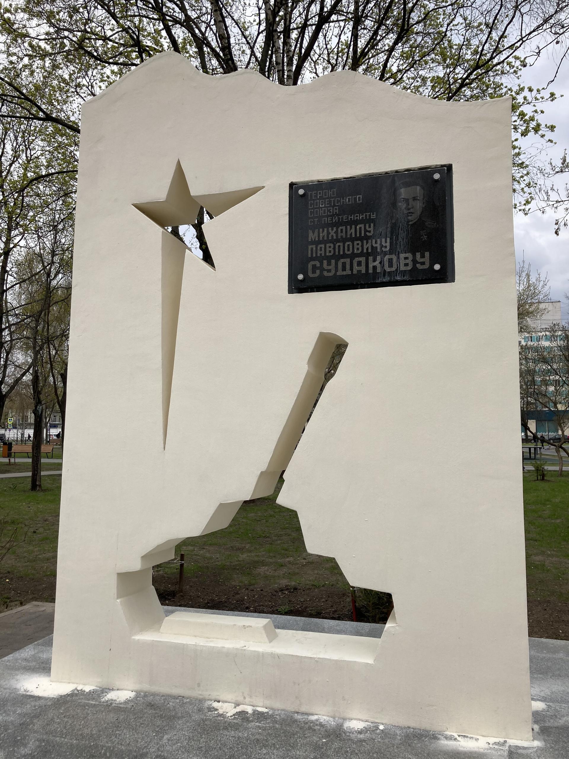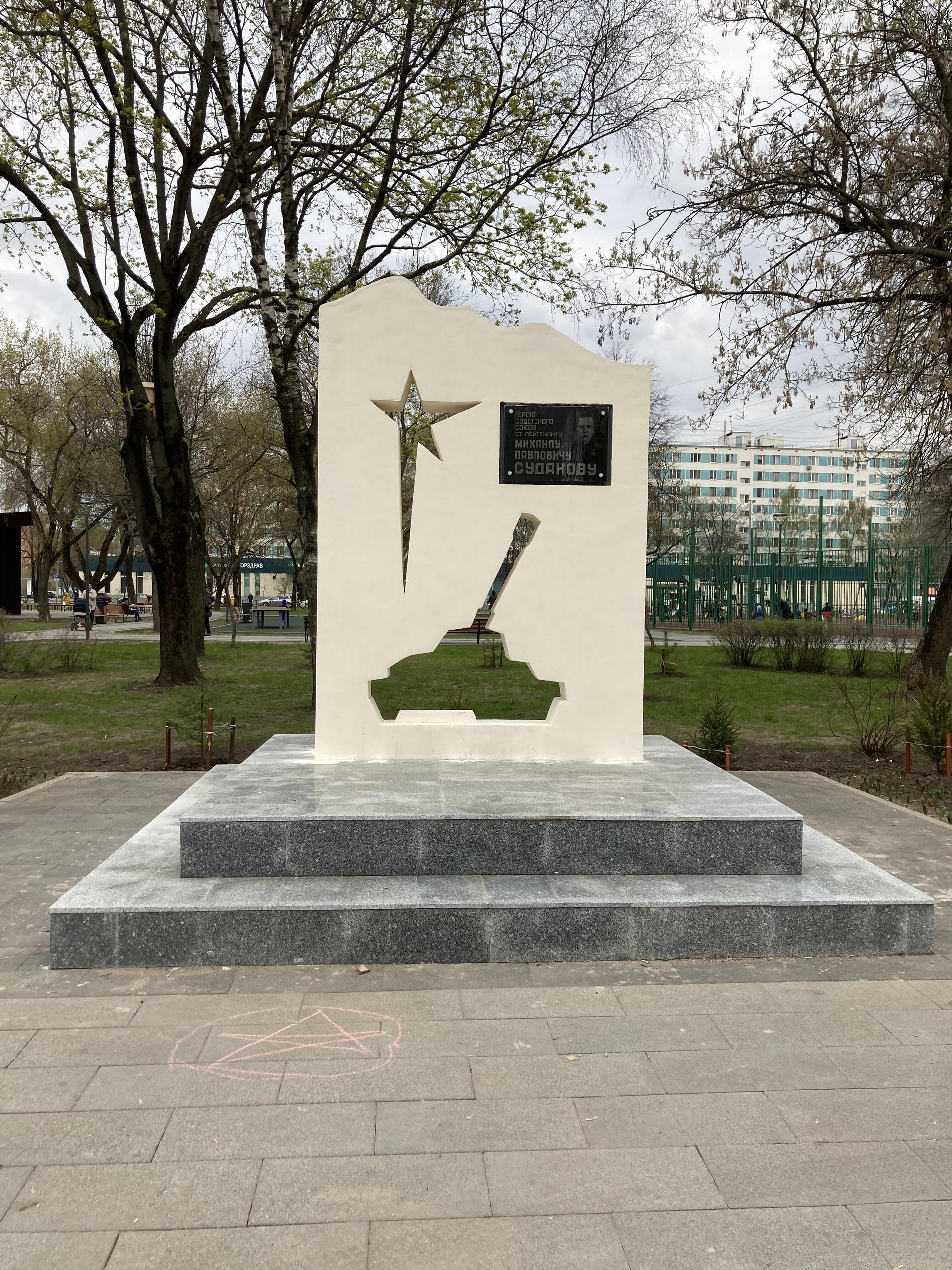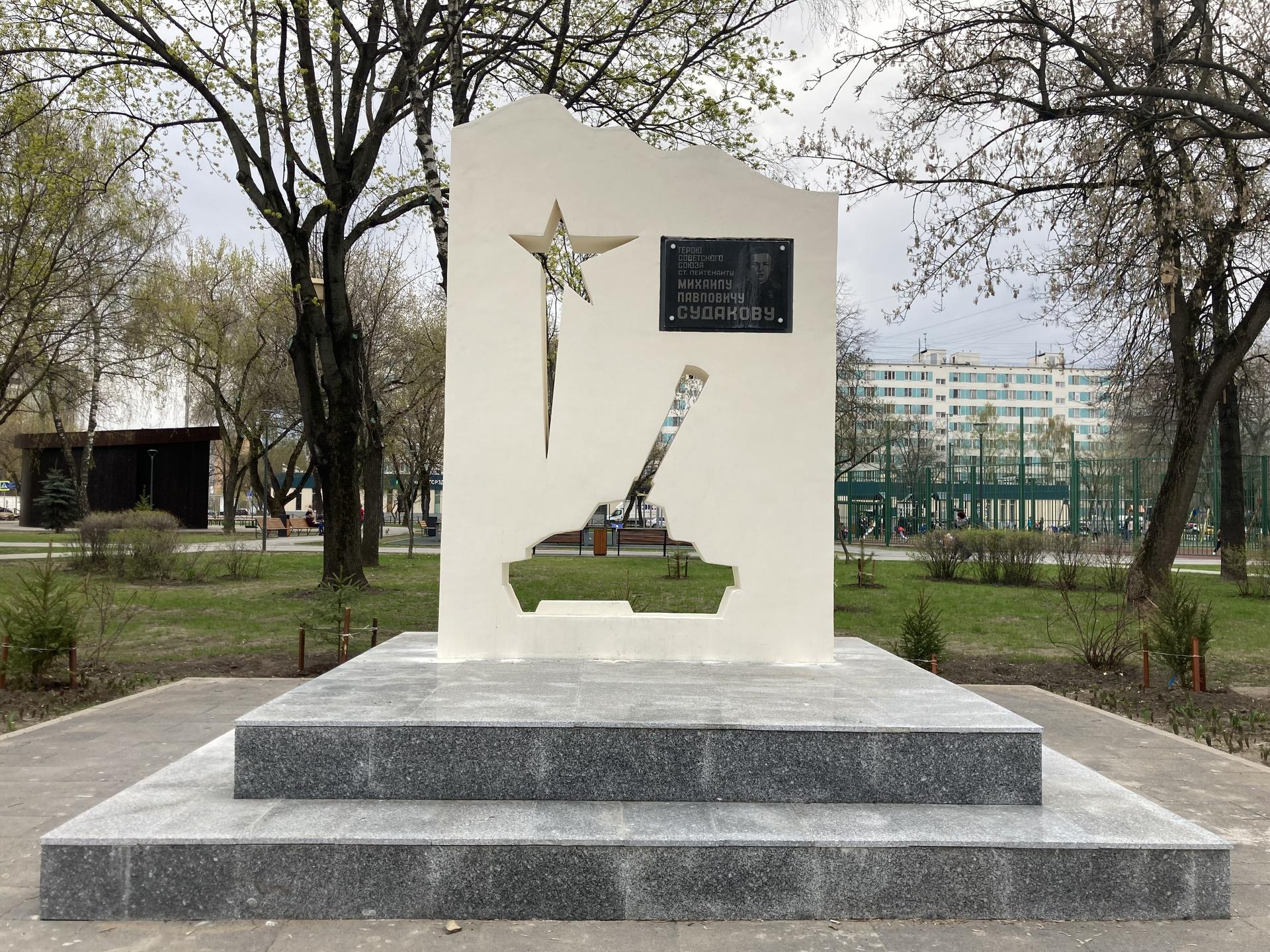 В правой части стелы укреплена мемориальная табличка из черного полированного гранита с портретом М. П. Судакова и посвятительной надписью, выполненной прорезными буквами. Ремонтные работы на объекте проводились в 2015 г.