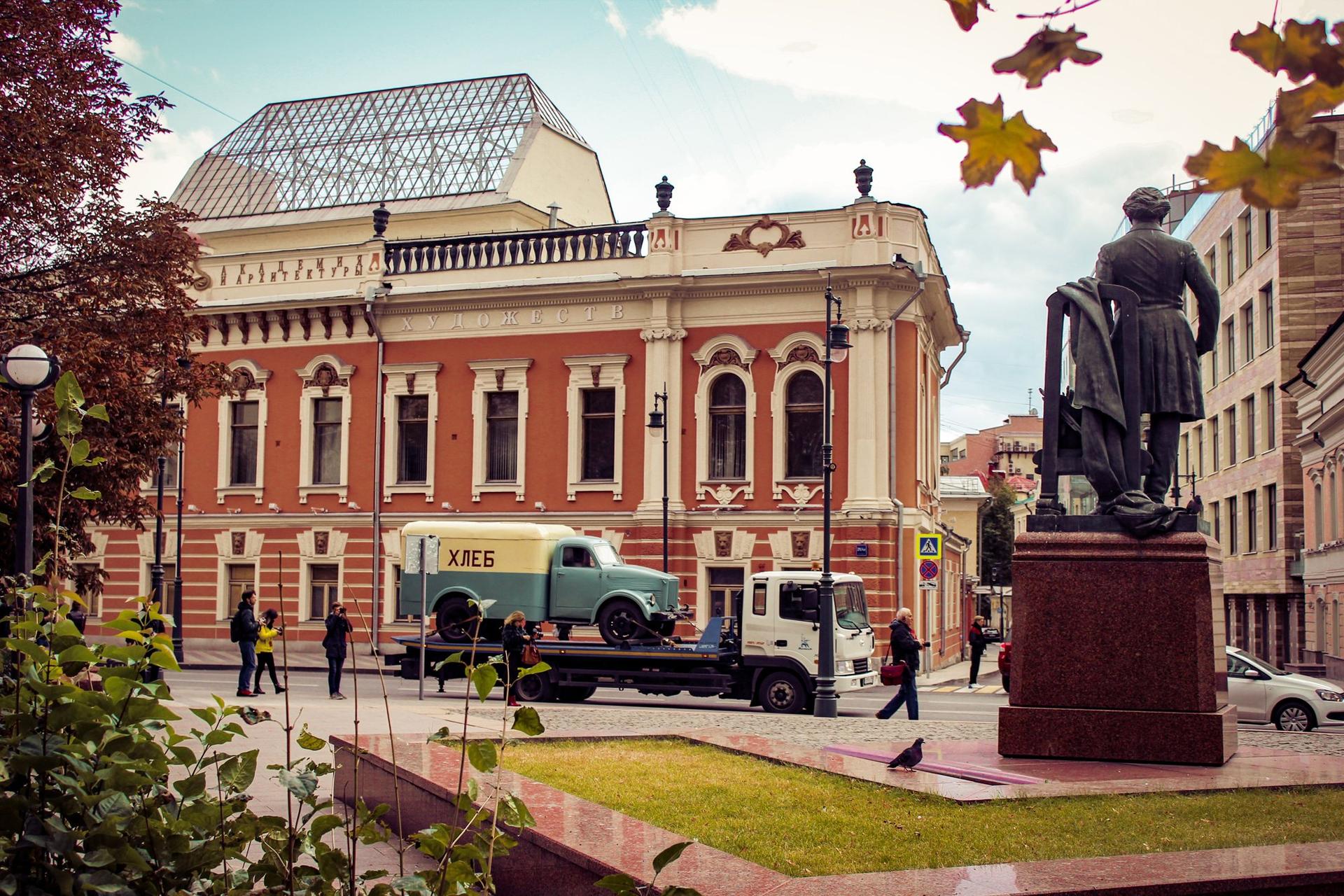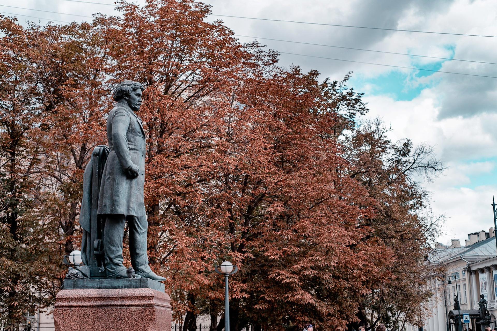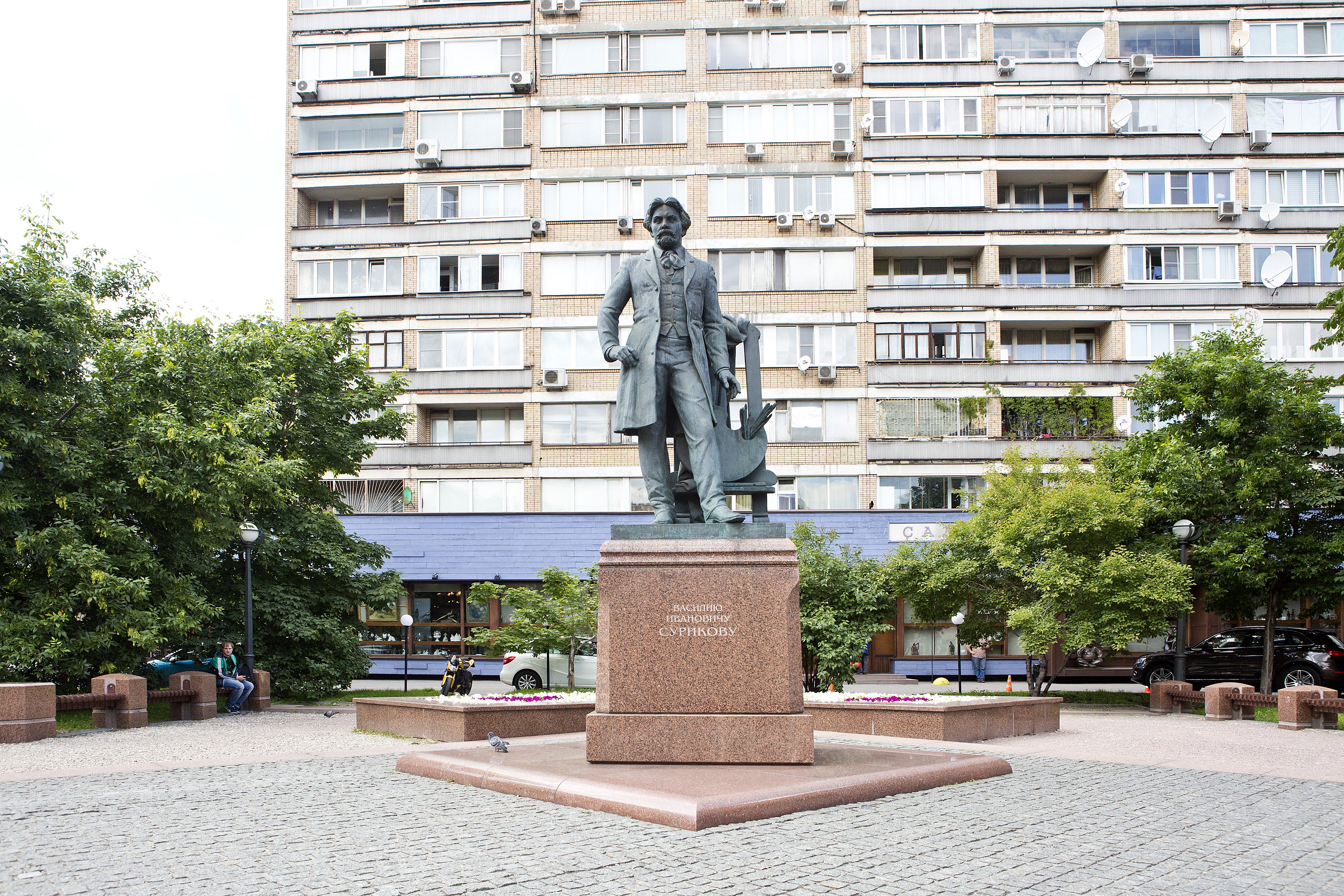 Василий Иванович Суриков (1848—1916) — русский живописец, мастер масштабных исторических полотен. Скульптура отлита из бронзы и установлена на постамент из красного гранита. Суриков представлен в полный рост, с гордой осанкой, благородными чертами лица и открытым взглядом. На постаменте размещены вечные спутники художника: мольберт, палитра, кисти.