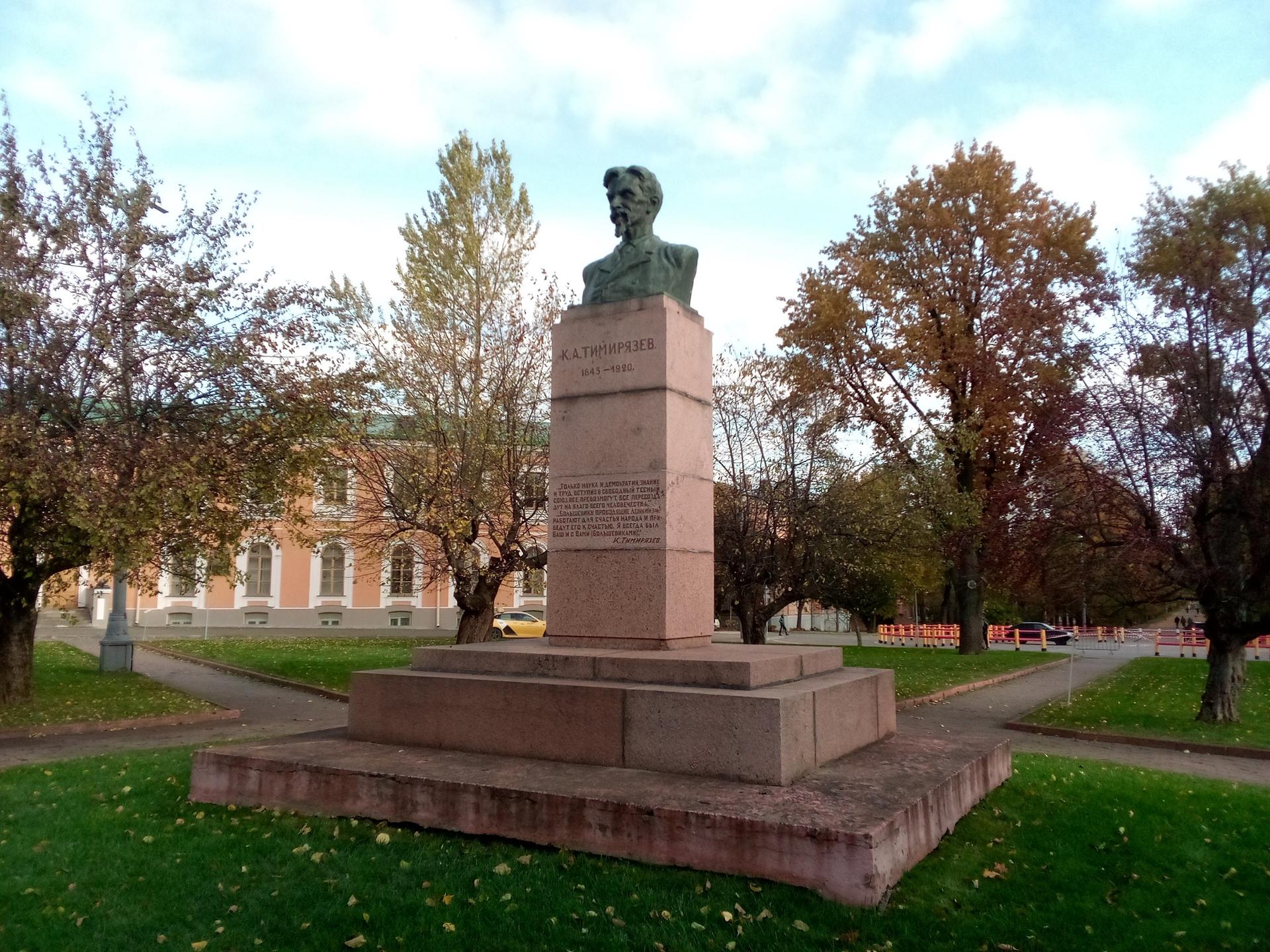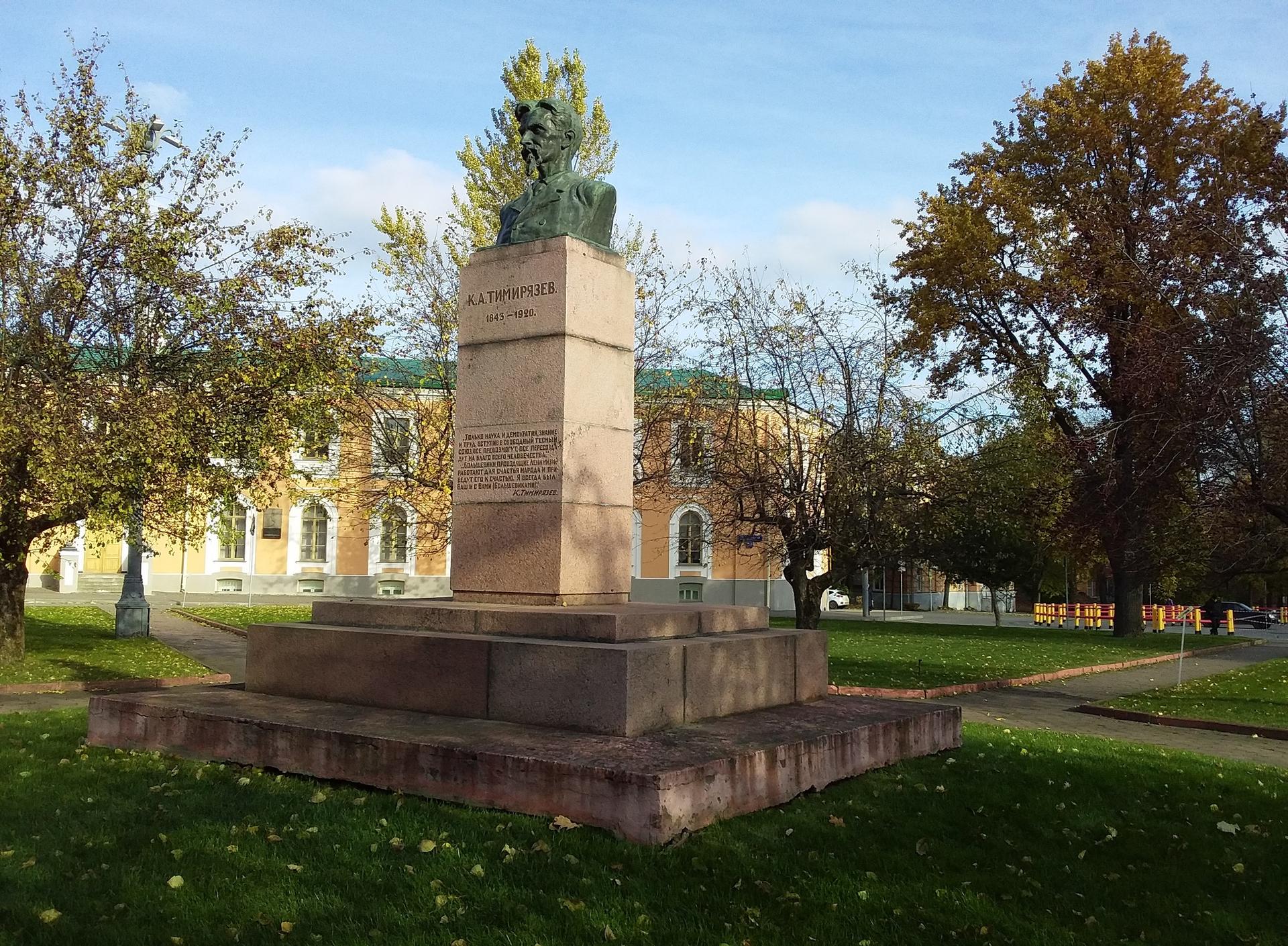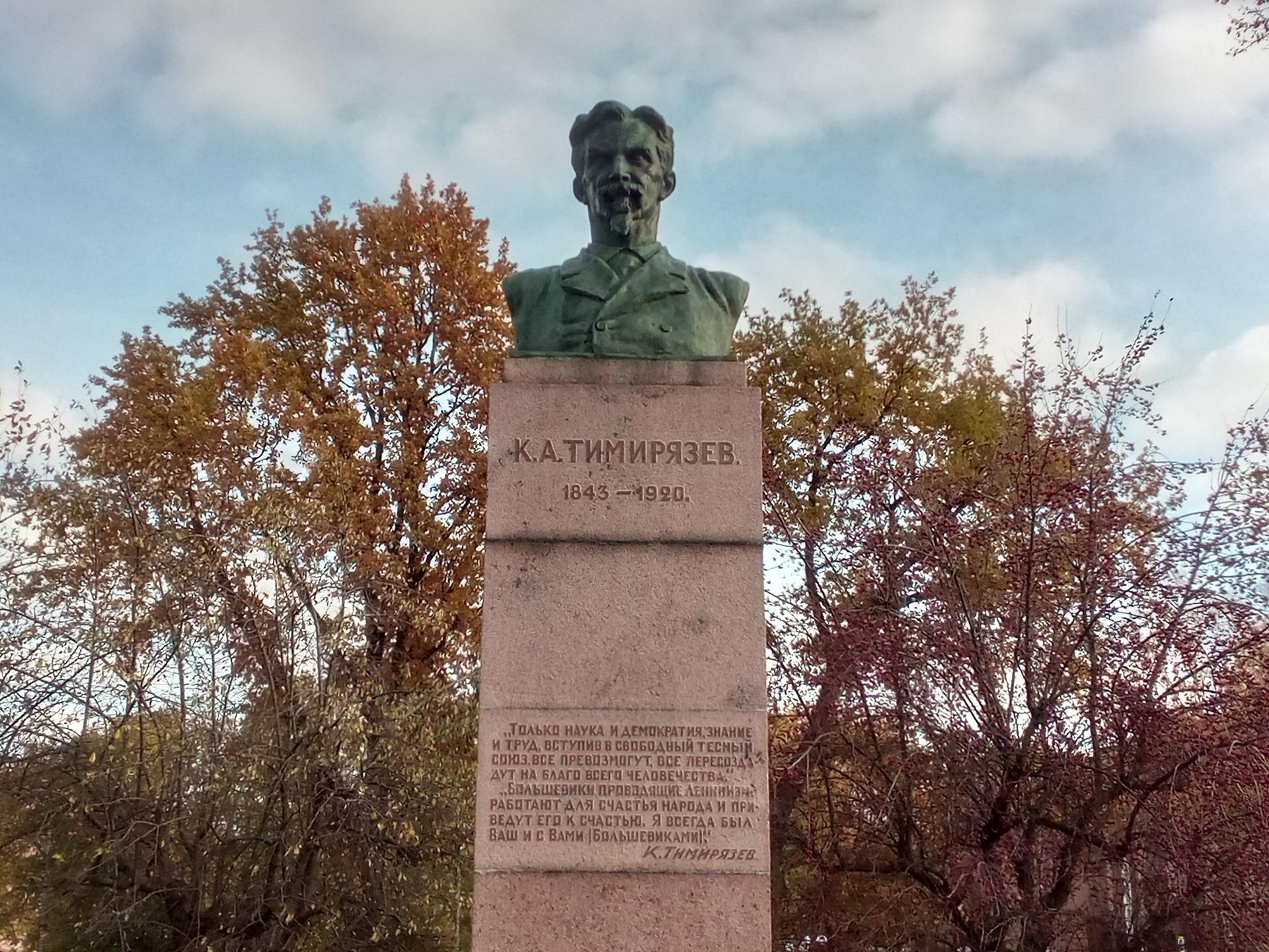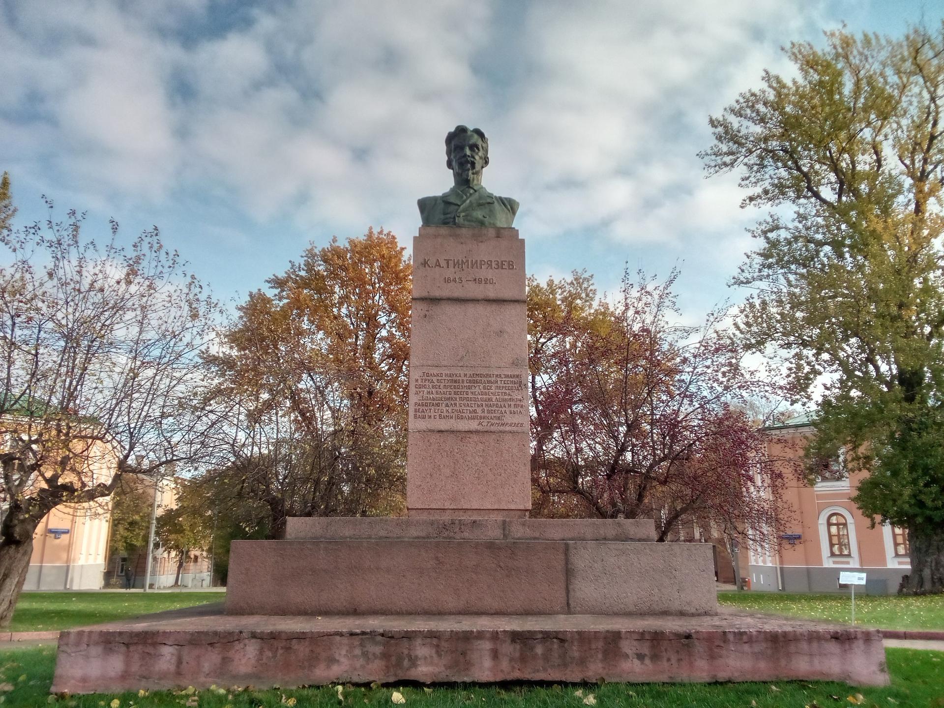 Бюст русского ученого К. А. Тимирязева выполнен из бронзы и установлен на высокий гранитный постамент, на котором выбиты цитаты из его трудов: «Только наука и демократия, знание и труд, вступив в свободный тесный союз, все превозмогут, все пересоздадут на благо всего человечества», «Большевики, проводящие ленинизм, работают для счастья народа и приведут его к счастью. Я всегда был ваш и с вами (большевиками). К. А. Тимирязев».
