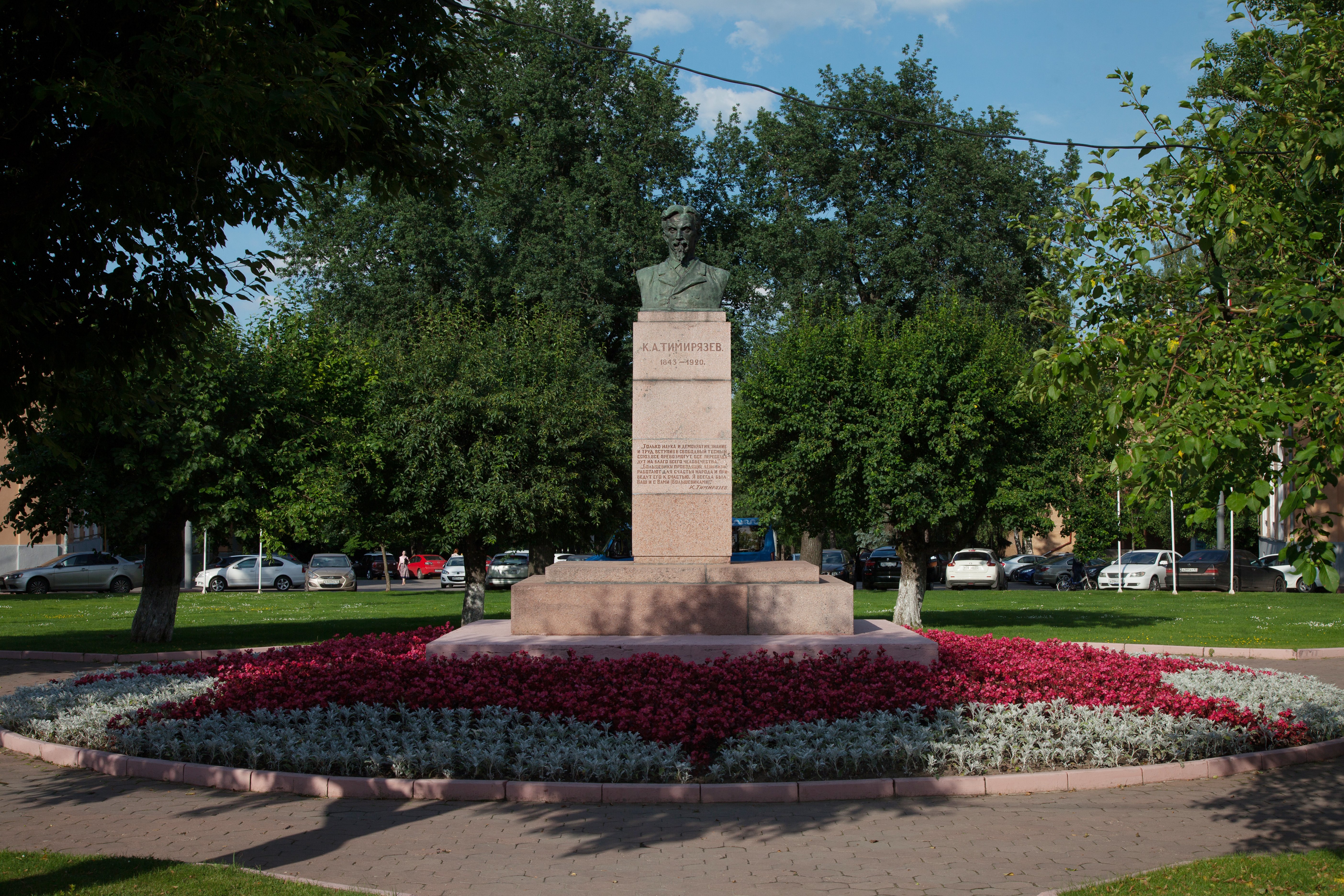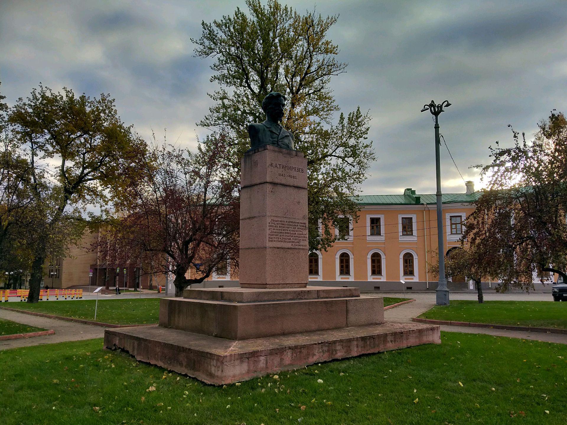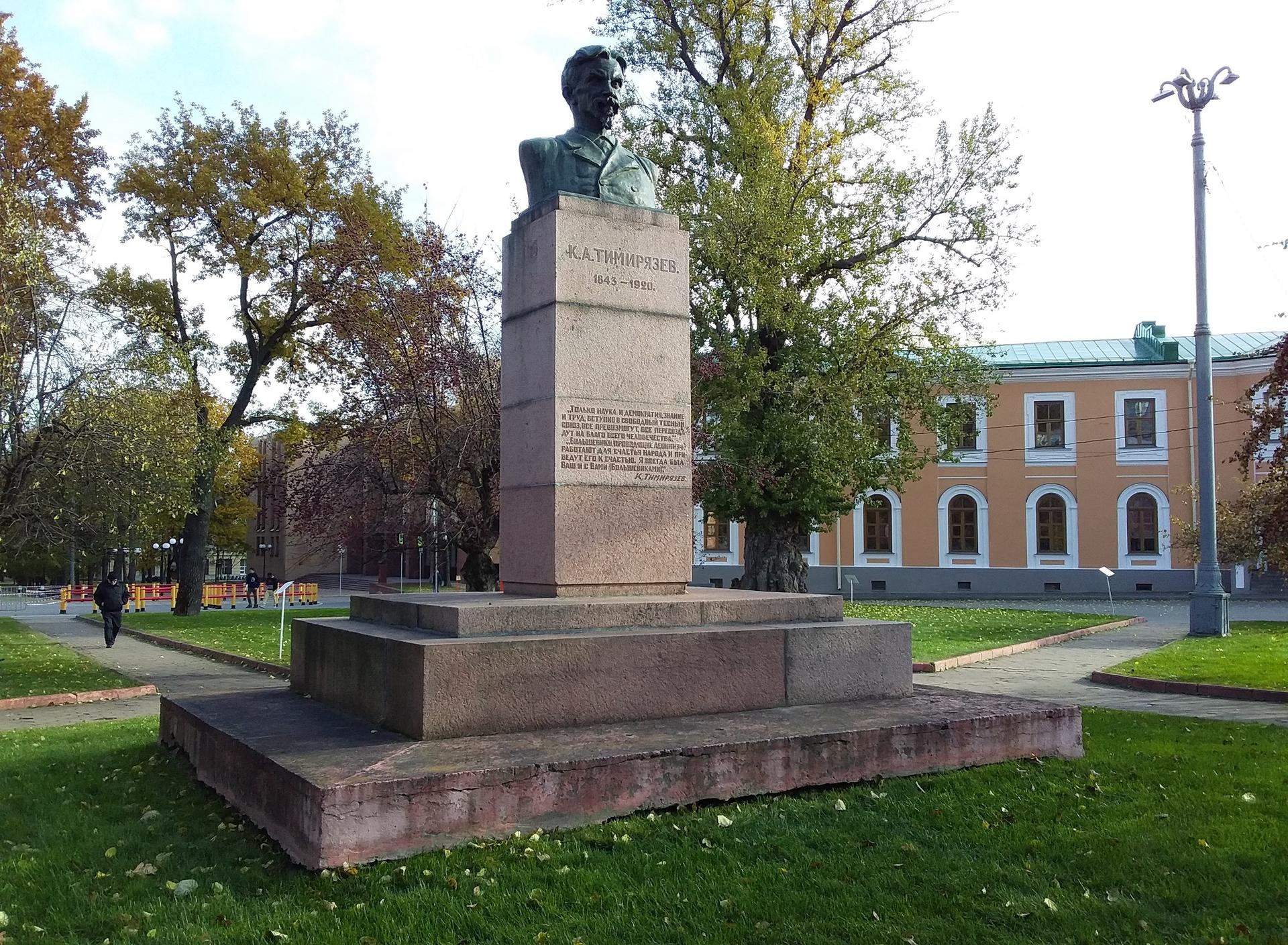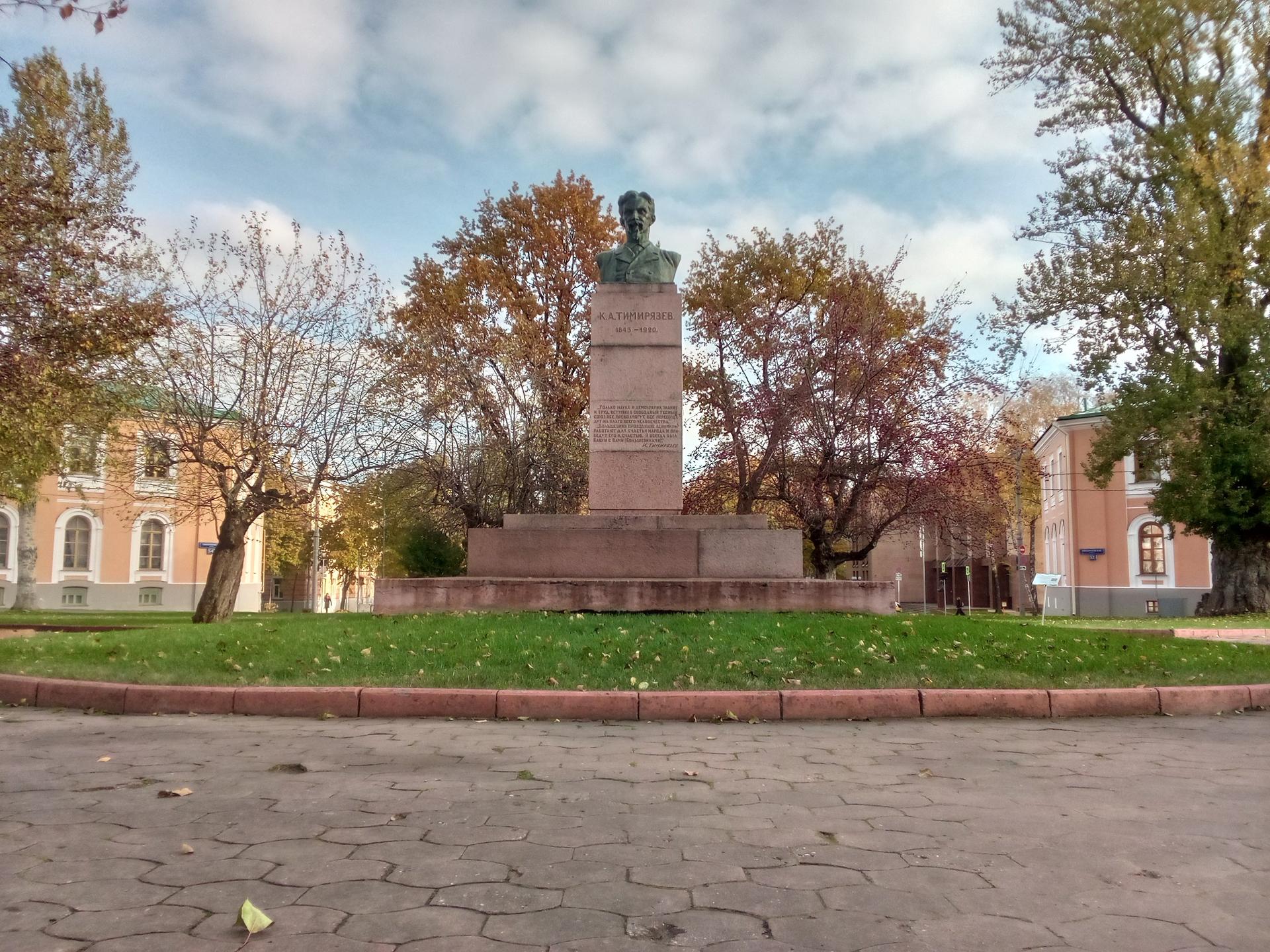 Бюст русского ученого К. А. Тимирязева выполнен из бронзы и установлен на высокий гранитный постамент, на котором выбиты цитаты из его трудов: «Только наука и демократия, знание и труд, вступив в свободный тесный союз, все превозмогут, все пересоздадут на благо всего человечества», «Большевики, проводящие ленинизм, работают для счастья народа и приведут его к счастью. Я всегда был ваш и с вами (большевиками). К. А. Тимирязев».