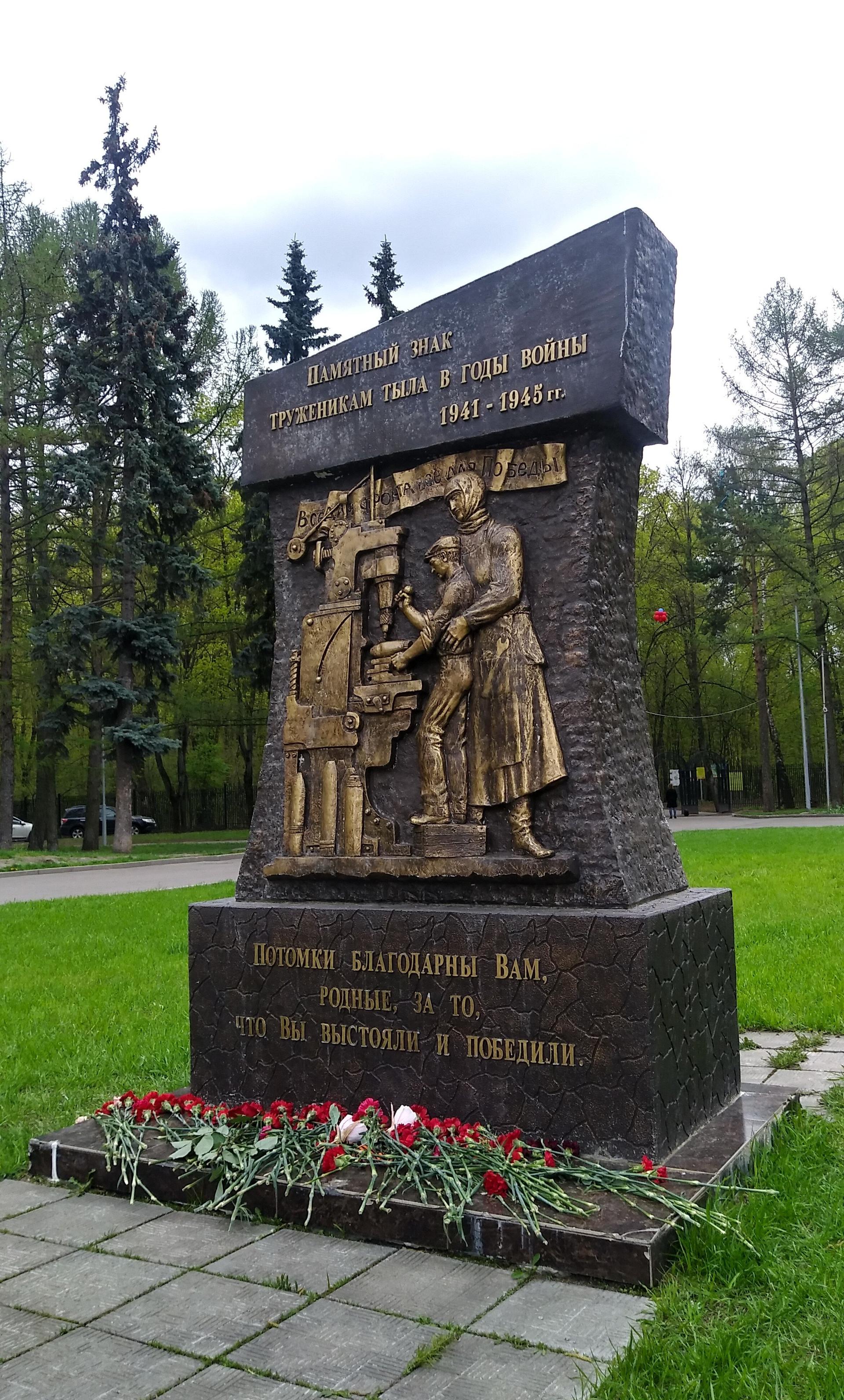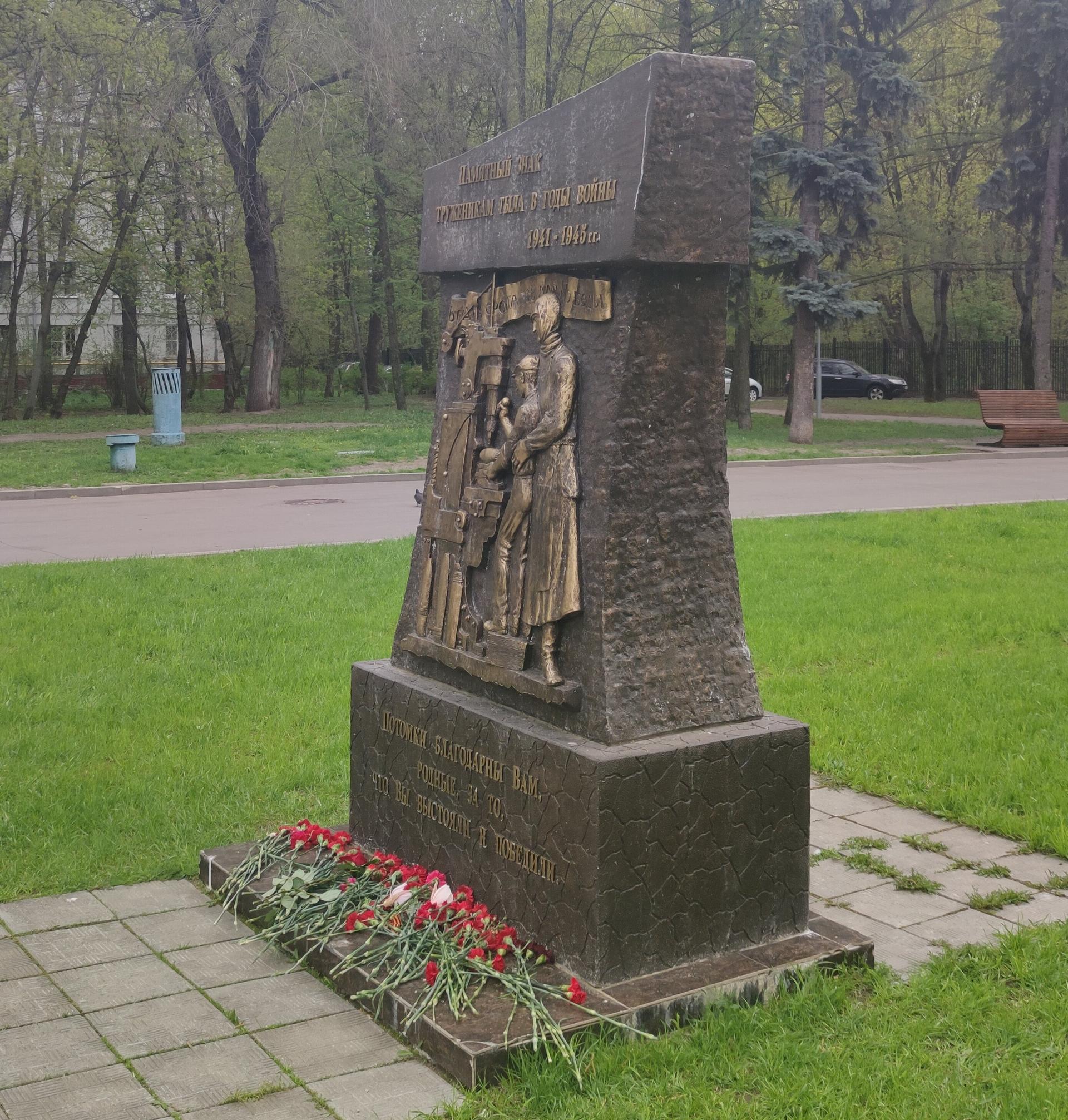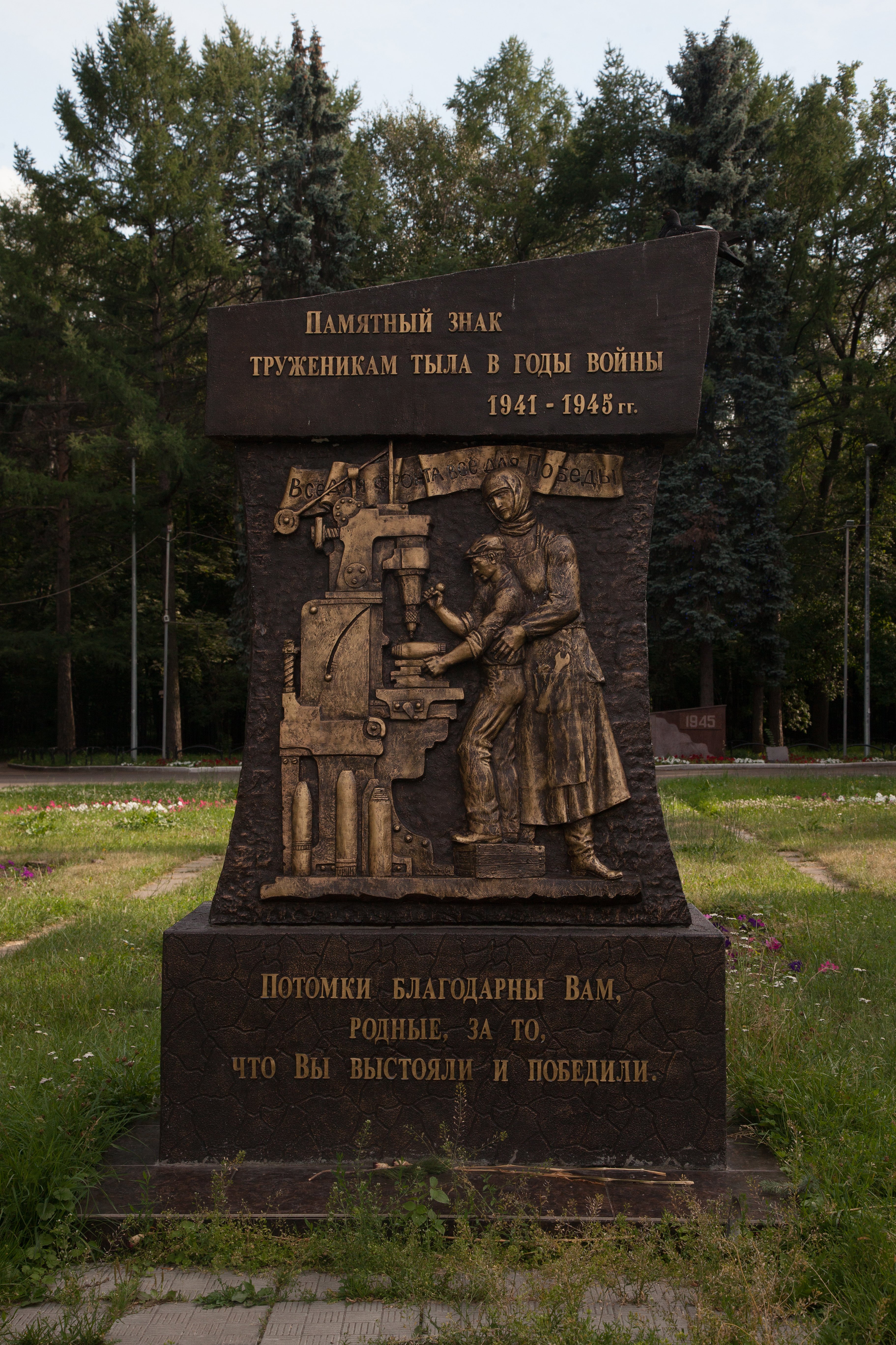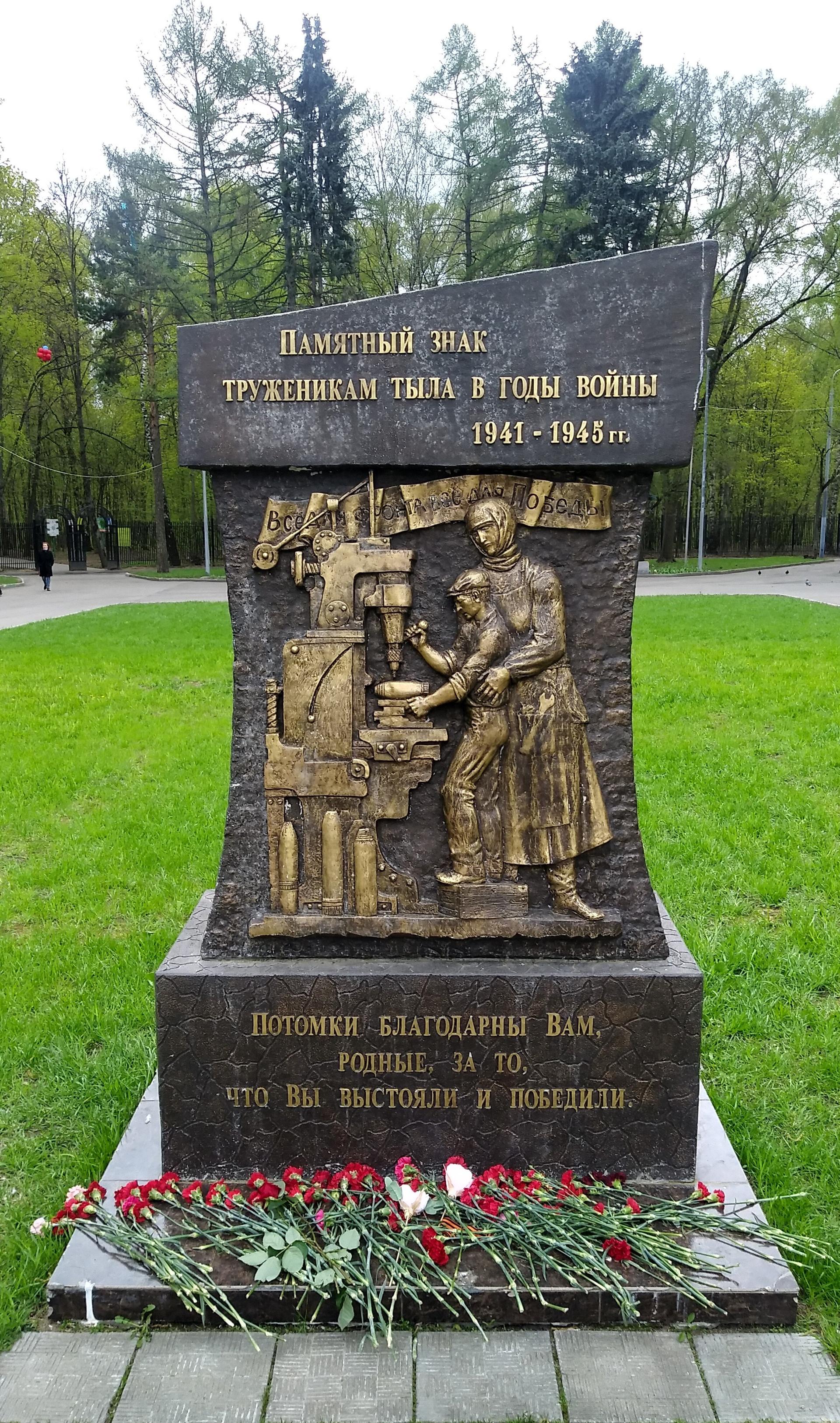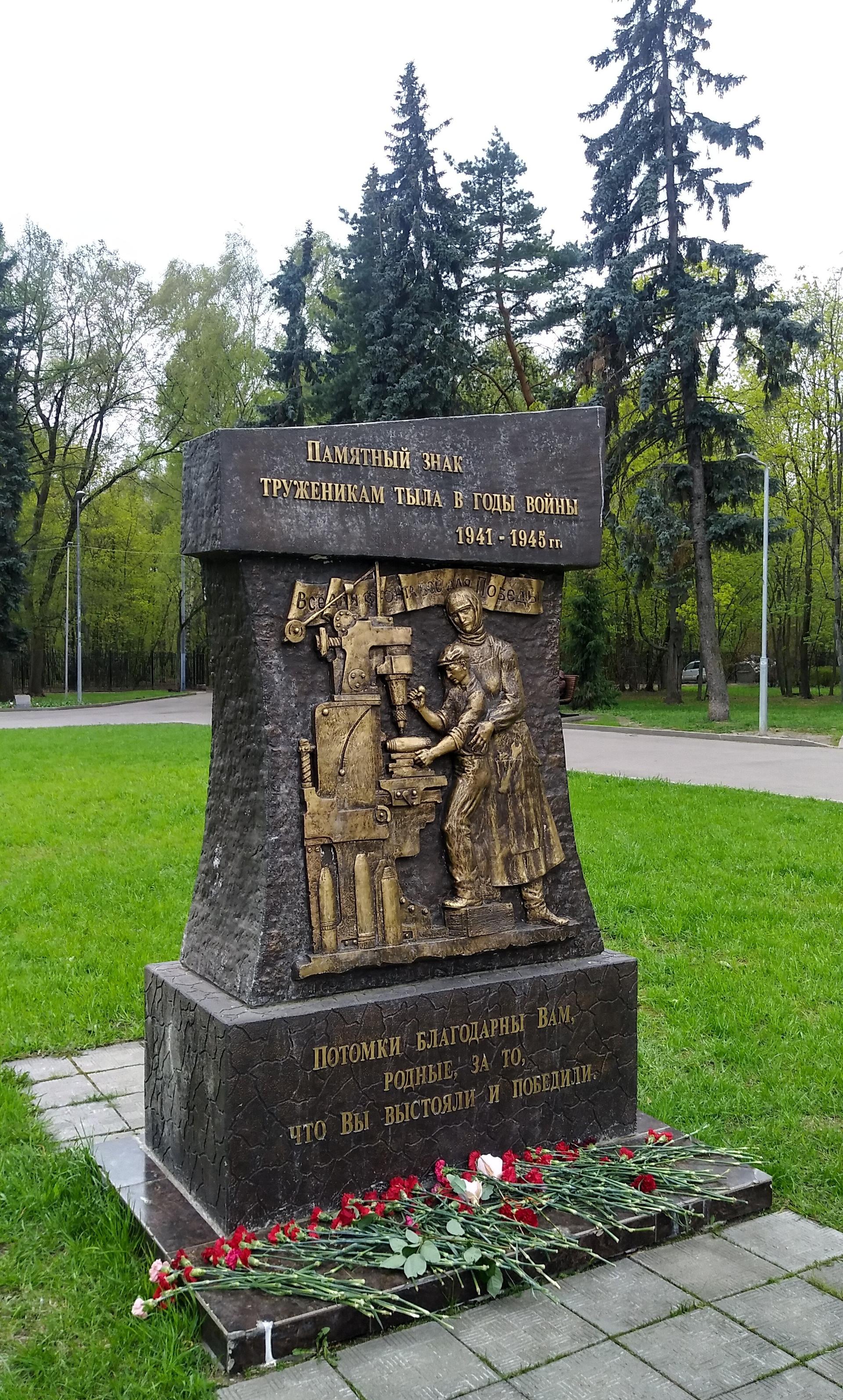 Памятный знак представляет собой бетонную стелу сложной формы с барельефом, изображающим тружеников тыла — женщину и ребенка за станком. Над фигурами размещена лента с надписью рельефными буквами: «Все для фронта, все для победы».