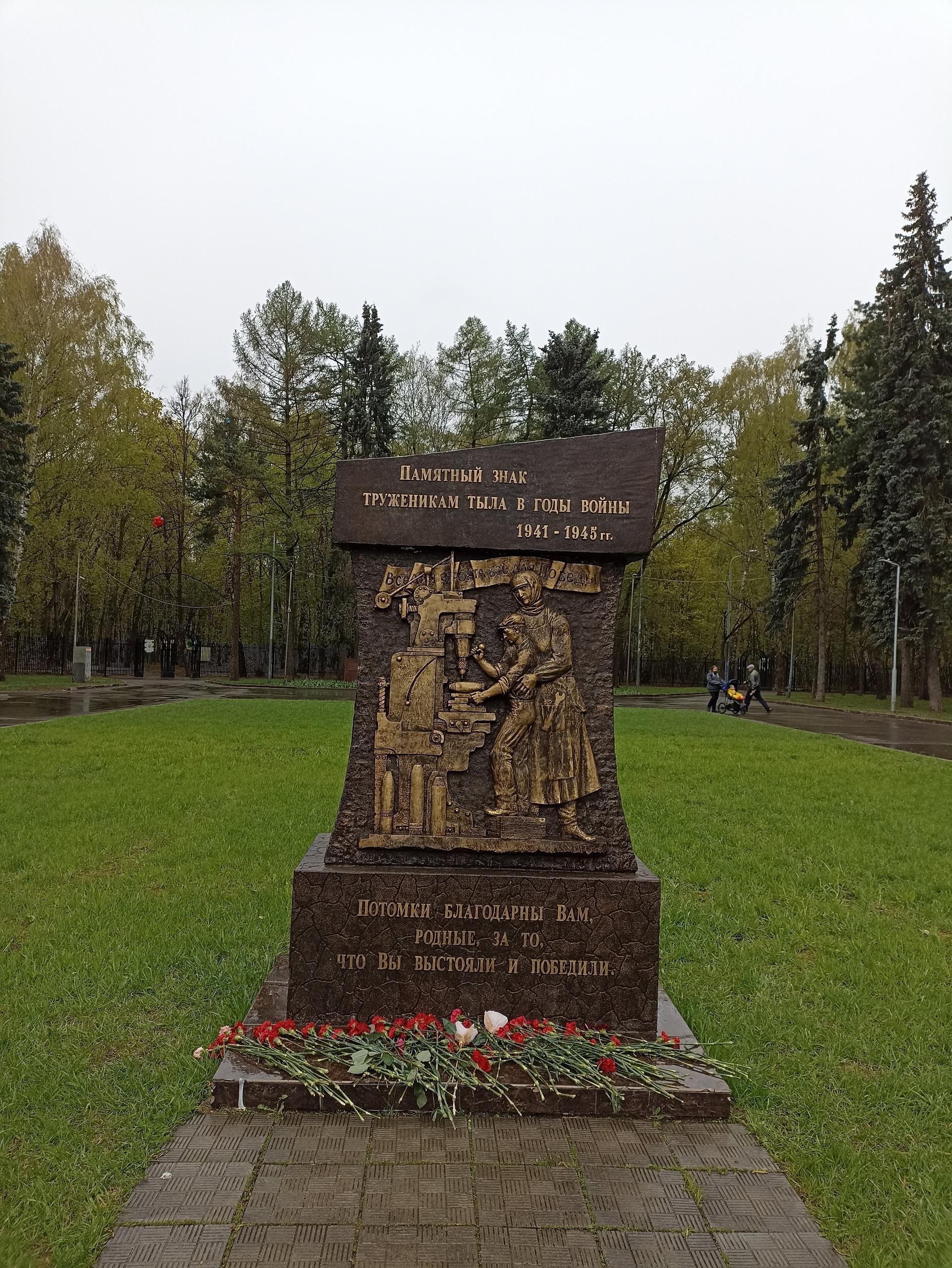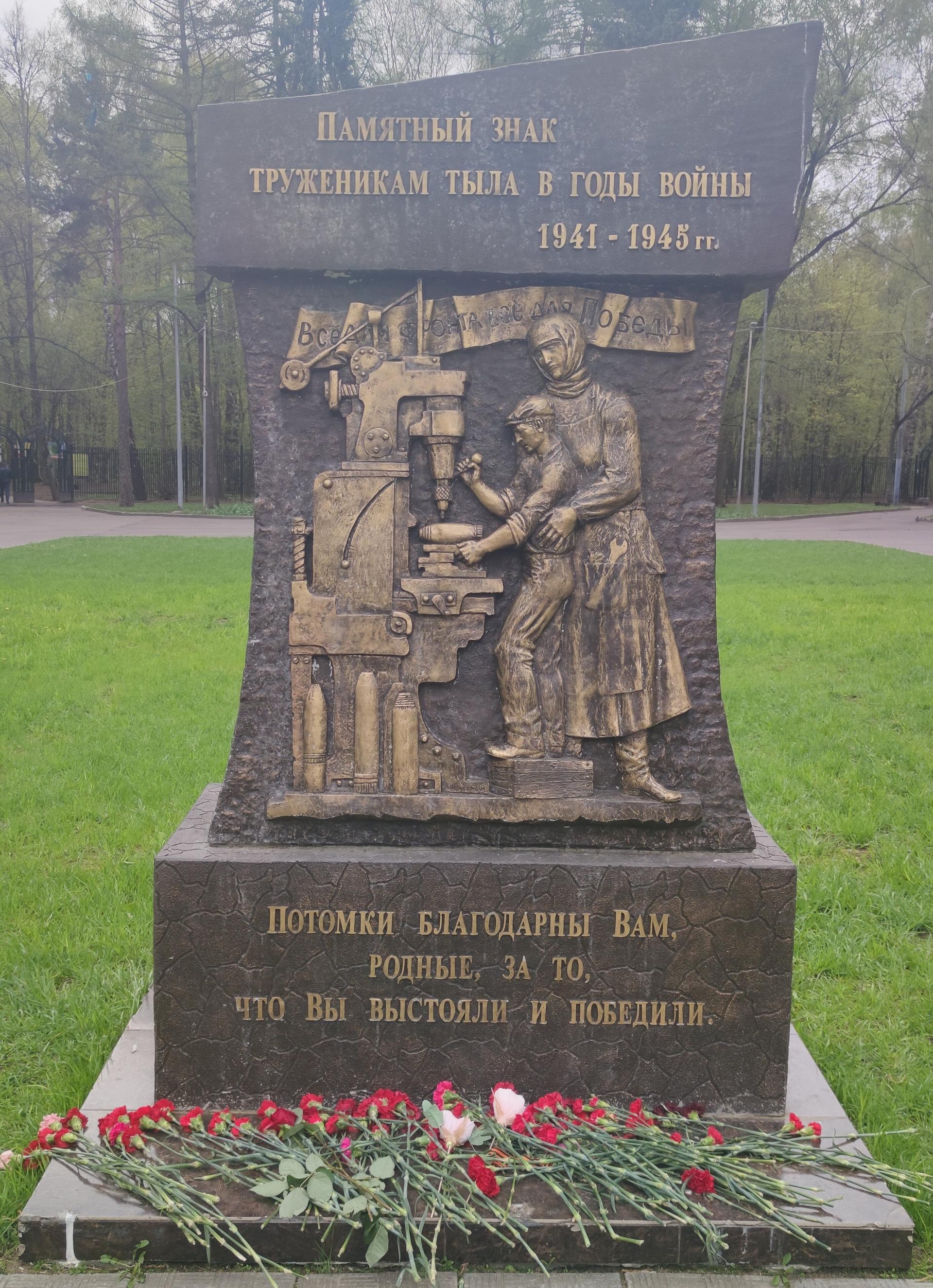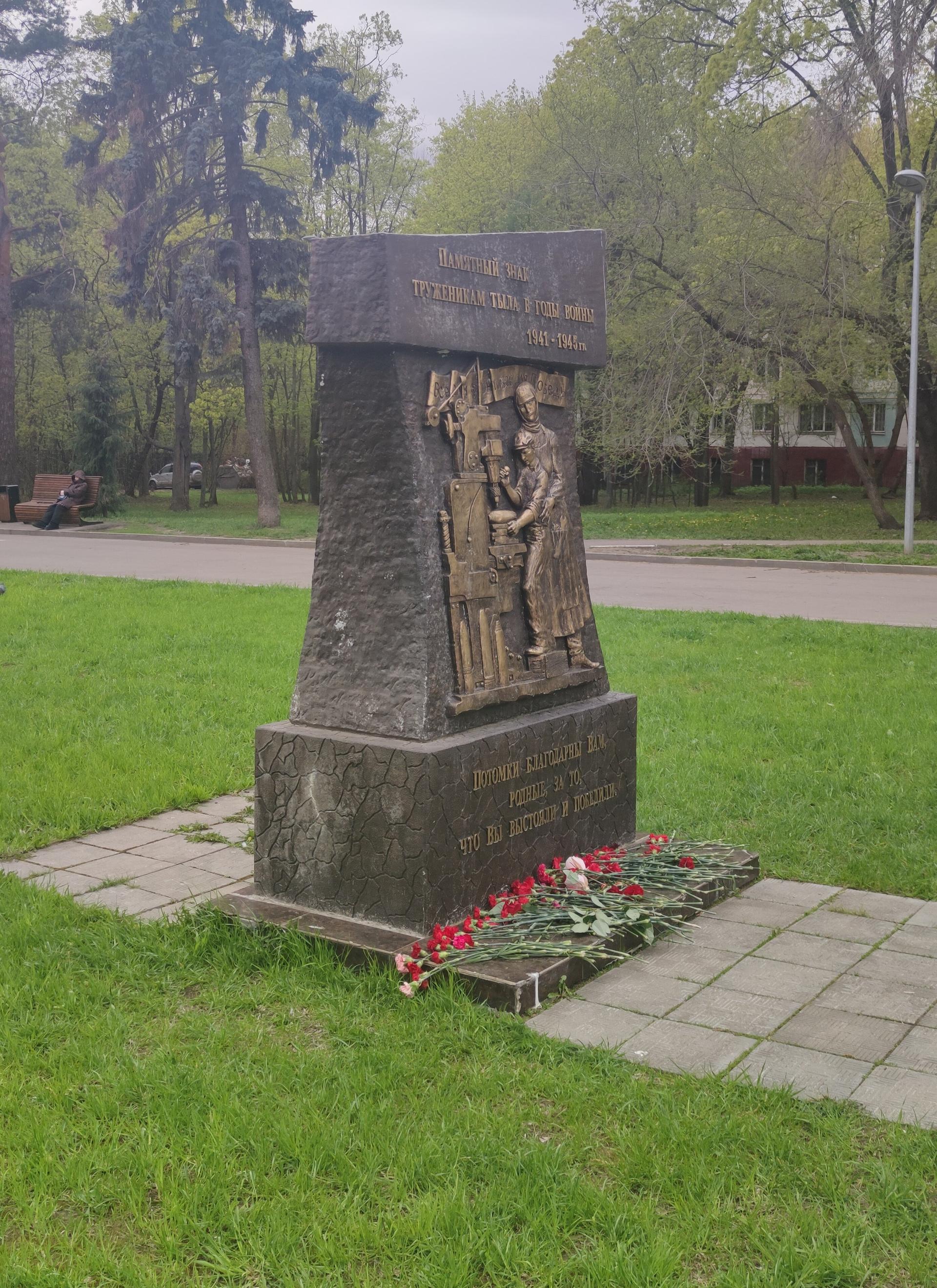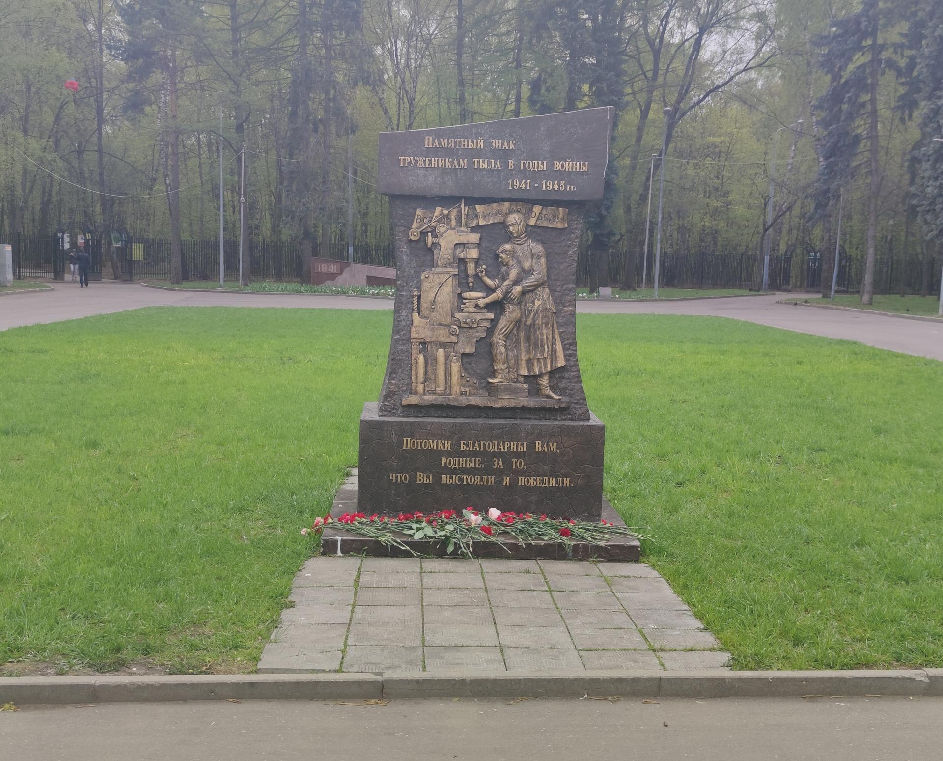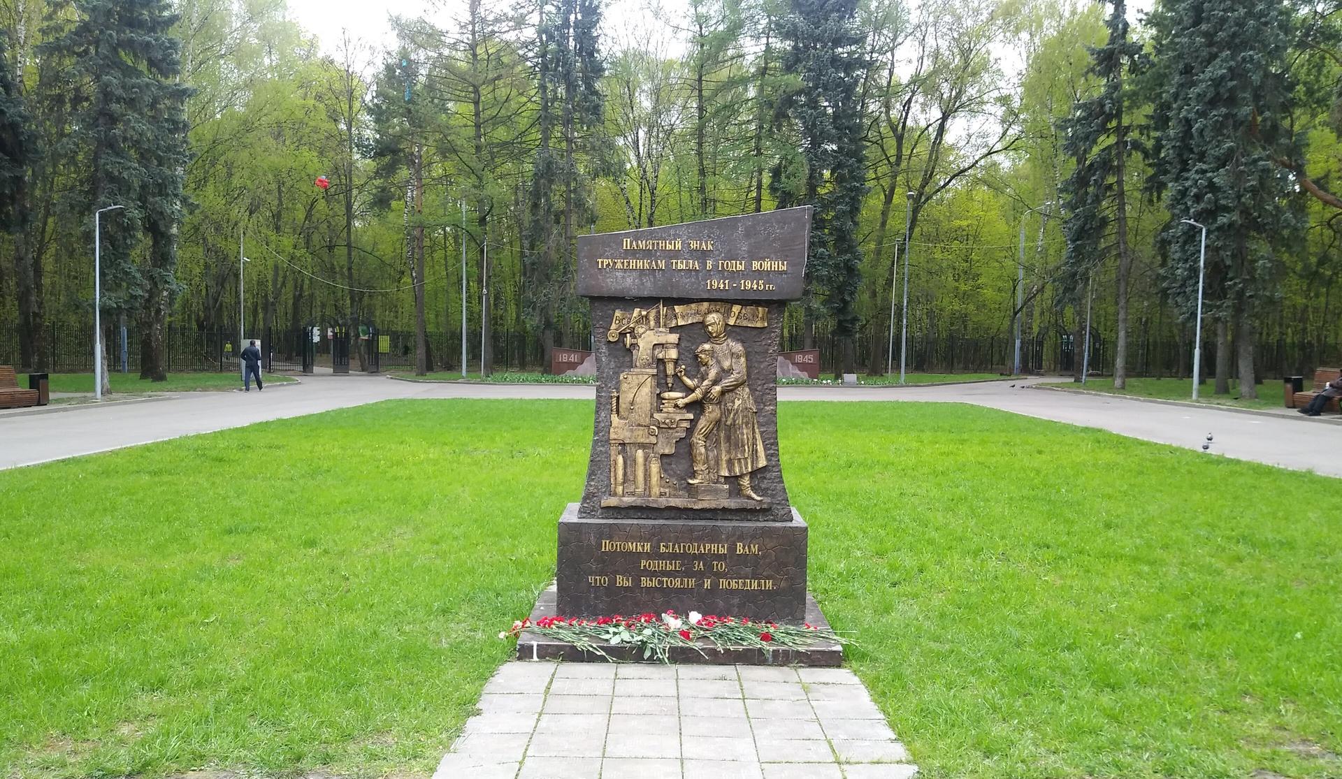 Памятный знак представляет собой бетонную стелу сложной формы с барельефом, изображающим тружеников тыла — женщину и ребенка за станком. Над фигурами размещена лента с надписью рельефными буквами: «Все для фронта, все для победы».