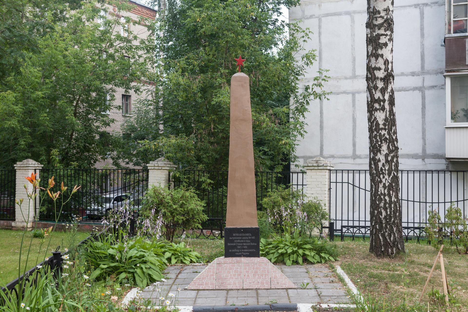 Обелиск увенчан металлической звездой и установлен на базе, облицованной керамической плиткой. На северо-западном фасаде имеется гранитная памятная доска с посвятительной надписью: «Вечная память выпускникам школы 440, погибшим в годы Великой Отечественной войны 1941-1945 гг. за свободу и независимость нашей Родины».