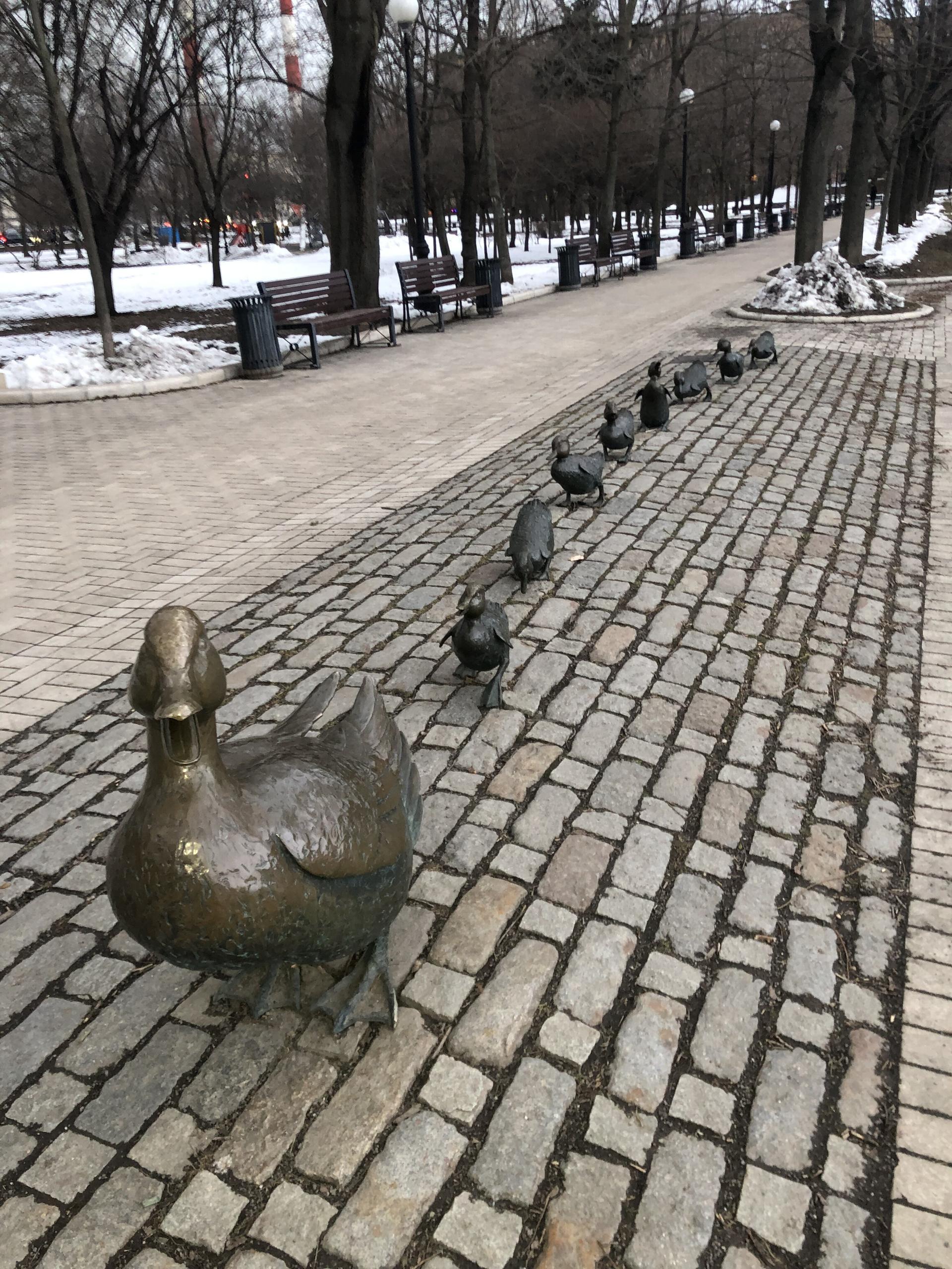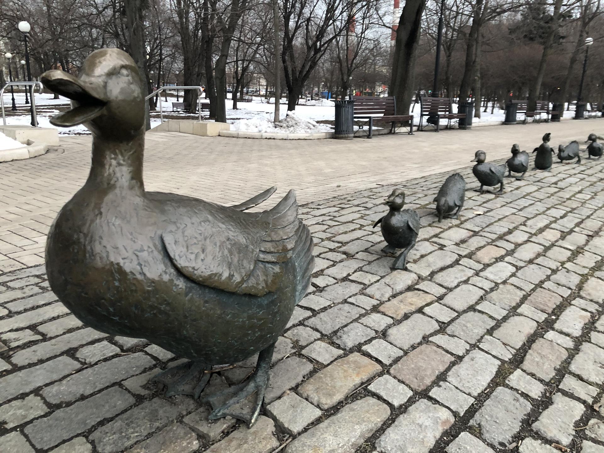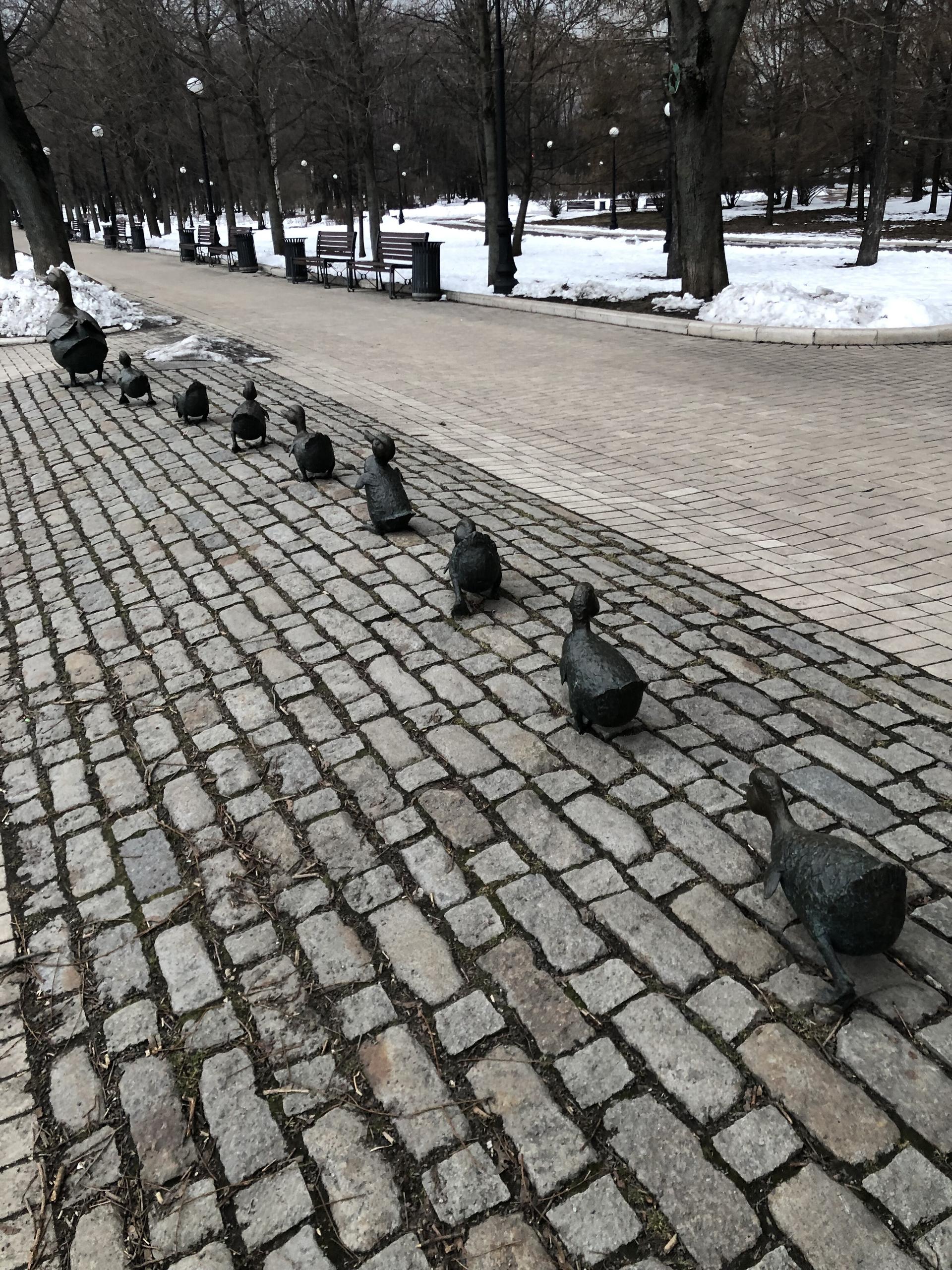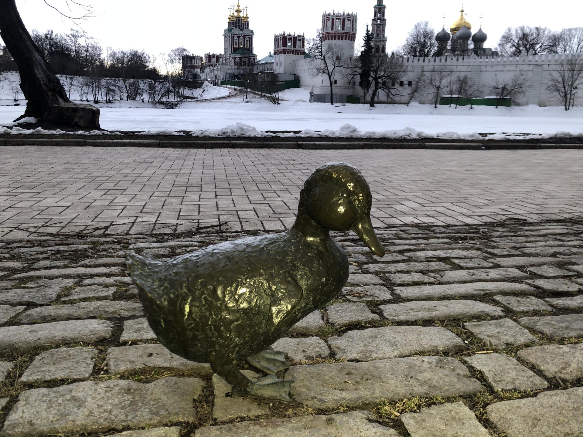 Это точная копия скульптуры в Центральном парке Бостона: цепочка из восьмерых утят, идущих за уткой-мамой. В том же году скульптуру установили в сквере Новодевичьего монастыря. Но буквально на следующую ночь одного из утят украли. В начале 2000 года пропали еще три фигуры. Сотрудники милиции считали, что на уток покусились охотники за цветными металлами, так как они были выполнены из первоклассной бронзы. Наши соотечественники, а также проживающая в Москве американская общественность, были шокированы этим вандализмом. И некоторые ведущие американские компании решили восстановить скульптурную композицию. На торжественной церемонии "воссоединения утиного семейства" присутствовали сама скульптор Нэнси Шен, а также Михаил Горбачев, министр культуры Михаил Швыдкой, посол США Джеймс Коллинз. Местное управление внутренних дел в районе Новодевичьего монастыря обещало усилить охрану уток, поскольку бронза - очень дорогой материал, и наверняка найдутся желающие умыкнуть сказочных героев. Кстати, общий вес скульптурной композиции составляет пятнадцать тонн. Только одна мама-утка весит 1000 килограммов.