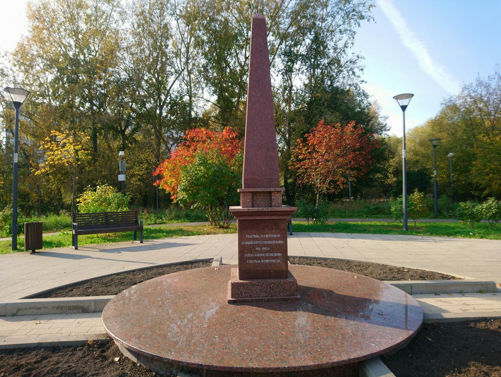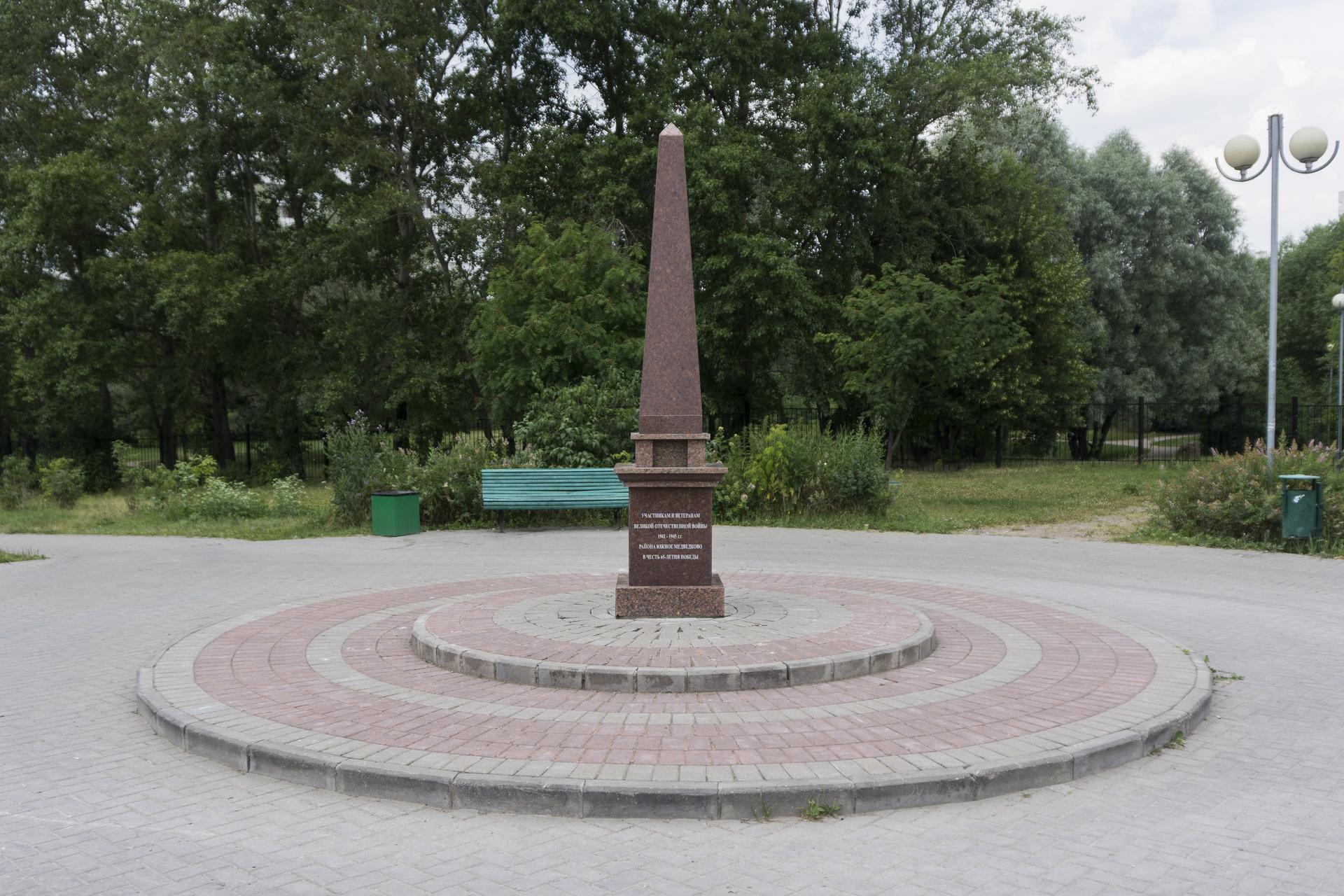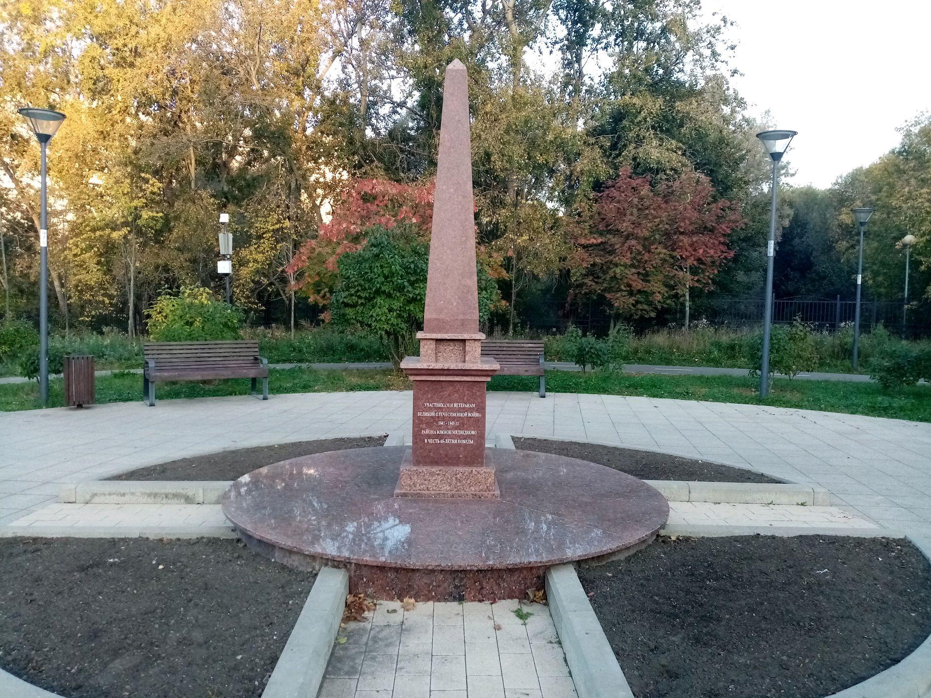 Памятник «В честь 65-летия Победы в Великой Отечественной войне» установлен в мае 2010 г. на территории Певческого поля. Представляет собой обелиск из плит полированного гранита. На одной из его сторон вырезана надпись: «Участникам и ветеранам Великой Отечественной войны 1941-1945 гг. Южного Медведкова в честь 65-летия Победы», на другой — «Помнит мир спасенный, мир вечный, мир живой...».